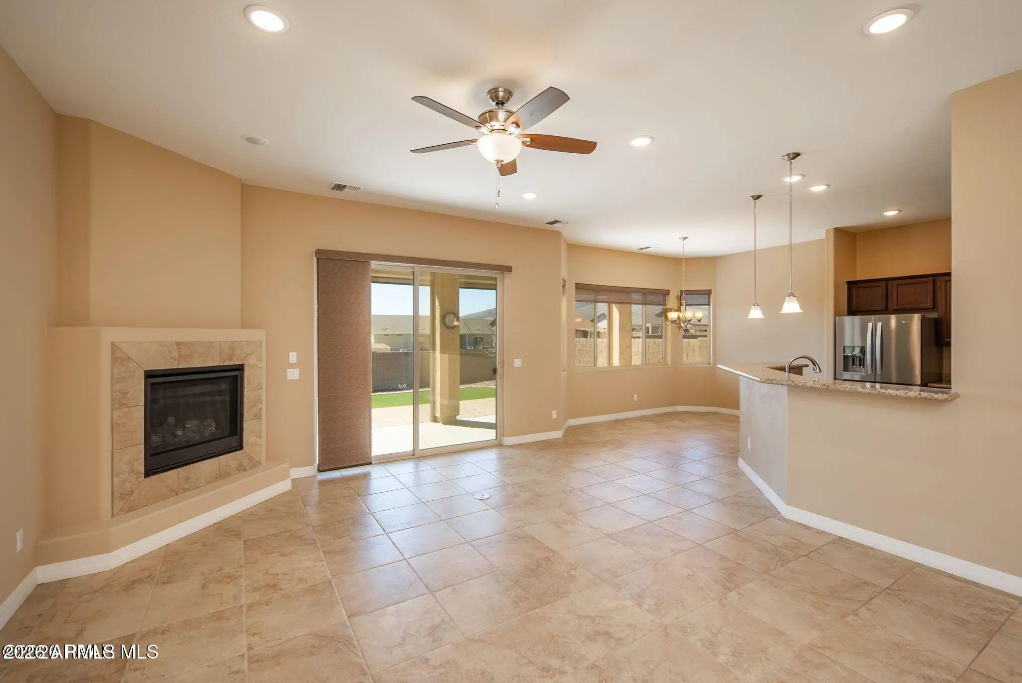THE PERFECT LOCATION ON A PREMIUM LOT! This beautiful 3 bed, 2 bath home offers an open floor plan with tile flooring, warm granite countertops, 9+ ft ceilings, and newer stainless steel appliances. Large double-pane windows fill the home with natural light, while upgraded electric solar shades help keep it cool in summer. The spacious primary suite includes room for a sitting area, plus an ensuite bath with double vanity and walk-in shower. The secondary bedrooms are generously sized for guests or family. A .19-acre lot backs to open space, providing privacy and scenic views from the covered patio. The extended 2.5-car garage fits long-bed trucks and offers extra storage or workspace. Enjoy easy access to Granville's Spur Cross Clubhouse with a pool, gym, and more just a short walk away!