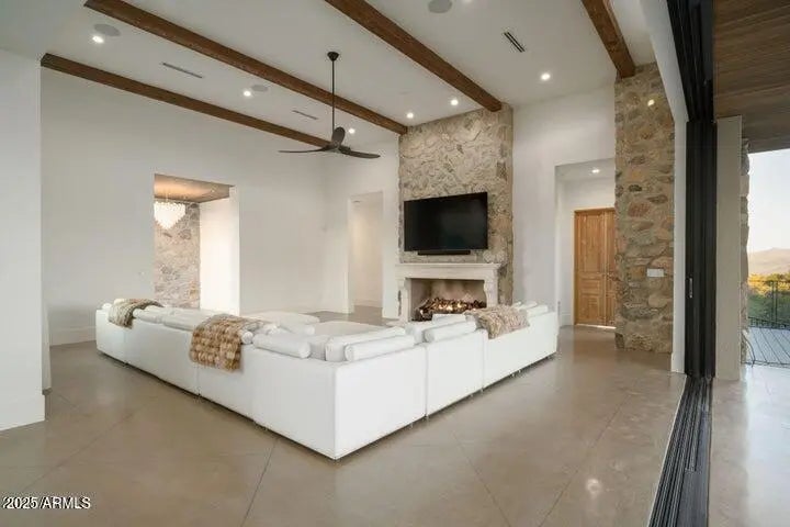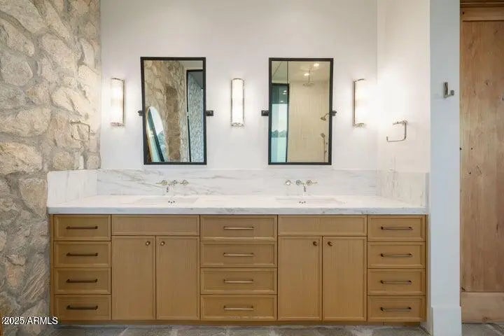 Experience elevated luxury in this custom Desert Modern home in Sereno Canyon, designed by Cosan Studio and built by Bolte Custom Homes and designed by renown interior designer Lauren Wallace. Set on a private 2.12-acre lot surrounded by protected desert, the home blends sleek contemporary lines with warm natural materials. A grand glass pivot door opens to a sun-filled great room with wide pocket doors for seamless indoor-outdoor living. The chef's kitchen features Wolf/Sub-Zero appliances and a striking quartz waterfall island, while the dining room includes a zinc bar and wine wall. The glass gallery corridor leads to a secluded primary suite with stunning McDowell Mountain views, spa bath, dressing closet, and patio.
