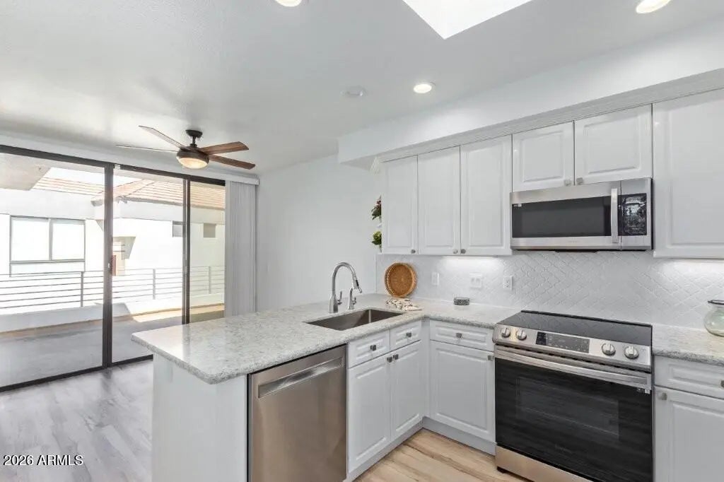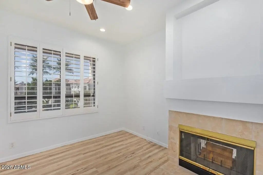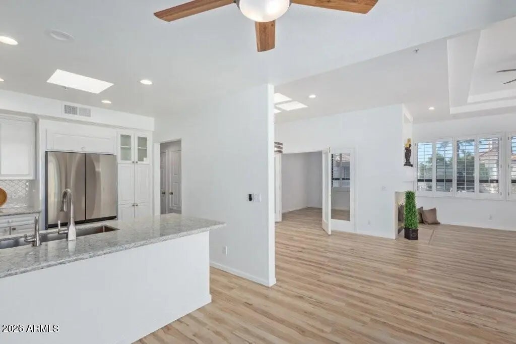 GAINEY RANCH Oasis-Bright Open Contemporary. 2 Beds+Office, 2 Baths. High Ceilings. Gorgeous Flooring Throughout. Urban Loft/Carriage House Design (living on one level above the garage, level 2). Kitchen has white cabinets, granite, bar, farmhouse sink, Sub-Zero, and breakfast room opening to the large deck outdoor space. Great Room has huge windows, formal dining, skylight, and 2-way wood burning fireplace shared with a dual french-door entry Office/Den. Master Suite also has a dual-door entry, access to a 2nd balcony, soaking-tub, dual-sinks, and a walk-in closet. Large utility/laundry and 2Car Garage with storage. Gainey Ranch offers 24hr man-gated/roaming security. Tenants have access to Gainey Estate Club: Tennis, Pickleball, Pool, Spa, Fitness. Scottsdale's Finest Lifestyle.