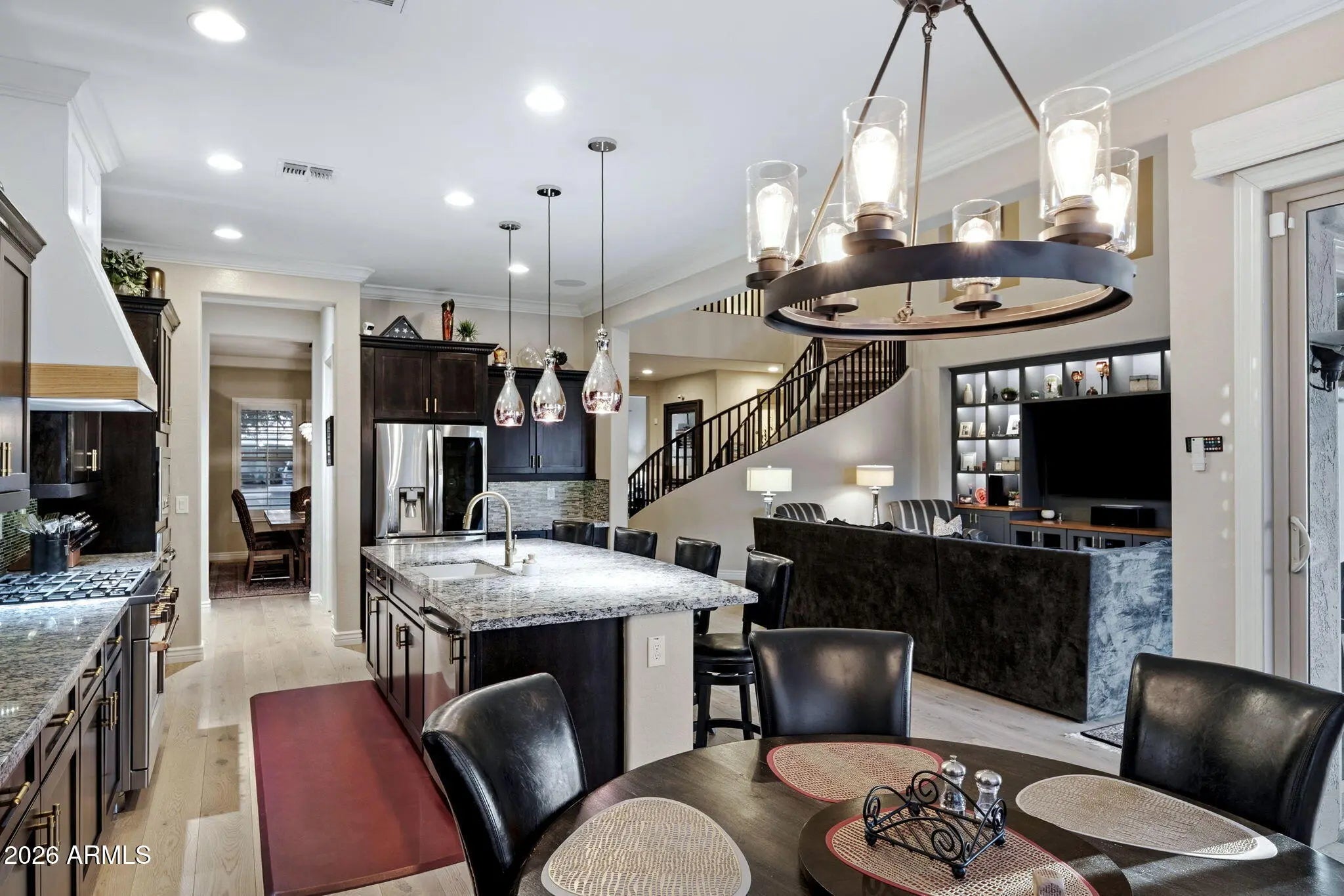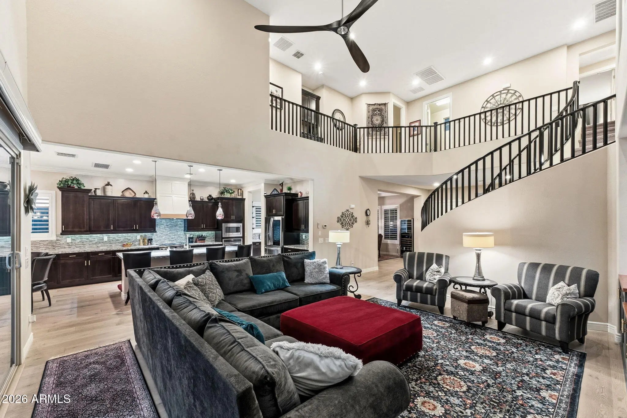 Just discovering the Valley of the Sun? Then you will want to know about this. Longtime Valley residents already understand why this community is so sought after. Morrison Ranch in Gilbert has consistently been recognized as one of Arizona's most desirable master planned communities. In the statewide Ranking Arizona survey, the largest business opinion poll in the state, Morrison Ranch earned the #2 spot in 2025. From the moment you enter the community it is easy to see why. Iconic landmarks like the Four Grain Silos, charming white picket fences, tree lined streets, and more than 16,000 trees create a timeless rural chic atmosphere that feels both welcoming and distinctive. Set just steps from the community's greenbelts, neighborhood parks, and stocked fishing lakes, this exceptional two story home captures the very best of Morrison Ranch living. The original owners have meticulously maintained every inch of the property and it shows from the moment you arrive. A private courtyard welcomes you inside where the home opens into a dramatic great room with soaring 20 foot ceilings that fill the space with natural light and an expansive sense of scale. The kitchen is truly extraordinary, designed for both daily living and unforgettable entertaining. Top name appliances anchor the space, complemented by abundant cabinetry, a generous center island, a butler's pantry, and a huge walk in pantry complete with its own freezer for added storage and convenience. The first floor primary suite offers privacy and comfort with direct access to the backyard. The beautifully designed primary bath features refined finishes and thoughtful details, while a convenient laundry room just off the suite adds ease to everyday living. The first floor laundry room is exceptionally functional with a deep sink and extensive cabinetry for storage, and both laundry rooms include the washer and dryers. Upstairs reveals a massive loft that creates the perfect gathering space for movie nights, game days, or relaxing with friends. Four additional bedrooms provide plenty of room for everyone, including one with its own private balcony. One of the bedrooms includes an extended sitting area, creating a perfect spot for a reading nook or study space, while the remaining bedrooms offer generous layouts with plenty of room for comfort and flexibility. . Extra storage throughout the upper level keeps everything organized and within reach. Open the oversized sliding doors from the great room and the backyard becomes a seamless extension of the home. Designed for effortless Arizona living, the outdoor space features a Shasta pool with beautiful water features, a newer Bullfrog spa, and a commercial grade misting system that is professionally maintained each year. Travertine pavers, a built in outdoor barbecue, and a welcoming fire pit create the perfect setting for evenings under the desert sky while keeping maintenance simple and manageable. The garage is just as thoughtfully designed as the home, featuring durable epoxy flooring and motorized overhead storage racks for maximum organization. The third bay has been converted into a home gym, complete with a dedicated A/C unit and horse stall mats to protect the concrete flooring during workouts. Additional insulation has been added to enhance energy efficiency throughout the home, and the tankless water heater was recently replaced for reliable, on demand hot water. Life in Morrison Ranch is about more than beautiful homes. It is a place where neighbors gather near the historic silos, kids ride bikes along the greenbelts, and community parks become the backdrop for everyday memories. Discover why Morrison Ranch continues to be one of Arizona's most celebrated communities and experience this remarkable home for yourself.