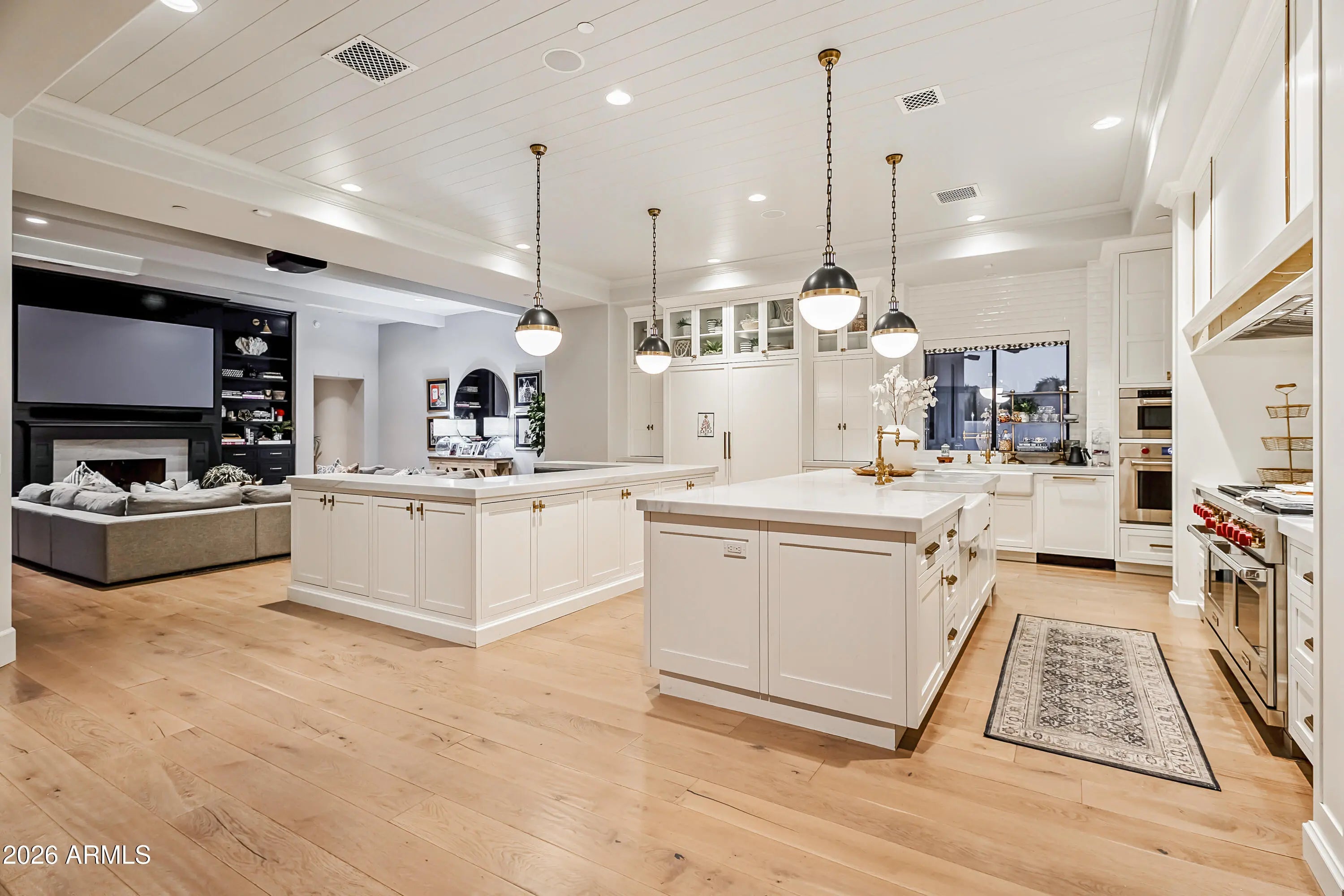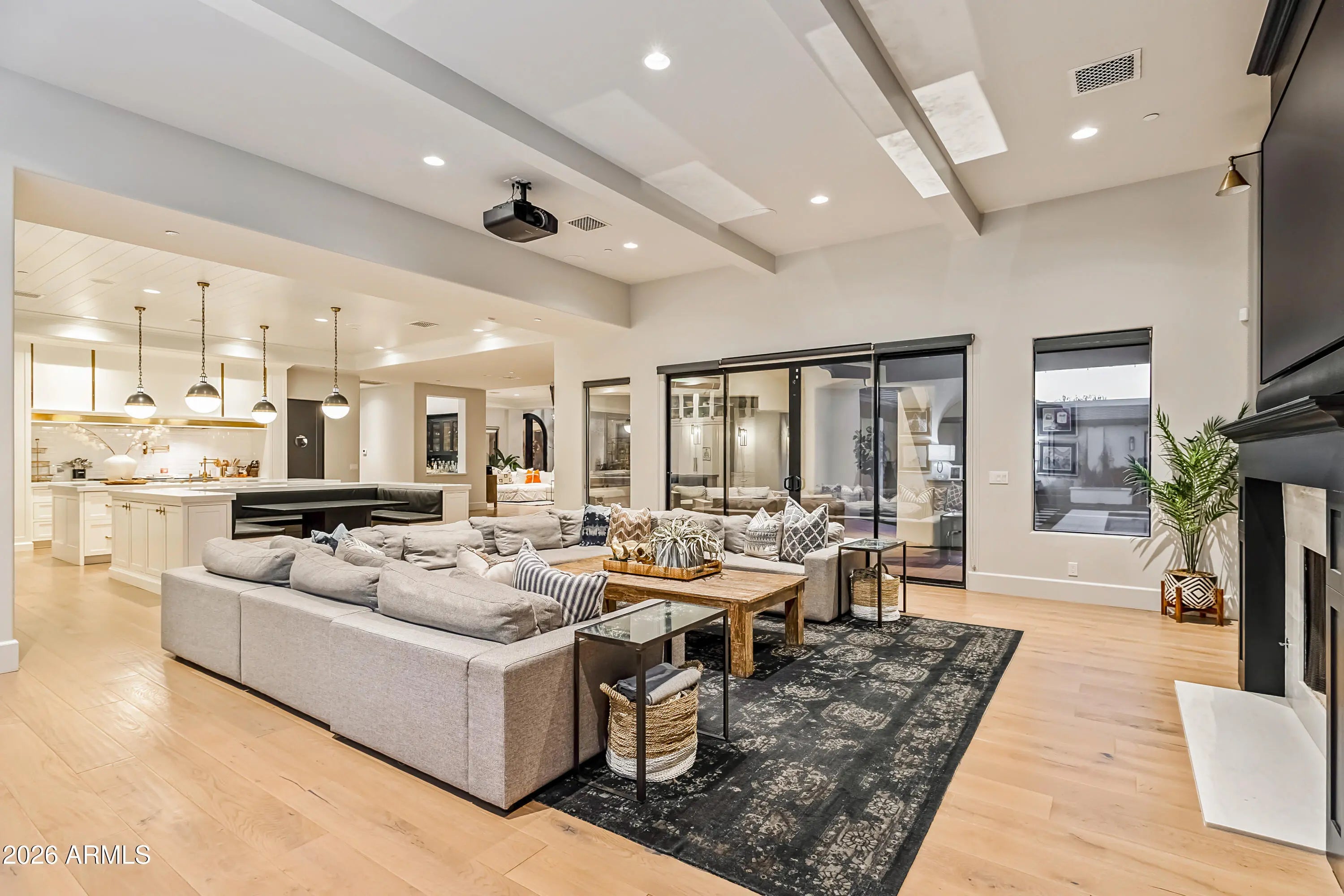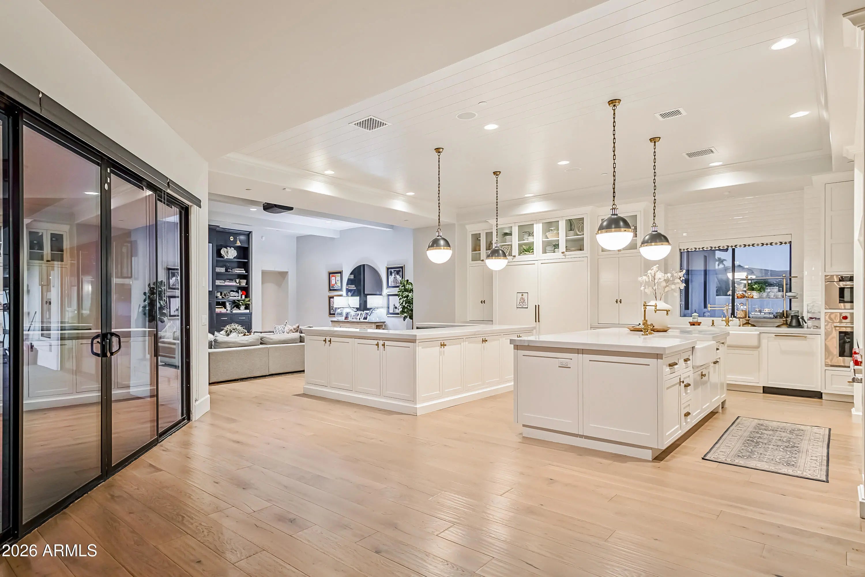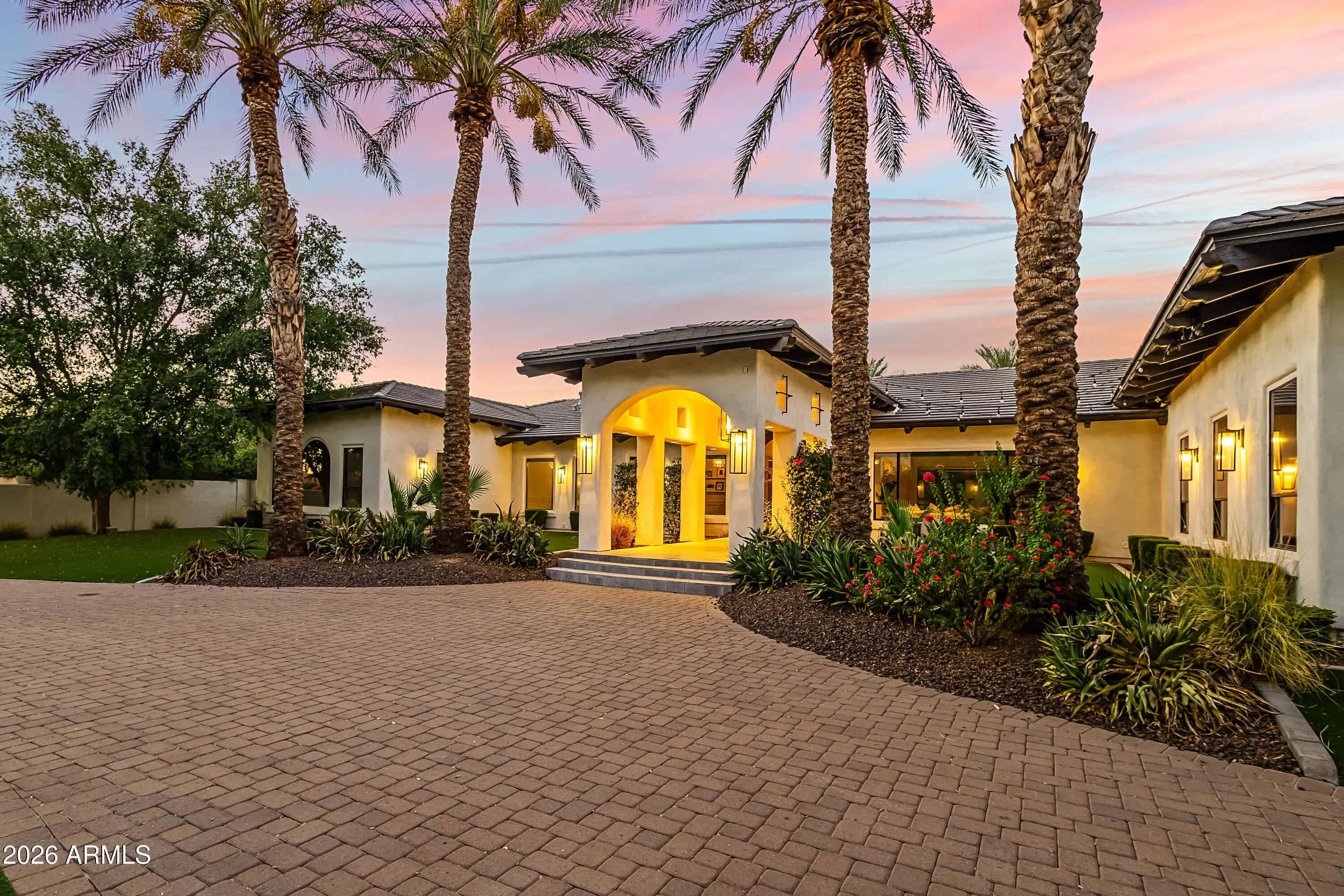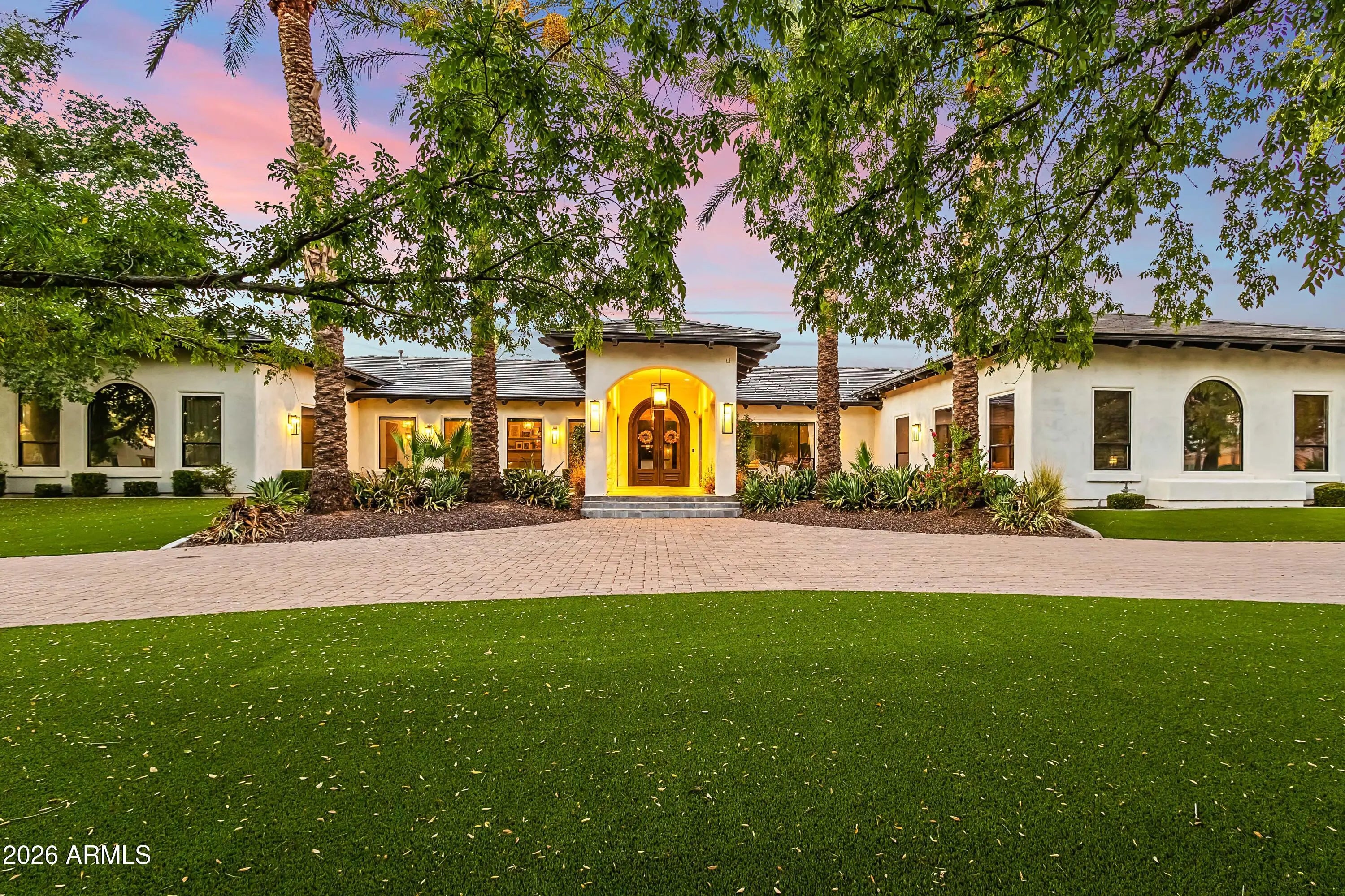 Gated 1.1 acres in Scottsdale's coveted Cactus Corridor, this exceptional estate captures sweeping mountain views, ultimate privacy, and resort-style living. Designed with Santa Barbara architecture and timeless Southern charm, the home features soaring ceilings, multiple great rooms, and an ideal split floor plan with a dedicated wing for guests or children. The chef's kitchen showcases paneled ceilings, a stunning marble island, oversized built-in dining table, custom floor-to-ceiling cabinetry, gas range, multiple ovens, and elegant brass accents. The primary retreat offers a cozy sitting area with fireplace and a spa-inspired bath featuring dual vanities, clawfoot soaking tub, oversized walk-in shower, and expansive his-and-her closets with private laundry. The property includes two detached guest houses, one with a full kitchen, laundry, and separate garage, providing ideal accommodations for multigenerational living, private offices, a gym, or theater space. Outdoors, the grounds are designed for true Arizona resort living, complete with a pool and spa, firepit, sport court, covered patio with outdoor kitchen and fireplace, and ample space to enjoy the surrounding desert and mountain views. Additional highlights include a beautiful office/library, multiple entertaining spaces, RV access capability, and exceptional privacy. Located within the top-rated Scottsdale Unified School District and just minutes from Scottsdale's premier resorts, golf courses, fine dining, and shopping.