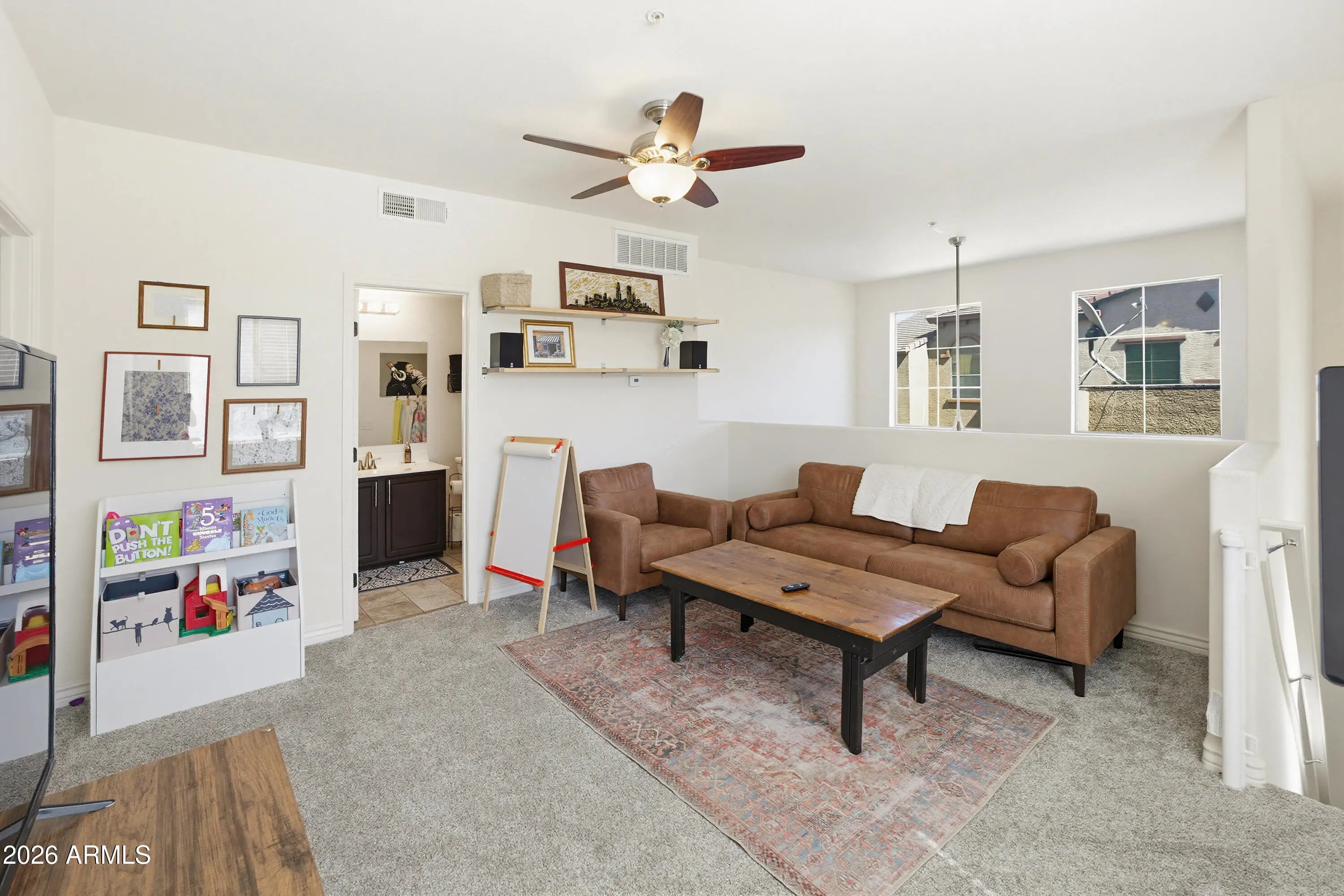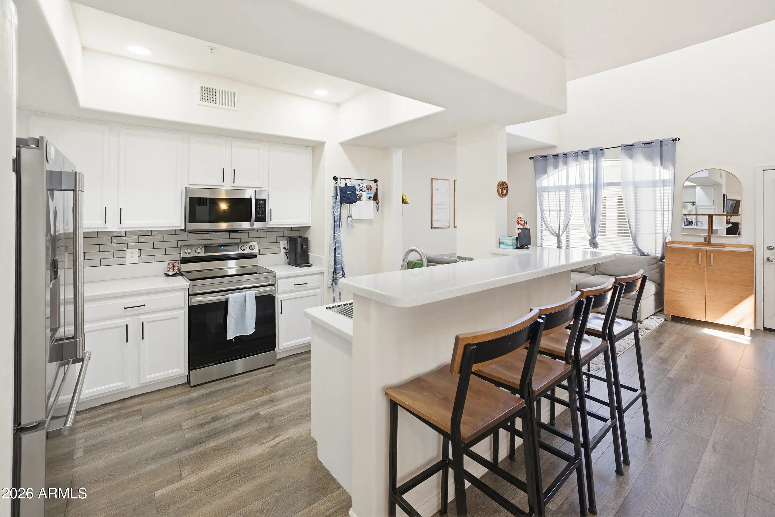 Beautiful tri-level home in North Phoenix offering flexibility, privacy, and a natural separation of living spaces. A private first-level en-suite is ideal for guests, multigenerational living, or a quiet work-from-home setup. The light-filled second level features soaring ceilings and an open-concept layout with a kitchen appointed with quartz countertops, refinished cabinetry, stainless steel appliances, and a raised breakfast bar. Updates include flooring, paint, and modern lighting throughout. Upstairs, the spacious primary suite offers double vanities, an oversized walk-in shower, and generous closet space, along with a versatile loft perfect for a media room or lounge. Private balcony plus community pool and covered BBQ area for easy indoor outdoor living.