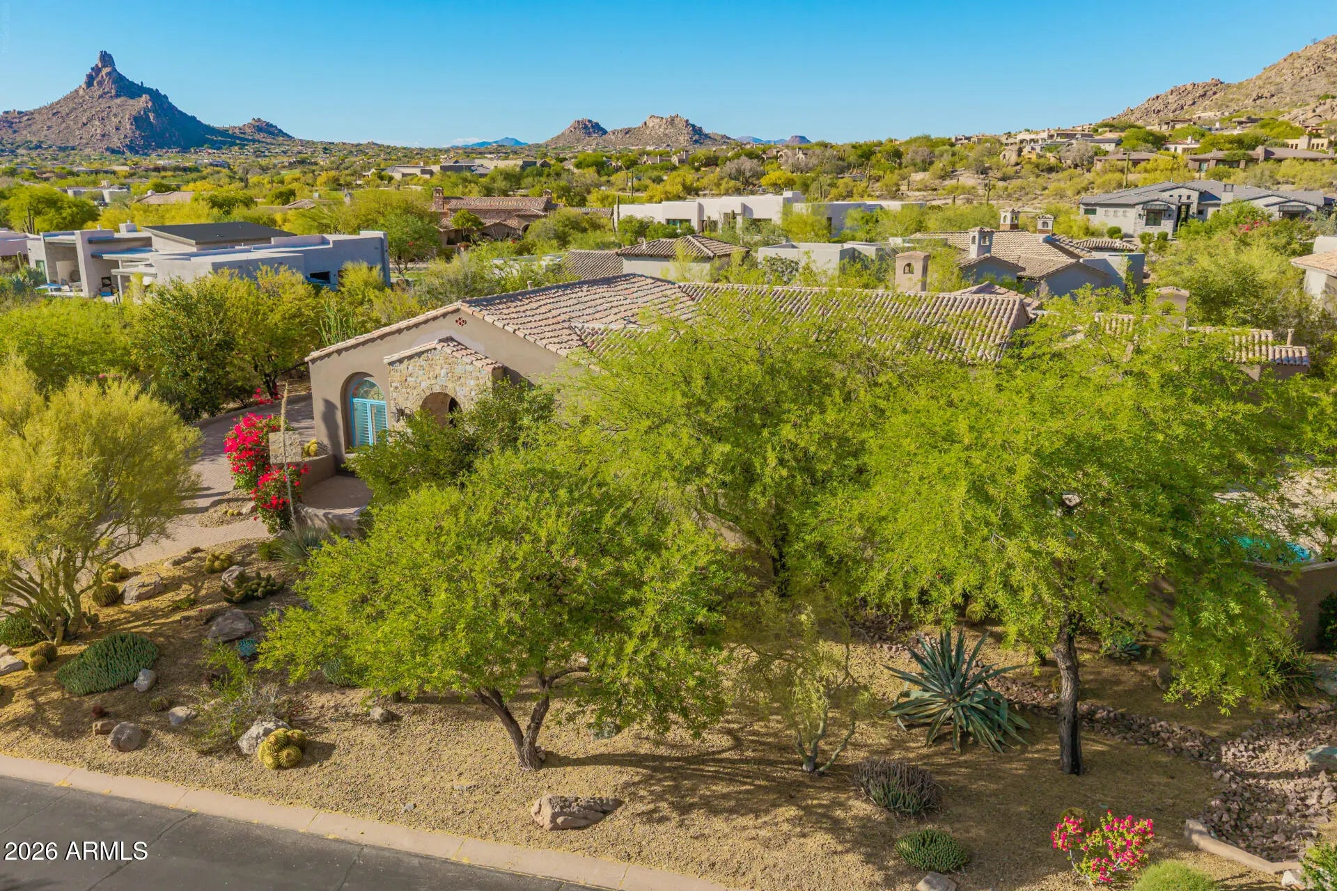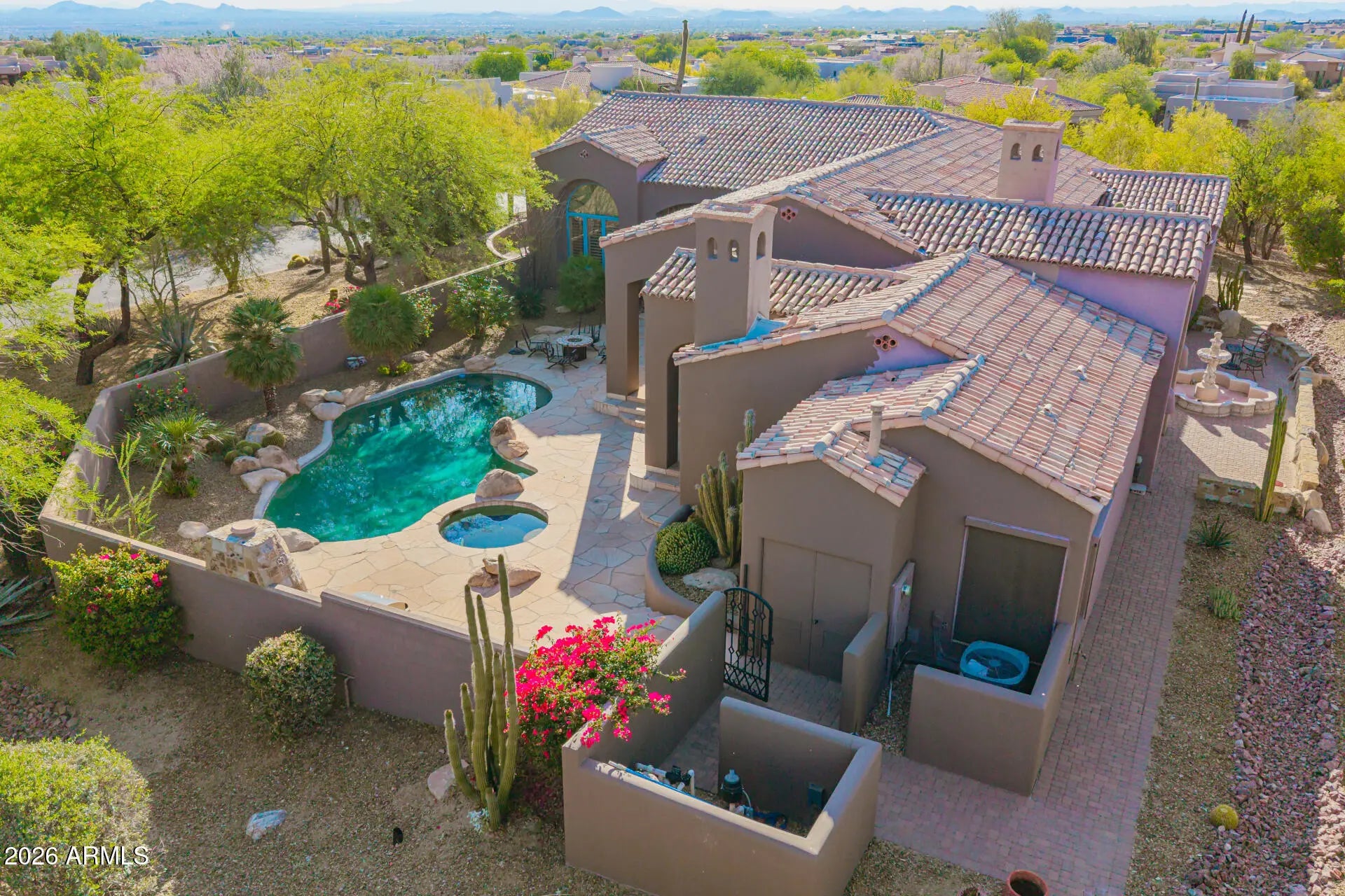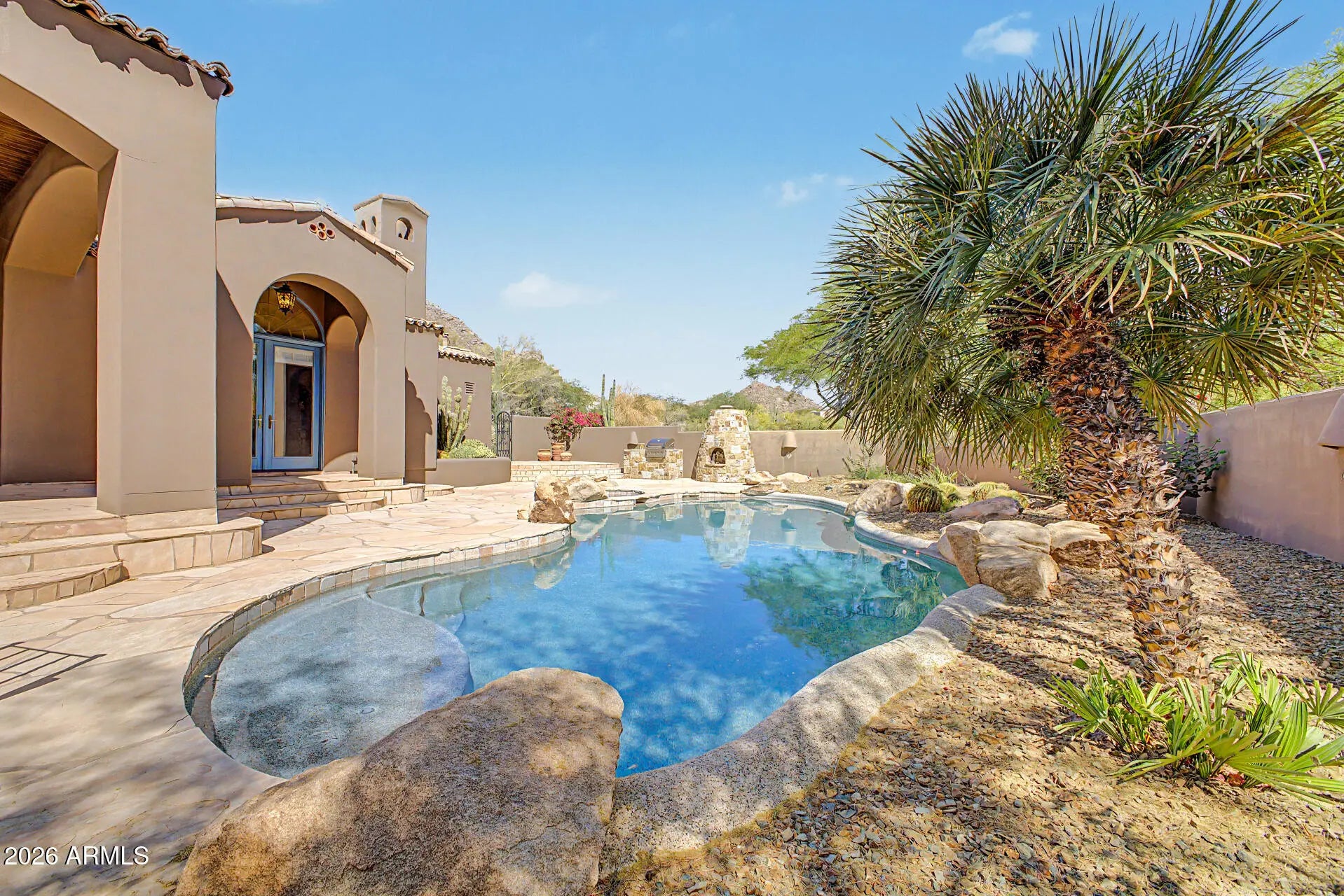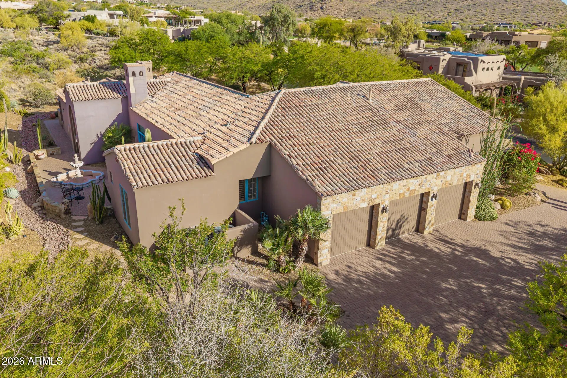 Nestled within the prestigious guard-gated community of Glenn Moor at Troon Village, residents enjoy a rare blend of privacy, security, and elevated North Scottsdale living with estate-sized lots and breathtaking desert, mountain, and city light views. This beautifully updated estate offers a rare blend of privacy, elegance, and serene desert living on an expansive .60-acre lot with stunning mountain views. The single-level home spans 3,093 square feet with no interior steps and features 3 bedrooms plus a dedicated office with a wet bar, along with a 3-car garage and a paver driveway. Designed with timeless craftsmanship, the home showcases solid wood doors and cabinetry, polished travertine floors with matching baseboards, wood beam accents, smooth walls, plantation shutters, & recessed lighting. The chef-inspired kitchen--open to the family room--features a large island with a secondary vegetable/prep sink, granite countertops, a gas range, double ovens, and generous prep and storage space, ideal for both everyday living and entertaining. A separate dining room and living room provide flexible space for formal entertaining, a media room, or additional lounge areas. The oversized primary suite is a private retreat complete with its own fireplace and double doors leading to the backyard, along with a custom closet featuring animal print carpet and refined finishes, while the primary bathroom offers a separate tub and dual vanities. The resort-style backyard is designed for relaxation and entertaining with a heated pool and spa, stone decking, built-in BBQ, large covered patio with wood beam accents, kiva fireplace, and a tranquil side yard with a peaceful fountain, creating the ultimate Arizona lifestyle experience. A+ Schools. While Glenn Moor itself emphasizes a quiet, low-density luxury lifestyle, homeowners have the option to join Troon Country Club, offering championship golf, tennis and pickleball courts, a fitness center, resort-style pool, dining, and a vibrant social calendar. The community is also ideally positioned near the McDowell Sonoran Preserve and Pinnacle Peak Park, providing access to miles of scenic hiking and biking trails, along with nearby parks, golf, dining, and shopping--making it the perfect combination of exclusivity, recreation, and everyday convenience.