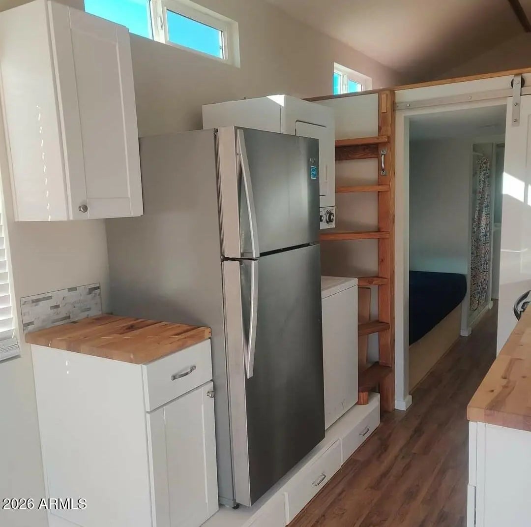 300 sq. ft. tiny home for rent, completed in 2024. All utilities included in rent. Full kitchen with full sized fridge, full sized microwave, full sized oven/range. Stackable washer/dryer in unit. Spriral staircase up to a 12' X 8' loft... holds any size bed, Twin sized bed downstairs in bedroom w/ storage underneath. Bathroom includes toilet, single full sized sink and spacious tiled walls shower, instant hot water. Also has clothes closet w/ shoe shelving at far end. Living room with wall TV and installed TV on wall in bedroom. This unit has 2 AC units to keep it cool in the summer. Vaulted 10' ceilings. Plenty of windows. 8' X 10' patio off of front of home. Tenant has parking space for 2 and large private area to use if tenant has pets. No smoking, some other rules apply.