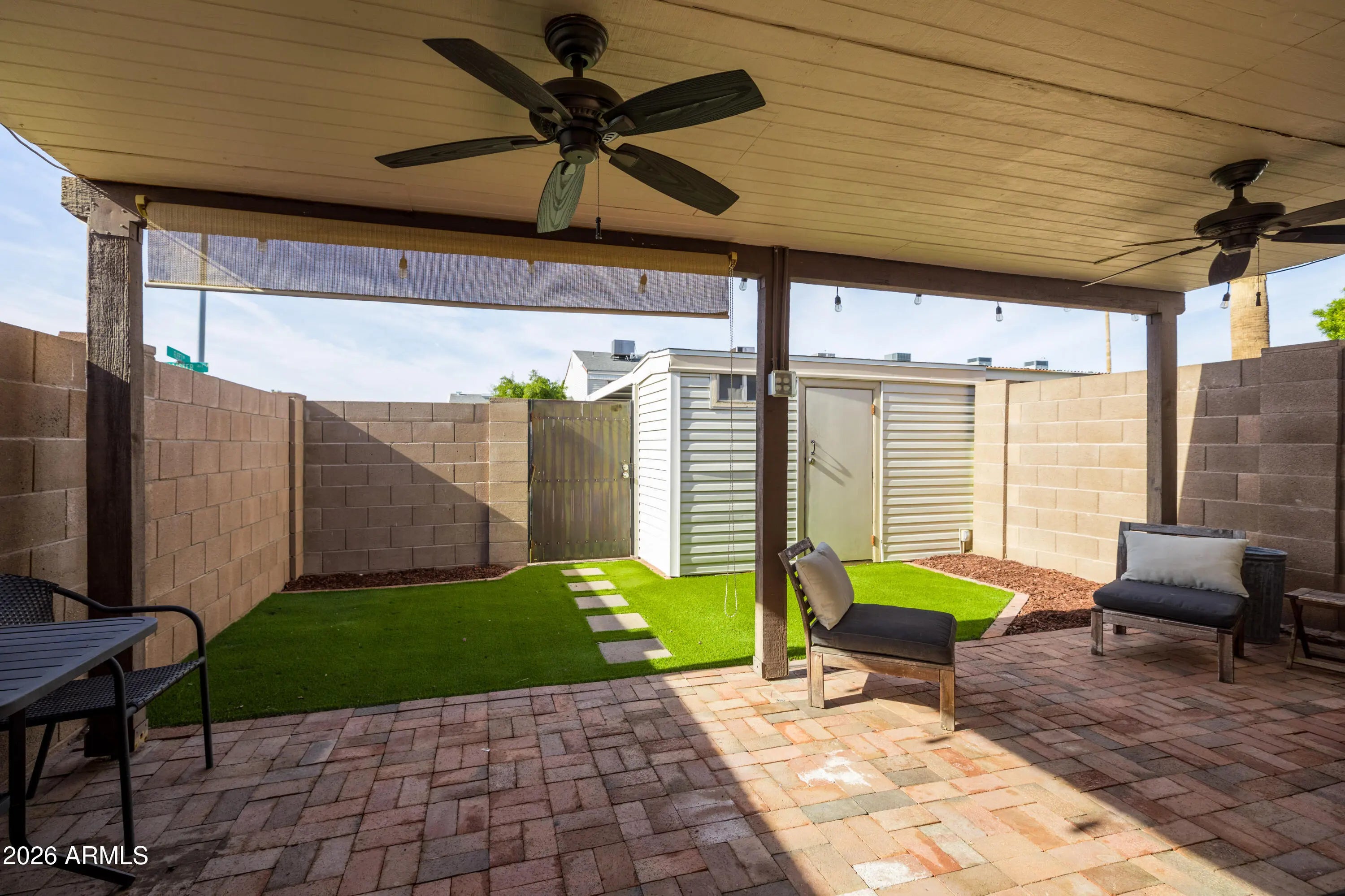 Sunlight and clean lines define this thoughtfully reimagined single-level residence in the heart of Tempe. The interior unfolds with intention, anchored by a beautifully remodeled kitchen where white cabinetry, quartz countertops, and a striking tile backsplash create a crisp, modern palette. A skylight above floods the space with natural light, giving the kitchen an airy, almost gallery-like presence that elevates everyday living. The living area flows effortlessly from the kitchen, finished with warm wood-look flooring, recessed lighting, and contemporary ceiling fans that balance comfort with design. Large sliding doors blur the line between indoors and out, opening to a private, covered patio and enclosed yard that feels calm, curated, and quietly inviting. Paver flooring and low-maintenance turf create a polished outdoor space that works just as well for morning coffee as it does for evening wind-downs. Both bedrooms are serene and well proportioned, each offering walk-in closets and a neutral backdrop that allows the architecture and light to take center stage. The bathroom continues the refined aesthetic with a granite-topped vanity, clean lines, and updated finishes. A detached storage space adds practical function without disrupting the home's visual simplicity. This home enjoys a central Tempe location with easy access to dining, shopping, and major freeways, while remaining tucked within a community that offers greenbelts and a pool. Modern, intentional, and quietly sophisticated, this residence delivers a lifestyle that feels both effortless and elevated.