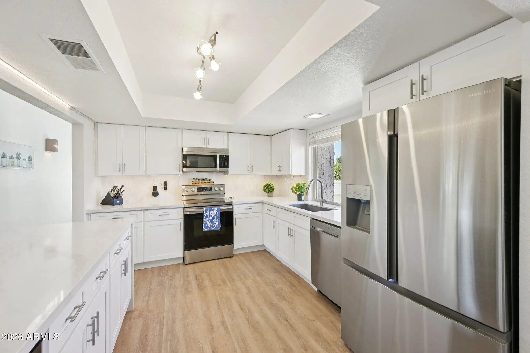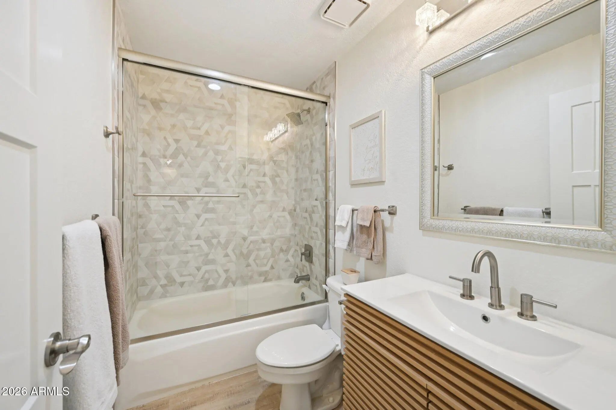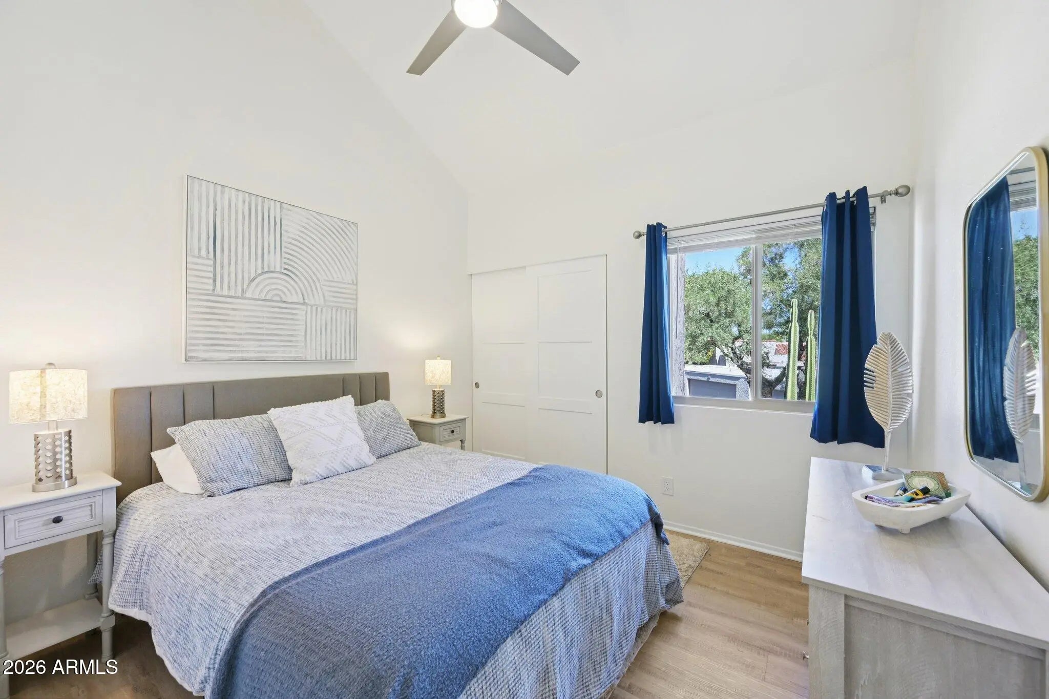 Nestled in the coveted McCormick Ranch community, this fully remodeled 3-bedroom, 2-bath home (2023) combines modern upgrades with timeless charm. The bright, airy interior features soaring ceilings and wide-plank luxury oak flooring throughout. The kitchen showcases shaker-style cabinets with organizers, quartz countertops with a waterfall edge, and brand-new appliances--perfect for everyday living and entertaining. The primary suite boasts a remodeled bathroom and an expansive custom closet, complemented by upgraded closets throughout the home. Additional enhancements include wood blinds, new interior doors, dual-pane windows, dual sliding doors to the patio, ceiling fans with remotes, updated lighting, fresh paint, and a full-size washer and dryer, making it truly move-in ready. Just steps from the community pool and near the two-car garage, residents enjoy a friendly neighborhood with many activities and resort-style amenities, including two heated pools, a spa, fitness center, and HOA-covered water. Dozens of restaurants, shops, and the best network of bike trails adjacent to Camelback Village are within walking distance, offering convenience and lifestyle appeal. This home perfectly blends style, comfort, and thoughtful upgrades in one of McCormick Ranch's most desirable communities.