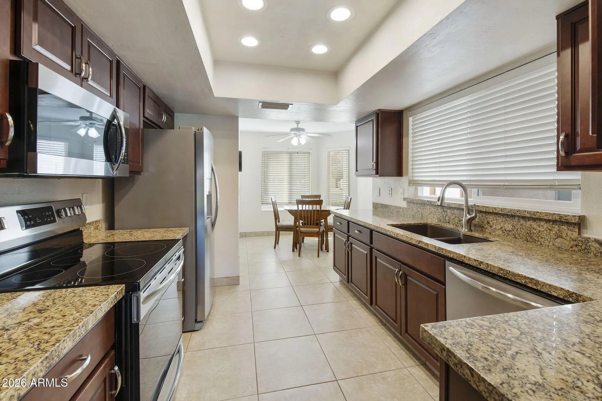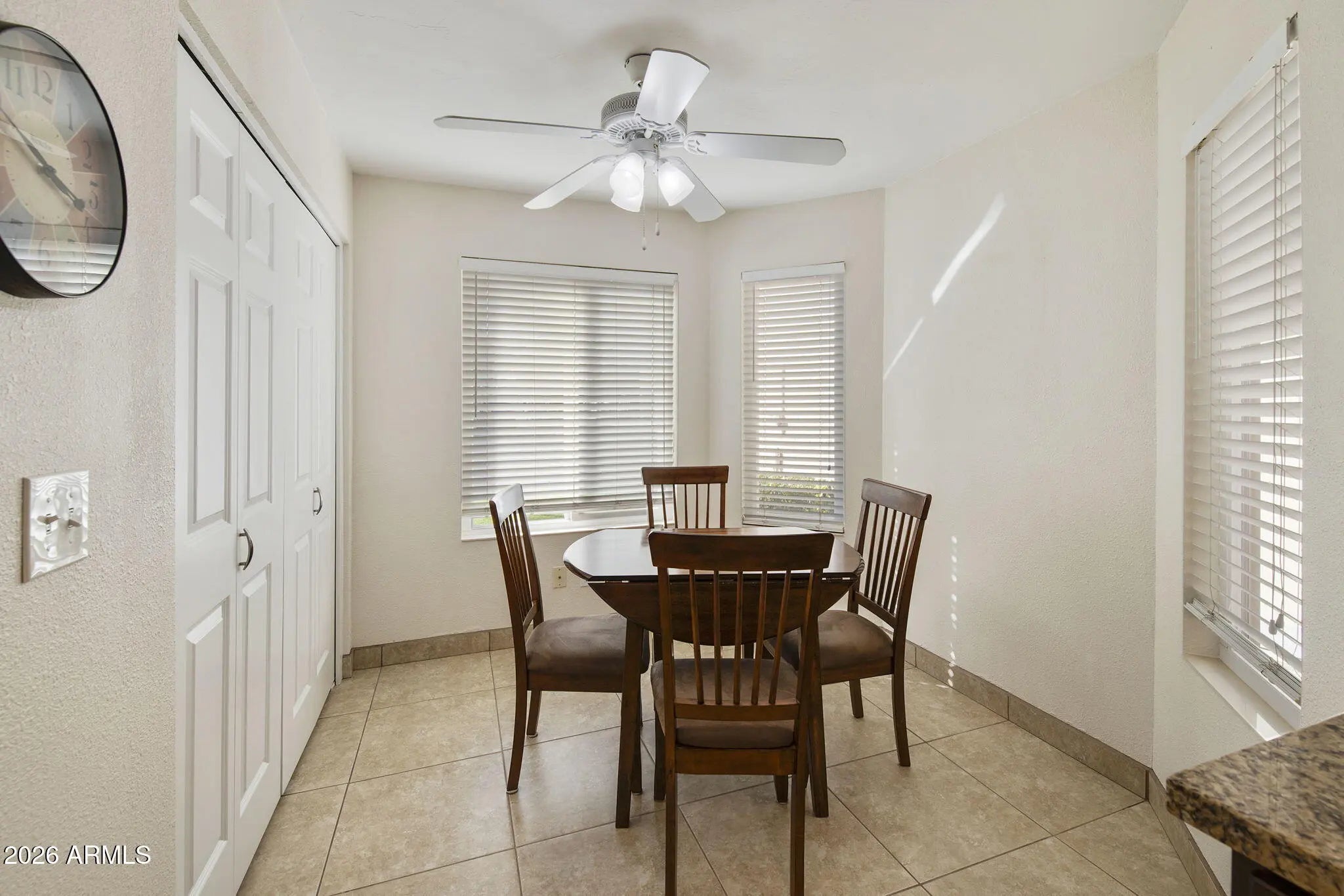 Don't miss this opportunity in the highly desirable 55+ gated community of Fountain of the Sun! This well-maintained home features a split primary bedroom floor plan with a walk-in closet and comfortable living spaces throughout. Tile flooring was fully updated in 2018, and the home includes dual-pane windows with screens. The layout offers both formal dining and an eat-in kitchen, ideal for everyday living. The updated kitchen (2022) features granite countertops, electric oven, dishwasher, refrigerator, disposal, and built-in microwave. Indoor laundry includes washer and dryer. Additional updates include HVAC replaced in 2025 and a partial bathroom update in 2022. Ceiling fans and north/south exposure help keep the home comfortable year-round. CLICK MORE... Enjoy relaxing outdoors on the covered patio, plus the convenience of a 1-car garage. Sorry, this is a NO PET AREA. Walking distance to the main pool/spa, Activity Center, Birdie's Restaurant, Golf Pro Shop, and driving range. Near the US 60 and Red Mountain Freeways with easy access to Mesa Gateway Airport, Sky Harbor, and Costco. Superstition Springs and San Tan Mall are a short drive away. Enjoy Country Club amenities including a lake, golf course, pickleball, bocce ball, fitness center, billiards, library, and more.
