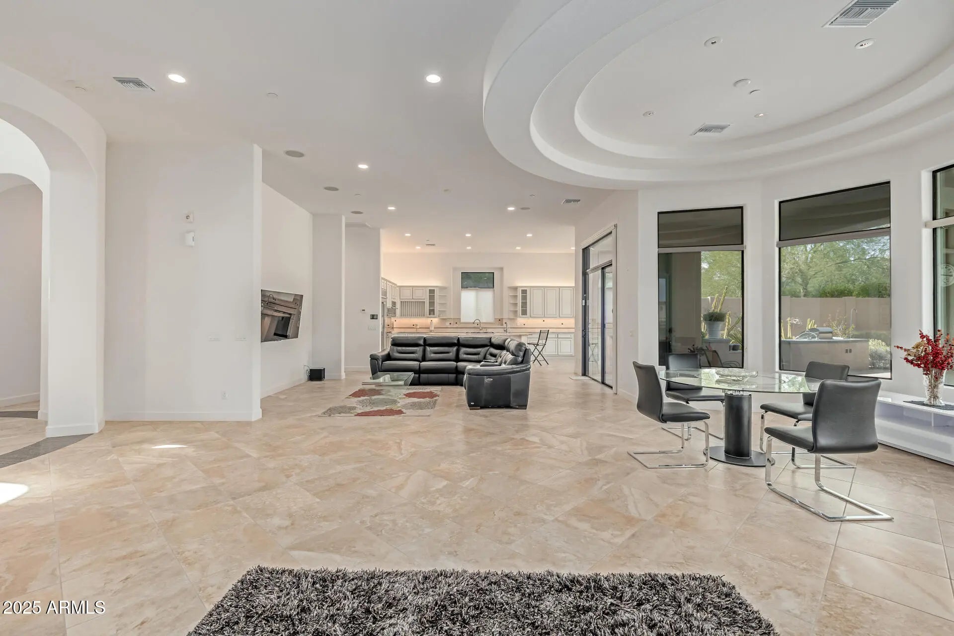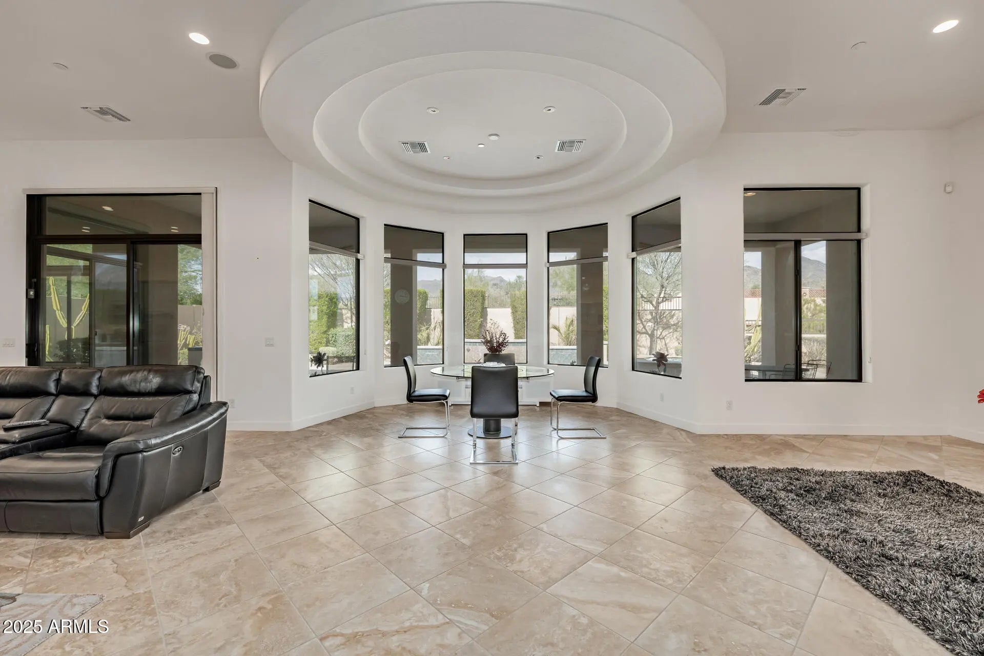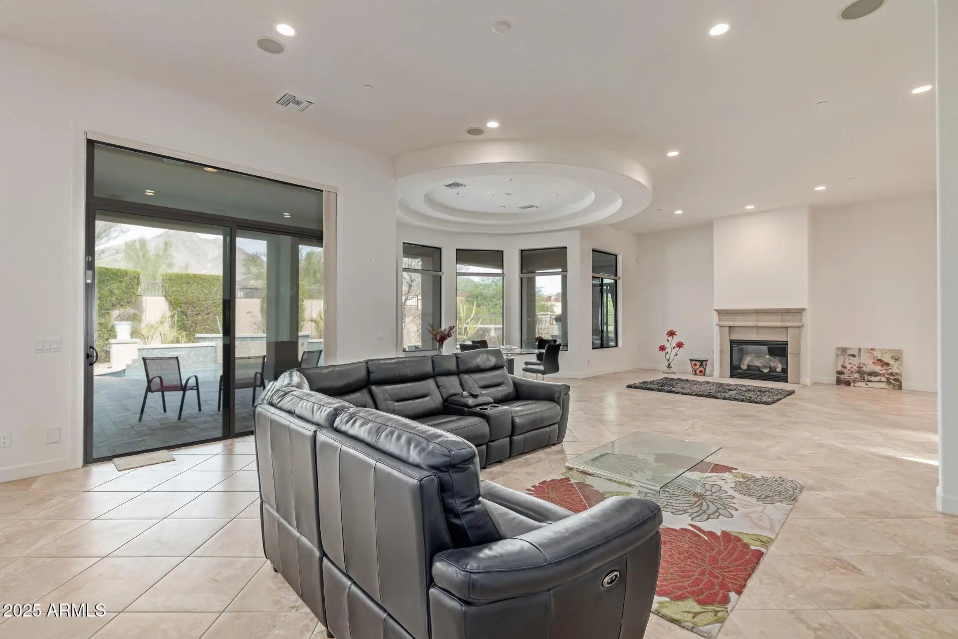 Luxury living w panoramic view of the McDowell mountains in the sought after Windgate Ranch! This home features TWO bonus/flex rooms that can be used as additional bedrooms, an office, a gym, a movie room, game room and more! Nestled in a quiet cul-de-sac, with an impressive curb appeal. The stunning courtyard and beautifully manicured landscape are just the beginning. You're welcomed in a stunning foyer, inviting you to discover generous living area, a perfect blend of elegance and comfort, featuring pristine tile flooring, soaring ceilings, and delightful arches throughout, a fireplace for cozy evenings in the living room, a double tray ceiling in the formal dining, and a modern neutral palette, promoting a feeling of openness. You'll find a home bar adding ambiance to your gatherings