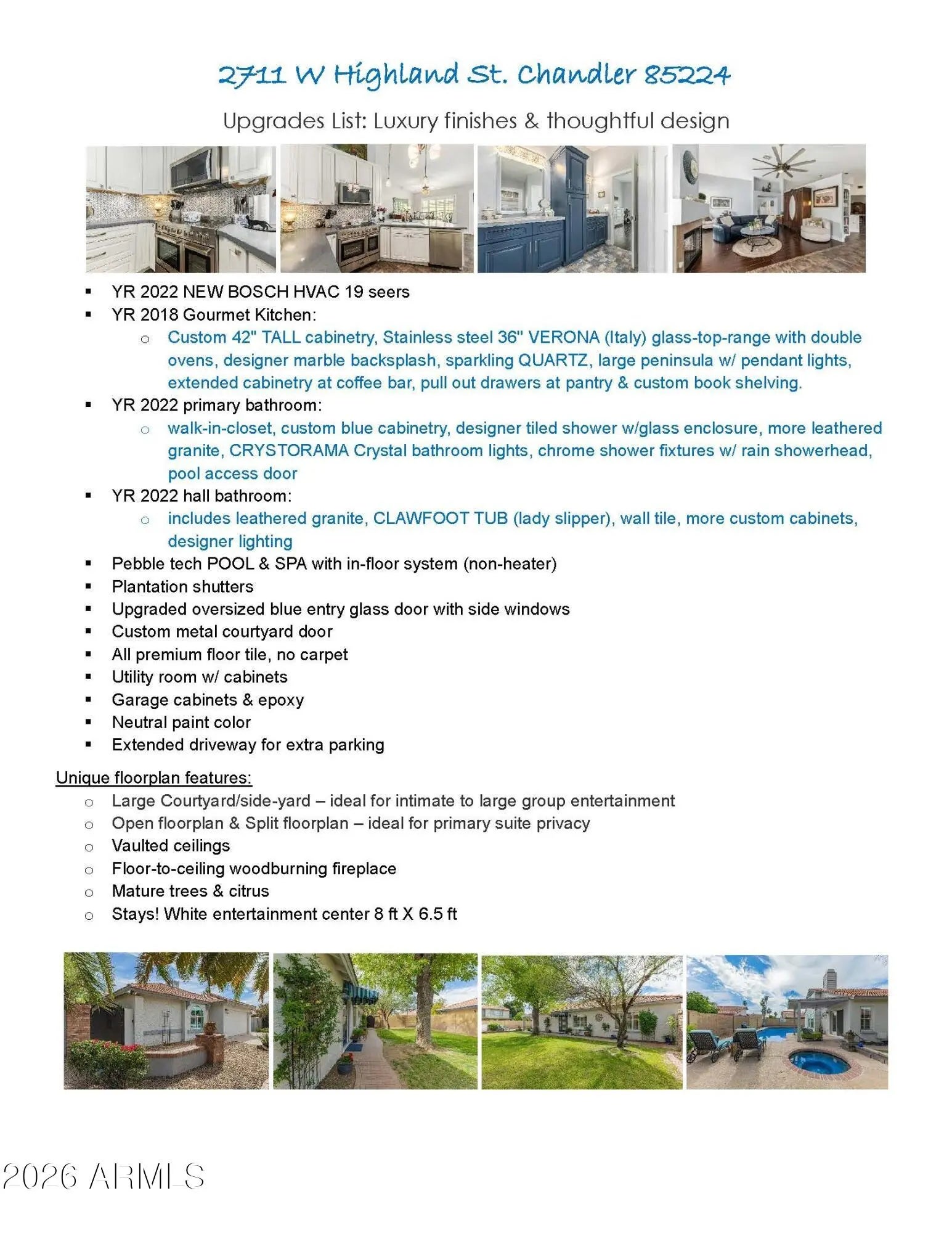 Sensationally Upgraded 3 bed, 2 bath, 2 car-g, NO HOA, fireplace, Pebble tec POOL|SPA, large courtyard, vaulted ceilings, plantation shutters, N|S exposure lot, NEW Bosch AC *High-end details & special attention throughout. *Custom metal courtyard door *Upgraded blue entry door *Open floorplan *Gourmet kitchen includes custom 42'' TALL kitchen cabinetry, Stainless steel 36'' VERONA (Italy) glass-top-range w/ double ovens, designer backsplash, sparkling QUARTZ, large peninsula w/ pendant lights, extended cabinetry at coffee bar & custom book shelving. Luxury finishes & thoughtful design in kitchen & all bathrooms! *Floor-to-ceiling fireplace *Hall bath includes leathered granite, CLAWFOOT TUB (lady slipper), wall tile, more custom cabinets, designer lighting *Picturesque windows~ & french doors capture views of LAP POOL|SPA, large side-courtyard and tons of natural light *Primary suite features walk-in-closet, modern c-fan, more vaulted ceilings, large ensuite: blue cabinetry, designer tiled shower w/glass enclosure, more leathered granite, CRYSTORAMA Crystal bathroom lights, pool access door *Split floorplan *Premium TILE, no carpet! *Utility room w/cabinets *Garage cabinets & epoxy *Large grassy courtyard, mature & citrus trees *Extended driveway for extra parking *Remodeled top to bottom, SO much to list! Must tour to appreciate it fully!