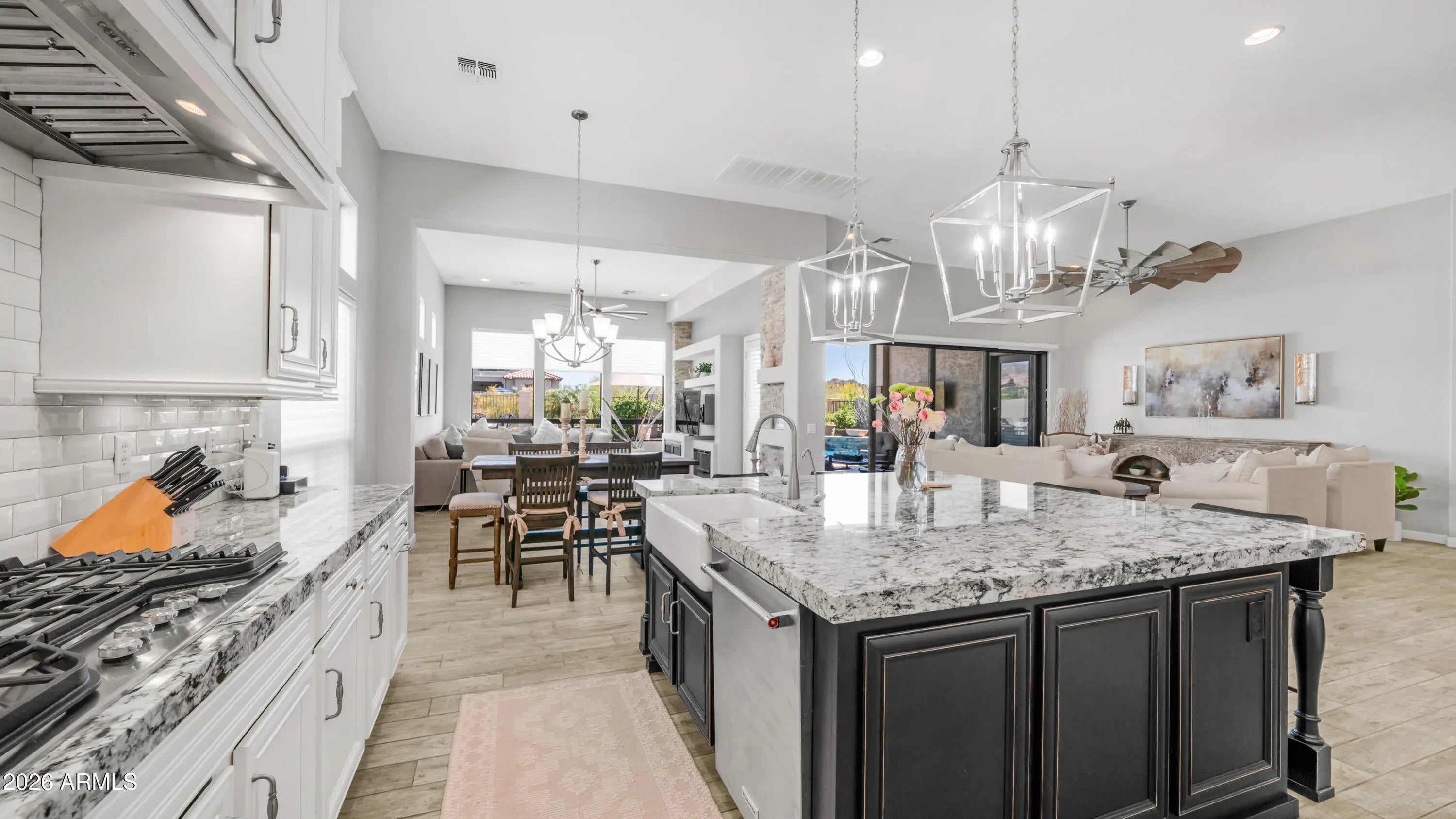 Absolutely stunning and highly upgraded, this exquisite residence shows like a model home nestled in the prestigious gated community of Mountain Bridge. Meticulously maintained and offered with furnishings available on a separate bill of sale, this is a truly move-in ready home, just pack your bags and begin enjoying luxury Arizona living. Designed with both elegance and comfort in mind, the open and spacious split floorplan offers 4 ensuite bedrooms, 4.5 bathrooms, and 3317 square feet of beautifully appointed living space. Soaring 12-foot ceilings and expansive windows fill the home with natural light, while a dramatic sliding wall of glass creates seamless indoor-outdoor living. A gated courtyard welcomes you to the home, where a custom iron front door opens to an impressive entry. A versatile den/office or guest suite with glass French doors provides a private and sophisticated space. At the heart of the home, the chef's kitchen is both stunning and functional, featuring upgraded white cabinetry with glass uppers, a massive island with seating, built-in refrigerator, gas range with pot filler, abundant storage, and generous workspace. The kitchen flows effortlessly into a casual dining area and expansive family room highlighted by custom built-in shelving with stacked stone accent , a fireplace, and walls of windows that frame the picturesque backyard. The formal living room's wall of glass opens to the patio, creating the perfect setting for indoor-outdoor entertaining, while the formal dining room completes this elegant gathering space. The spacious primary retreat offers a private sitting area and a luxurious ensuite bath with separate vanities, a soaking tub, walk-in shower, and two walk-in closets. Relax and unwind or entertain family and friends in your own private resort-style backyard. The beautifully designed outdoor space features a travertine patio, sparkling pool, spa, and a stacked stone wall with waterfalls and fire bowls. Artificial turf, lush landscaping, mountain views, and a built-in BBQ create the perfect setting to relax at the end of the day or entertain family and friends. This is more than just a home, it's a lifestyle. Set amidst the natural beauty of the Upper Sonoran Desert surrounded by some of the best hiking and biking trails in Arizona. This stunning master-planned community offers resort-style living for all ages with amenities that include Pool, Tennis, Pickleball, Basketball, Fitness Center, Playground, Clubhouse, Walking and Biking Trails and more. Fantastic location with Great Schools, Restaurants and Shopping, just one mile to the 202 freeway,15 minutes to Saguaro Lake and just 20 Minutes to Sky Harbor, Mesa Gateway Airports and Scottsdale. Experience the perfect blend of luxury and resort-style living, surrounded by the breathtaking natural beauty of the Sonoran Desert.
