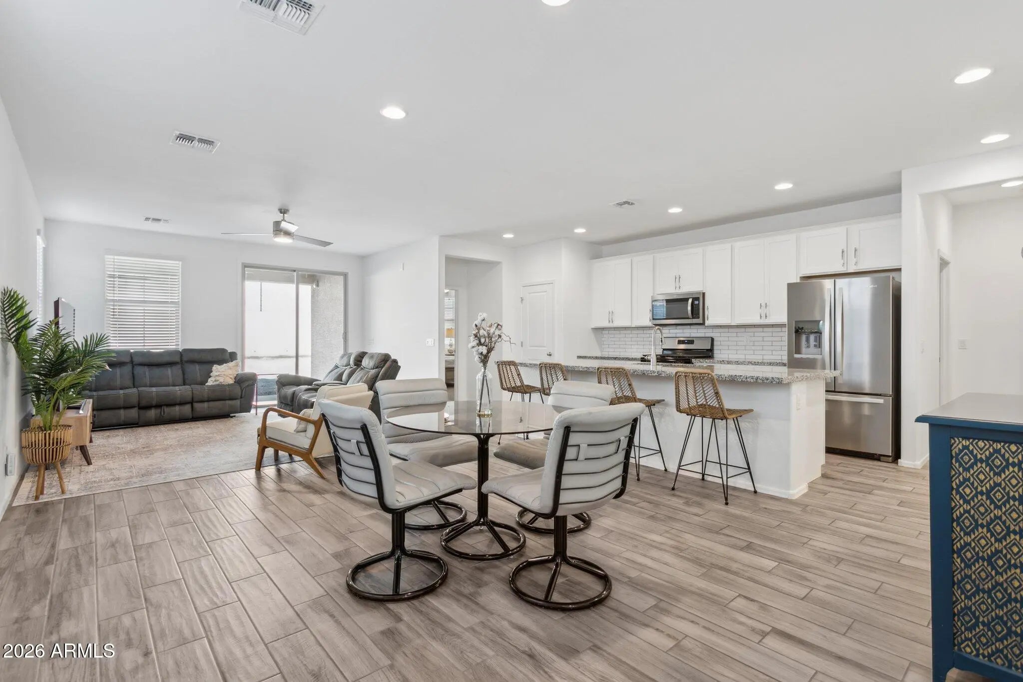 Why buy new when you can get this like new - 2023 build at an amazing price!! Situated on a desirable corner lot this inviting 3-bedroom, 2-bath home with a versatile bonus/flex room offers comfort, style, and space to fit your lifestyle. Step through the front door and discover a move-in-ready home featuring wood plank tile flooring throughout the high-traffic areas for both durability and modern appeal. The open-concept floor plan creates an easy flow between the kitchen, dining area, and family room, making everyday living and entertaining feel effortless. The kitchen is both stylish and functional, showcasing classic white cabinetry, a timeless subway tile backsplash, granite countertops, stainless steel appliances and a gas stove that will delight any home chef. The adjacent dining space opens seamlessly to the comfortable family room, creating the perfect gathering place for casual dinners, movie nights, or hosting friends and family. The spacious primary suite is a peaceful retreat filled with lovely natural light. The attached bathroom features dual sinks, a relaxing soaking tub, and a beautifully tiled walk-in shower. Two additional bedrooms provide flexibility for guests, hobbies, or a home office, while the bonus room with double doors offers the perfect flex space for a den, office, playroom, or workout area. Step outside to the backyard, where you'll find a blank canvas ready for you to create your own private desert oasis. Whether you envision a sparkling pool, lush landscaping, or a tranquil outdoor living space, this yard offers endless possibilities. Living in Estrella Mountain Ranch means enjoying an active and scenic lifestyle surrounded by the stunning Estrella Mountains. Residents have access to miles of hiking and biking trails, beautiful lakes, golf at the Golf Club of Estrella, community pools, fitness centers, parks, and year-round events that bring neighbors together. With breathtaking desert views and exceptional amenities, Estrella Mountain Ranch offers a lifestyle as beautiful as the home itself.