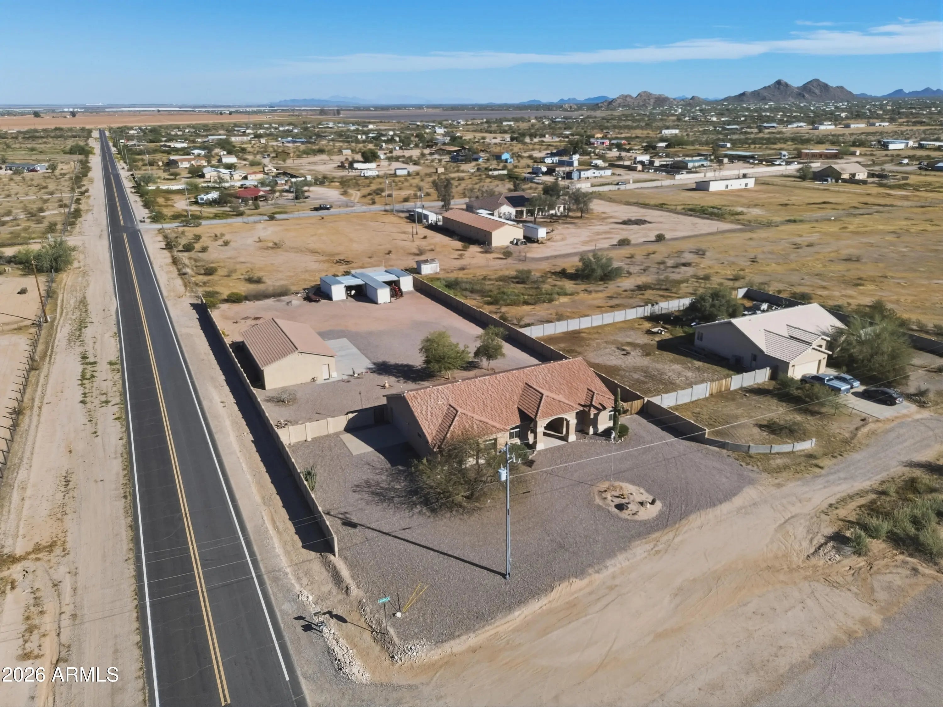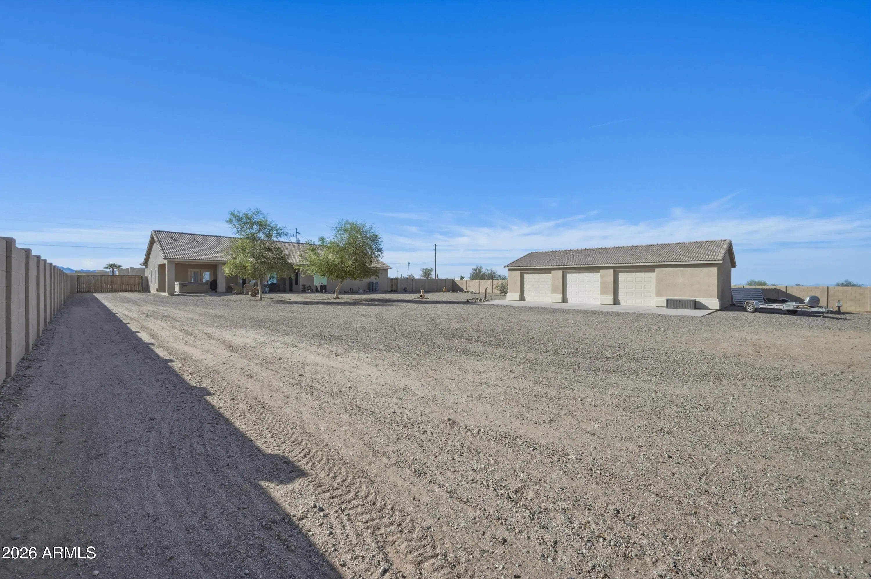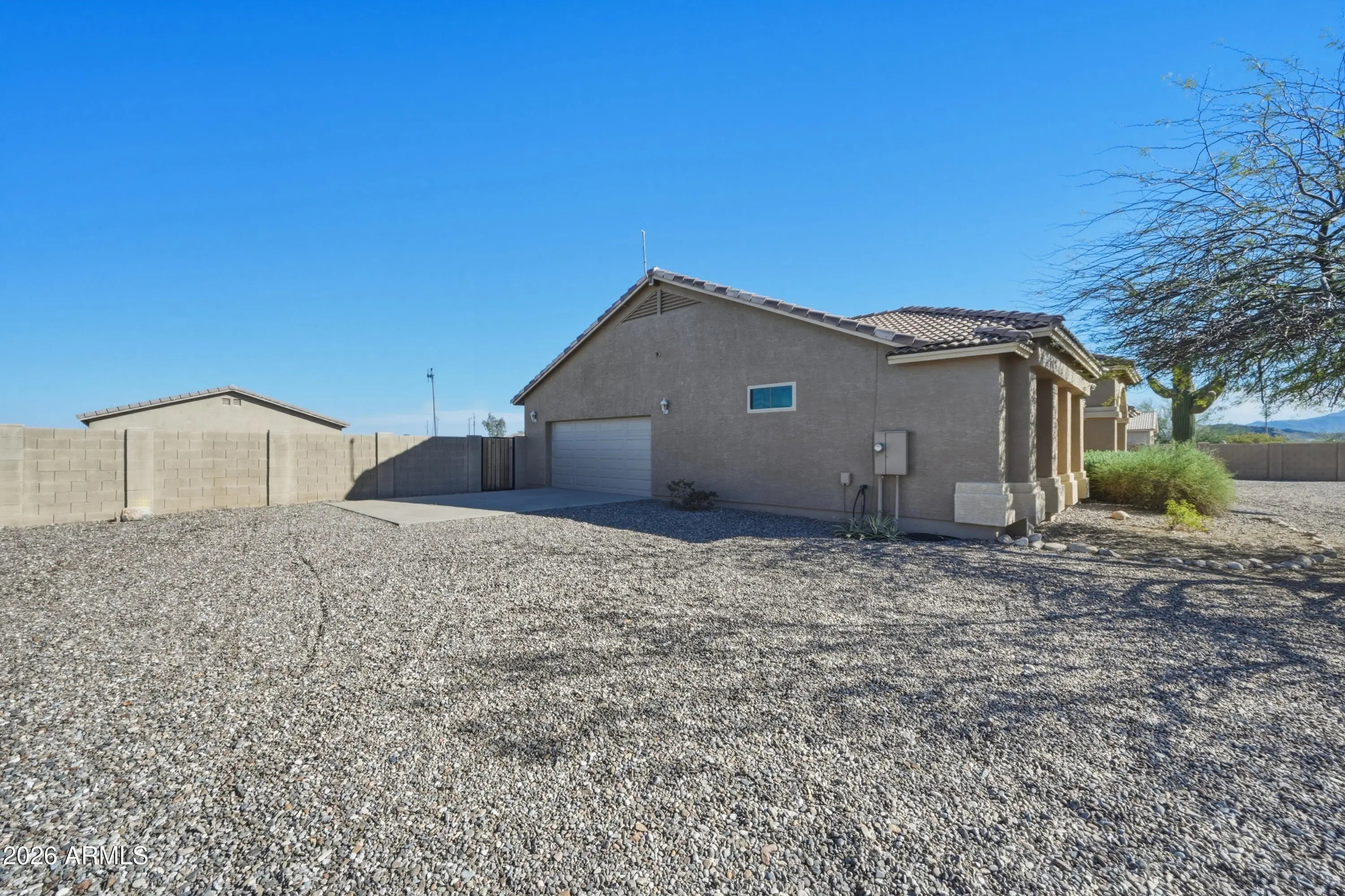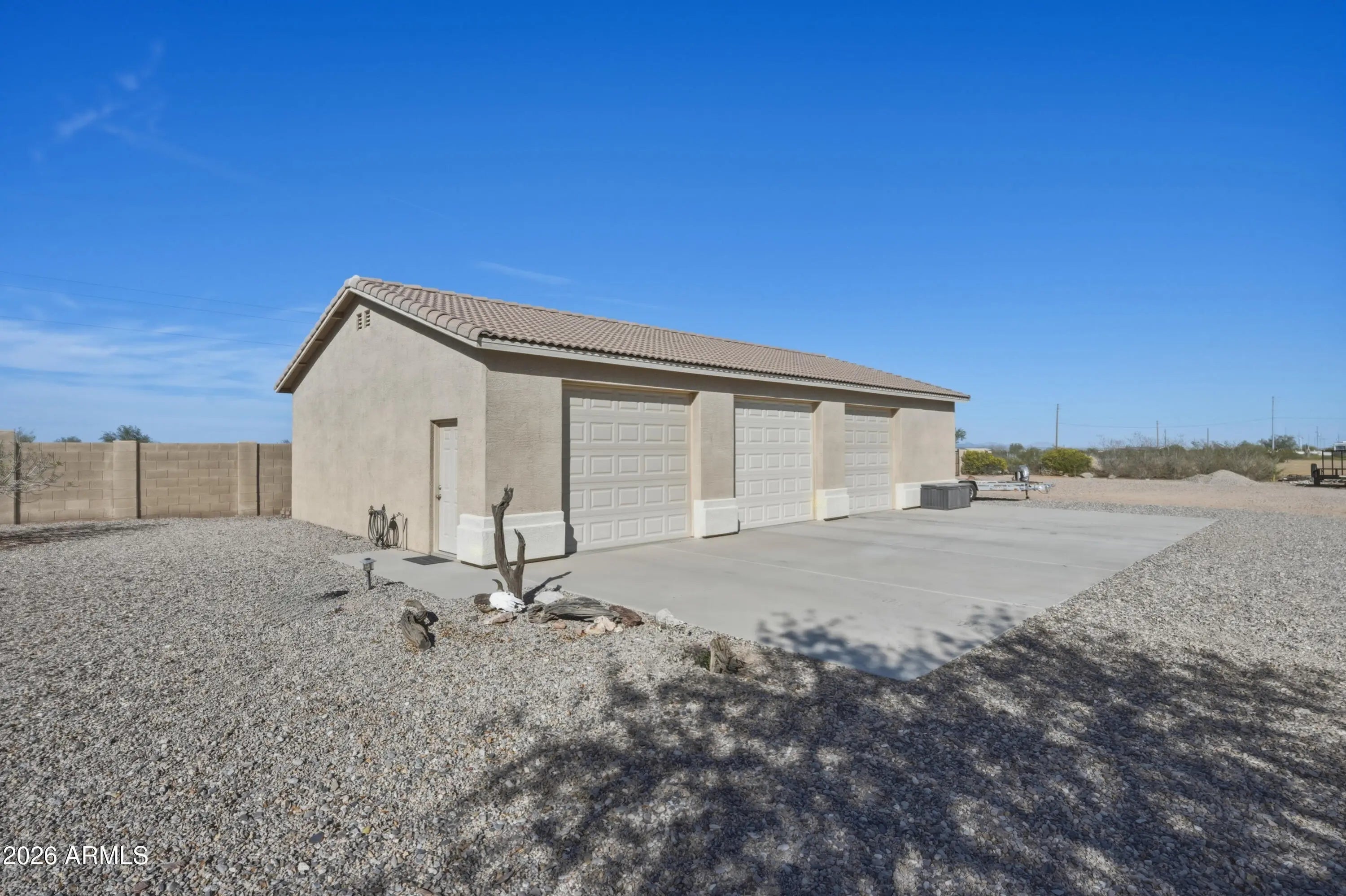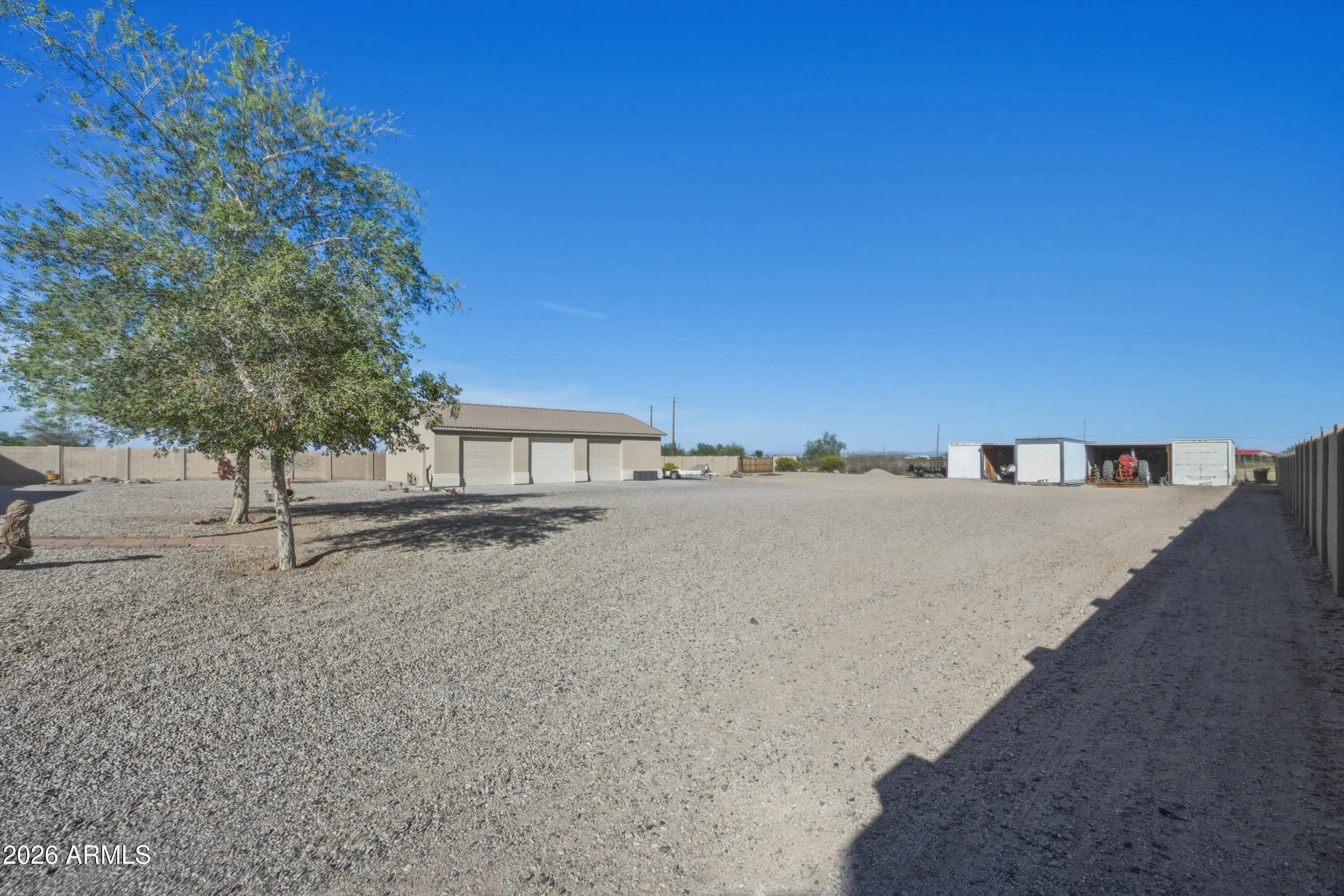 Welcome to wide open space and endless possibilities in Maricopa! Situated on 1.25 fully fenced acres, this property offers the perfect blend of comfort, functionality, and room to live the lifestyle you've been looking for. From the moment you arrive, you'll appreciate the convenience of the RV gate with direct road access, plus dedicated RV electric and water hookups -- ideal for your toys, guests, or extended stays. Car enthusiasts, hobbyists, and business owners will love the incredible garage setup: a 2-car attached garage PLUS a 3-car detached garage featuring one bay fully outfitted as a workshop with 10-foot ceilings, 220 wiring, abundant lighting, ceiling fan, built-in cupboards, and attic storage. Whether you're working on projects or need serious storage space, this setup delivers. Inside, the thoughtfully designed split floor plan offers 3 bedrooms and 2 bathrooms with both comfort and privacy in mind. The kitchen features Corian countertops, a newer stove and dishwasher, and opens seamlessly into the living space with built-in fireplace and 11 ft ceilings. The formal dining room offers flexibility as a den, office, or bonus room to suit your needs. The primary suite is a true retreat, complete with private patio access leading to the spa, a spacious ensuite bathroom with separate oversized soaking tub and large walk-in shower, dual vanities, and a generous walk-in closet. Additional upgrades and features include: $17,000 in brand new windows Reverse Osmosis system & water softener All newer faucets throughout Good-sized laundry room with extra refrigerator (included) LG front-load washer & dryer (included) Hot tub for relaxing evenings The East/West lot orientation provides an East-facing backyard for cooler shaded afternoons on the patio, while the front of the home captures breathtaking Arizona sunsets. If you've been searching for acreage, garage space, RV accommodations, and a well-maintained home -- all in one -- this one checks the boxes.