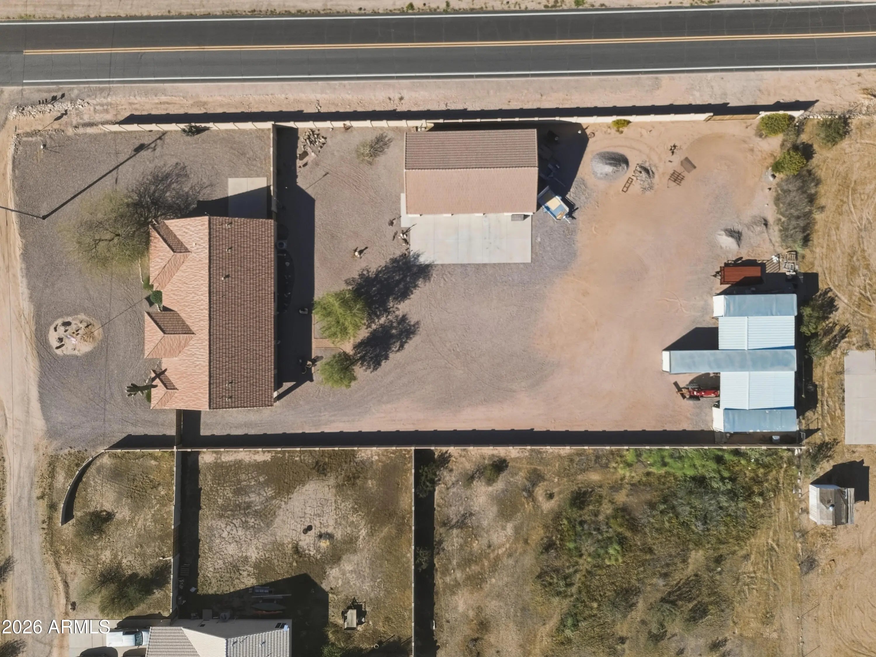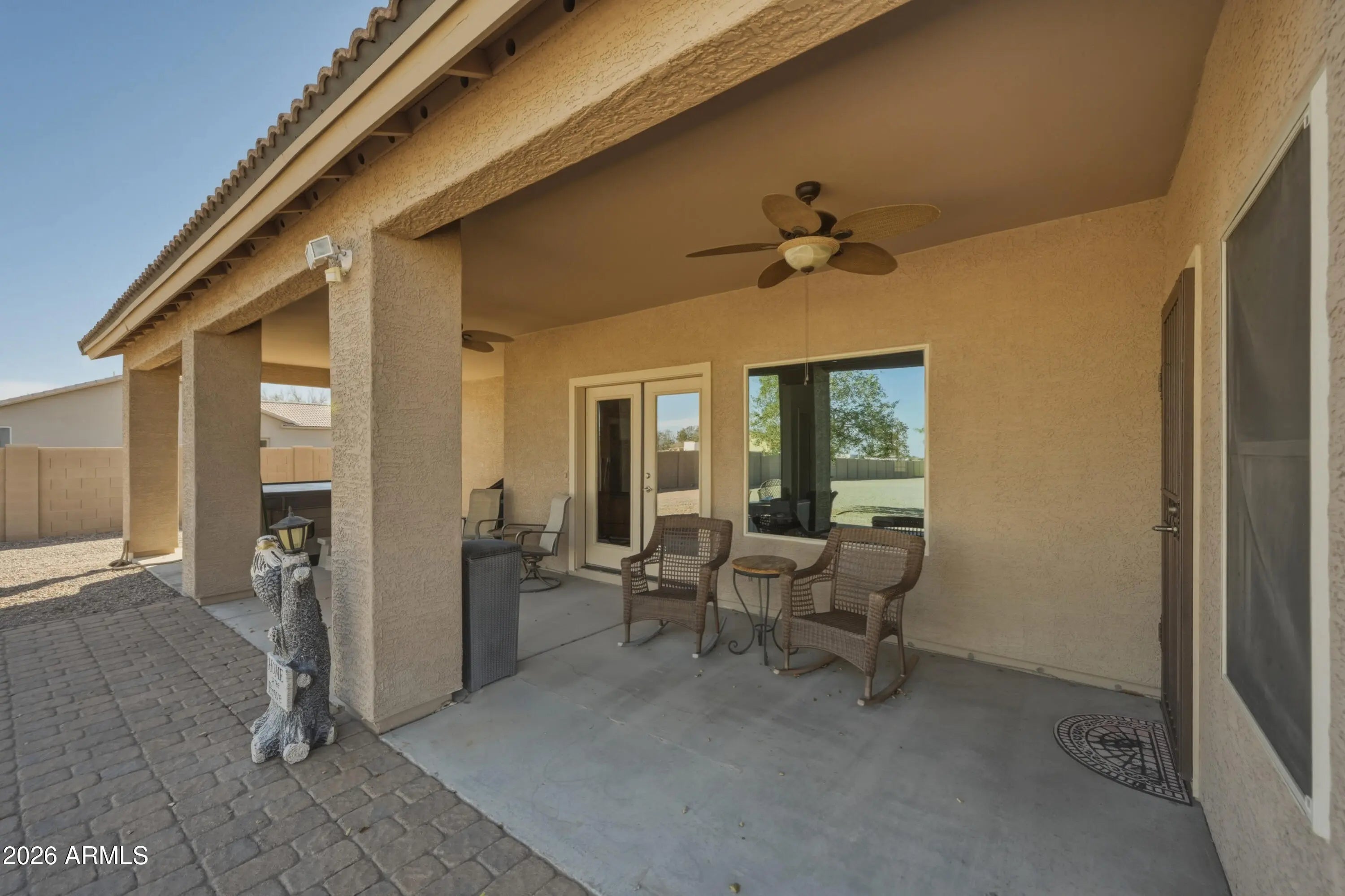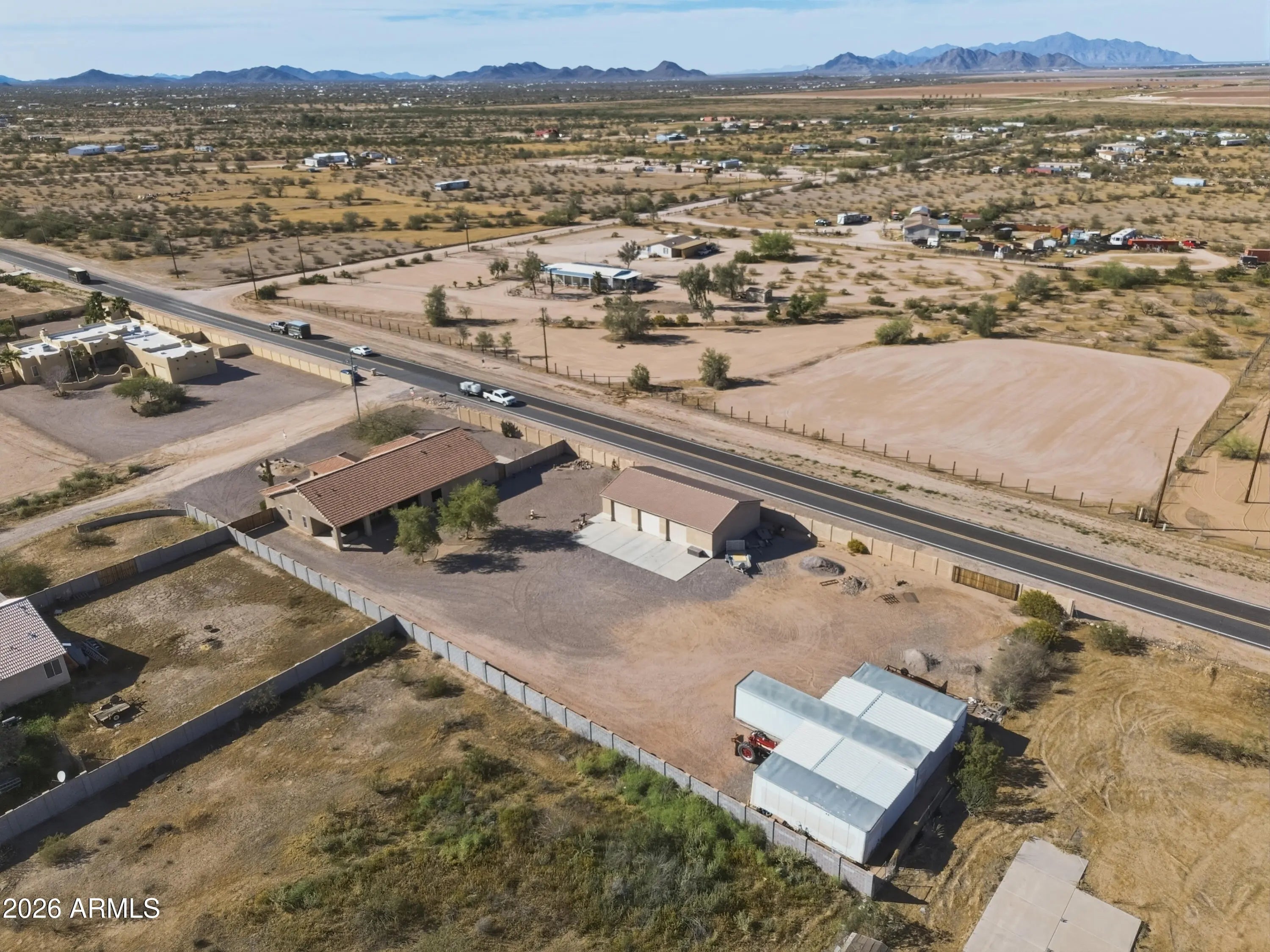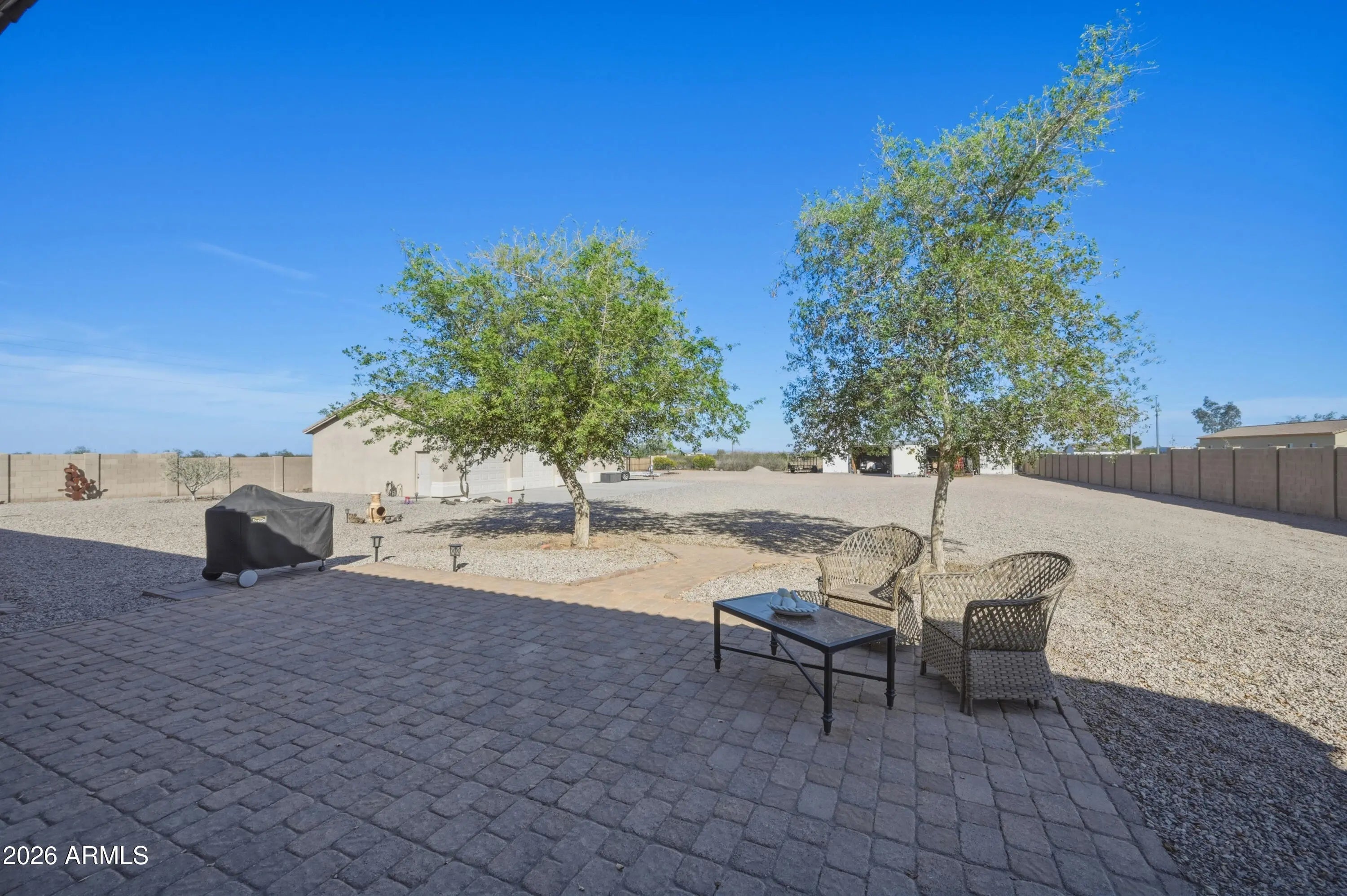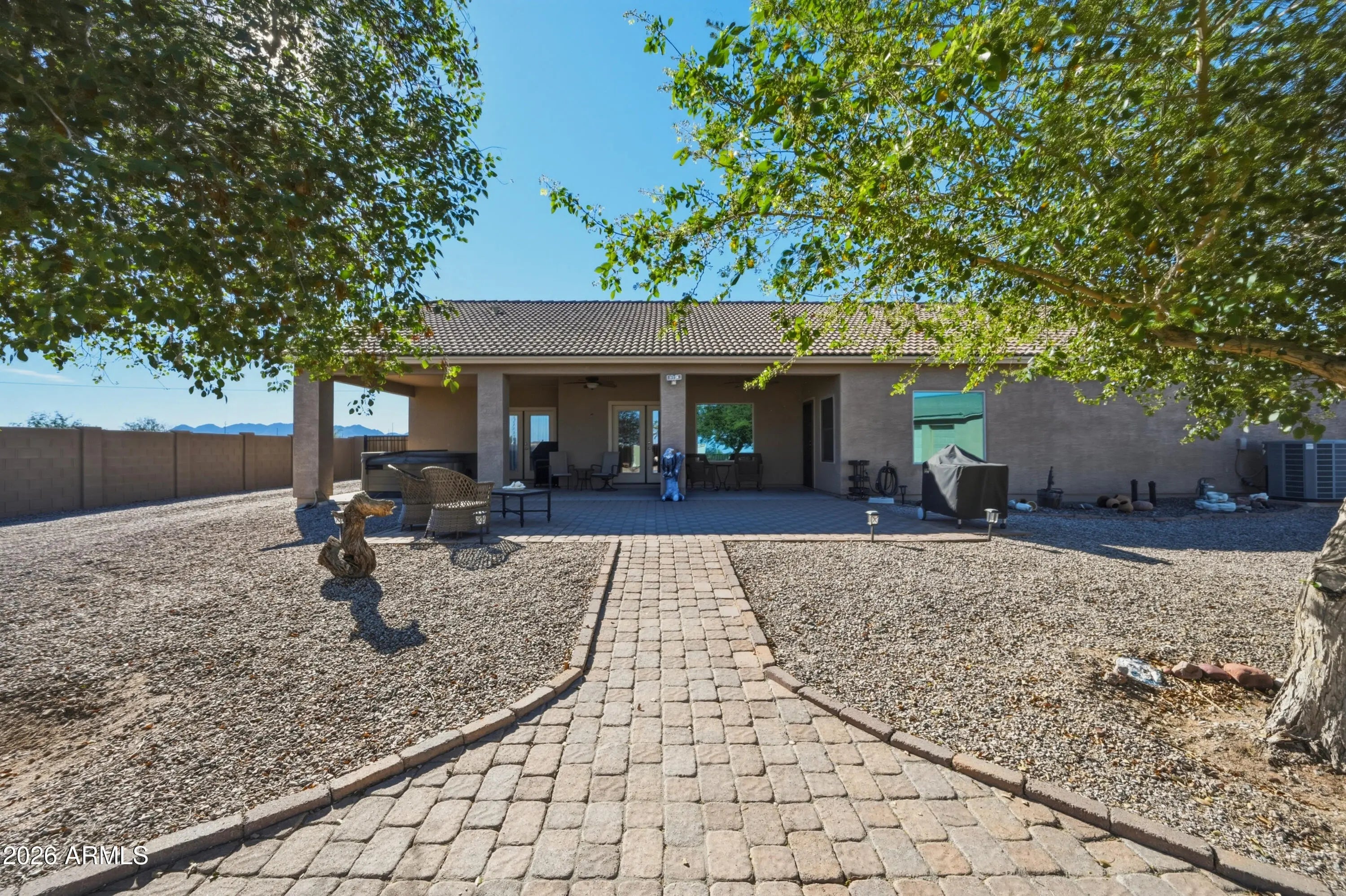 Welcome to wide open space and endless possibilities in Maricopa! Situated on 1.25 fully fenced acres, this property offers the perfect blend of comfort, functionality, and room to live the lifestyle you've been looking for. From the moment you arrive, you'll appreciate the convenience of the RV gate with direct road access, plus dedicated RV electric and water hookups -- ideal for your toys, guests, or extended stays. Car enthusiasts, hobbyists, and business owners will love the incredible garage setup: a 2-car attached garage PLUS a 3-car detached garage featuring one bay fully outfitted as a workshop with 10-foot ceilings, 220 wiring, abundant lighting, ceiling fan, built-in cupboards, and attic storage. Whether you're working on projects or need serious storage space, this setup delivers. Inside, the thoughtfully designed split floor plan offers 3 bedrooms and 2 bathrooms with both comfort and privacy in mind. The kitchen features Corian countertops, a newer stove and dishwasher, and opens seamlessly into the living space with built-in fireplace and 11 ft ceilings. The formal dining room offers flexibility as a den, office, or bonus room to suit your needs. The primary suite is a true retreat, complete with private patio access leading to the spa, a spacious ensuite bathroom with separate oversized soaking tub and large walk-in shower, dual vanities, and a generous walk-in closet. Additional upgrades and features include: $17,000 in brand new windows Reverse Osmosis system & water softener All newer faucets throughout Good-sized laundry room with extra refrigerator (included) LG front-load washer & dryer (included) Hot tub for relaxing evenings The East/West lot orientation provides an East-facing backyard for cooler shaded afternoons on the patio, while the front of the home captures breathtaking Arizona sunsets. If you've been searching for acreage, garage space, RV accommodations, and a well-maintained home -- all in one -- this one checks the boxes.