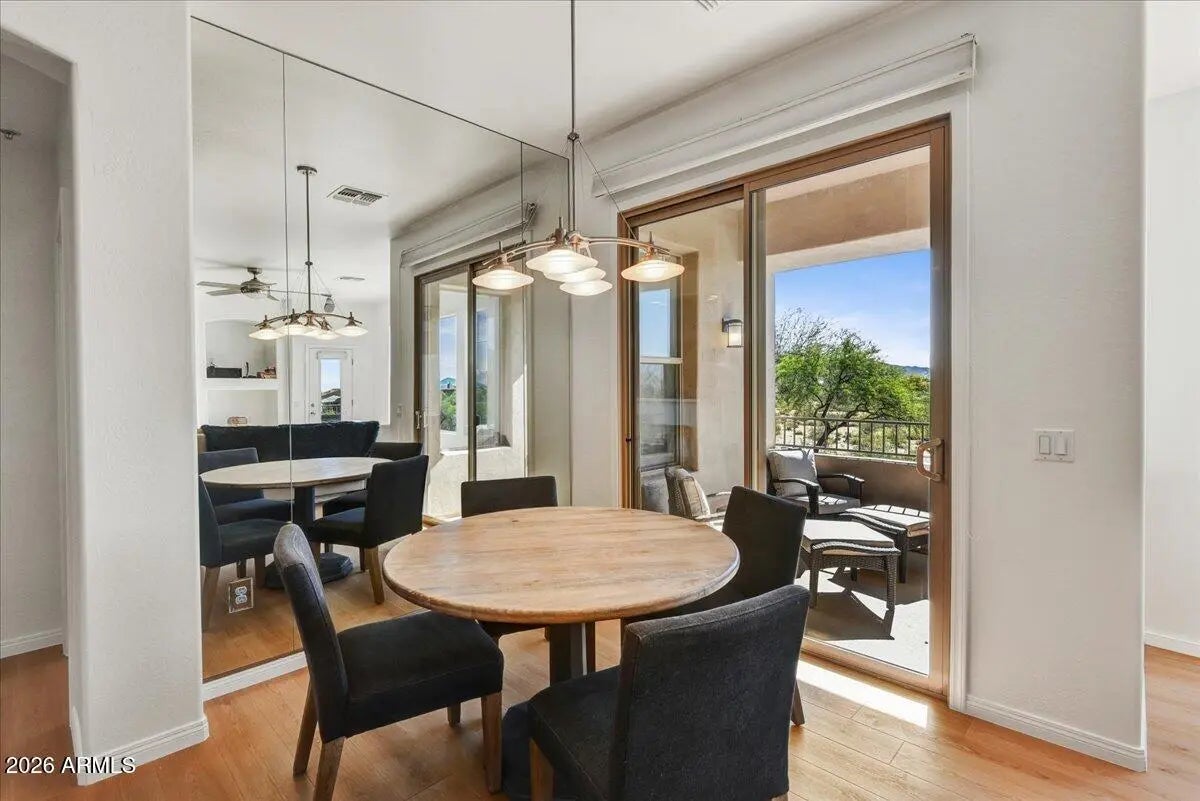 Don't miss this remodeled corner unit in Tesoro that exemplifies the Grayhawk lifestyle! Don't miss the pool, workout room. library, walking paths and tennis courts. Relax and enjoy the views of downtown Scottsdale and the McDowell Mountains from two balconies. This unit is beautifully maintained (A/C replaced in 2024) and is full of natural light, new wood floor and kitchen appliances, it feels new and fresh. The attached oversized two car garage is super convenient and offers extra storage. This one checks ALL the boxes and is great for those looking to downsize or wanting an effortless seasonal home.