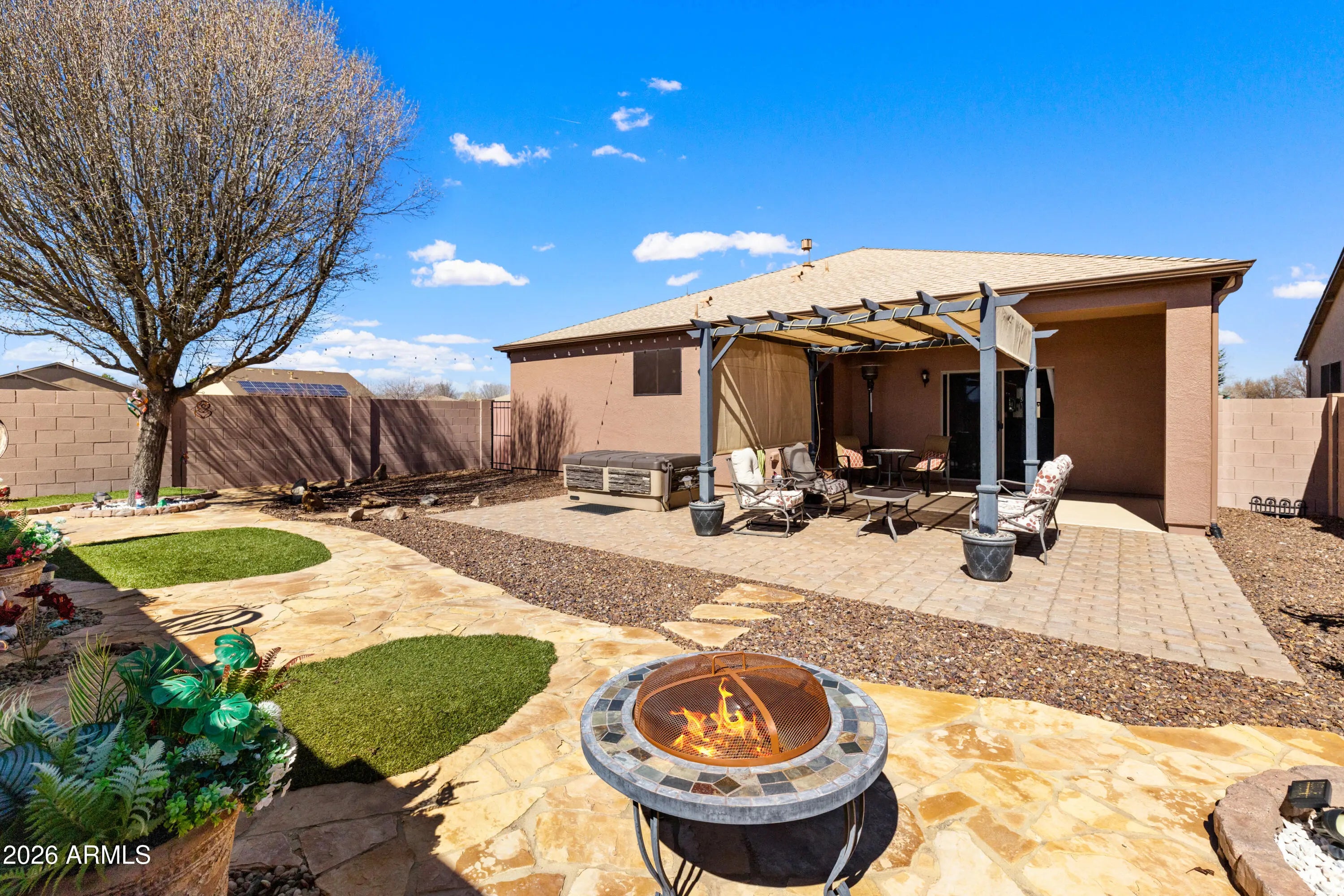 Come fall in love with this lovingly maintained home with many recent updates. This beautiful 3-bedroom, 2-bath, 1804 sf home offers comfort, style, and peace of mind with many recent improvements, including a new HVAC (2026,) roof and gutters(2020), hot water heater(2020), solar screens, and updated appliances. Inside, lovely engineered hardwood floors and ceramic tile throughout--no carpet. The inviting great room features a cozy gas fireplace and flows into the spacious kitchen and dining area with French doors opening to a charming paver courtyard. Step out back to an amazing retreat with a hot tub, extended paver patio and pergola--perfect for relaxing or entertaining. This home backs to open space, offering added privacy along with views. One owner holds an active real estate license