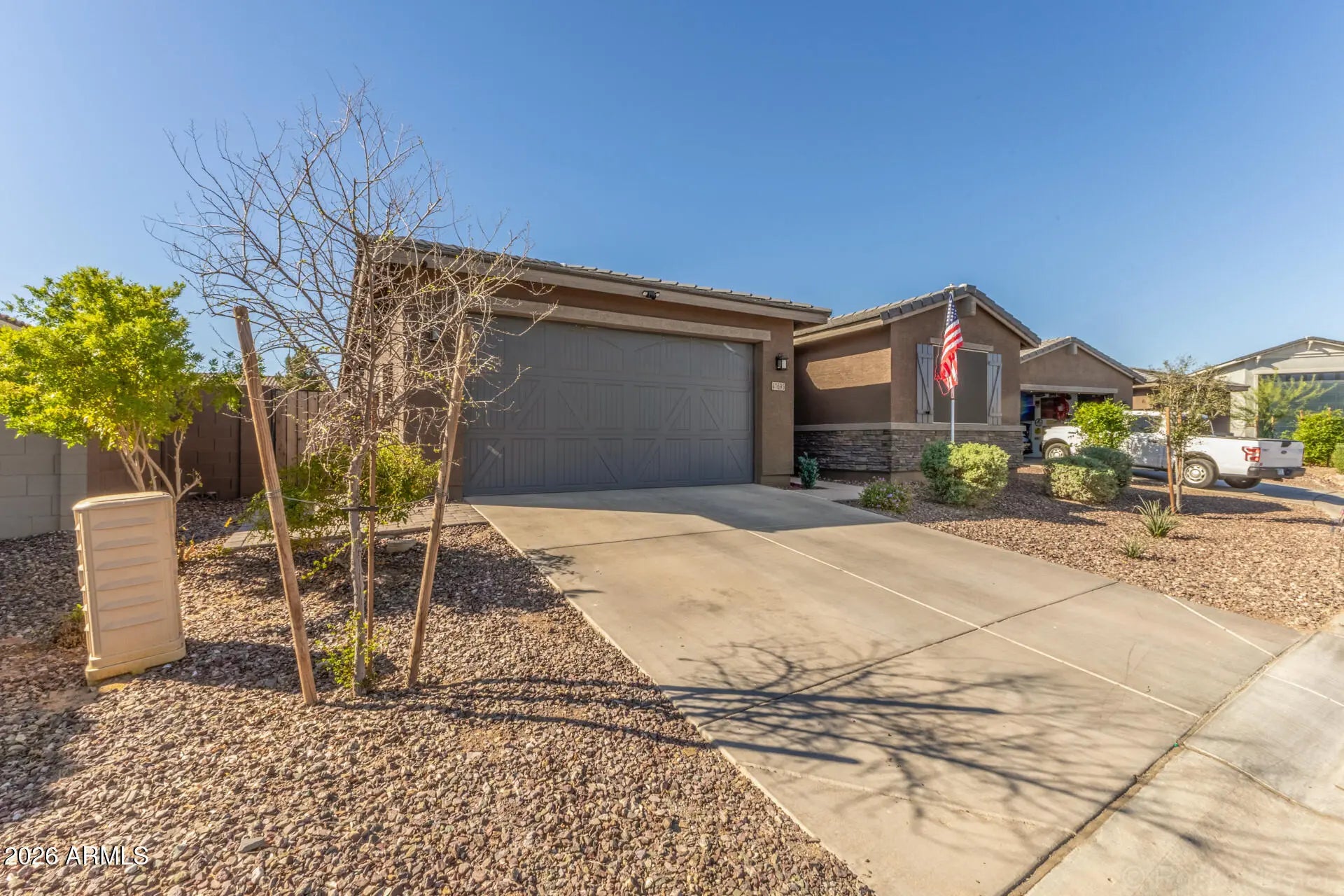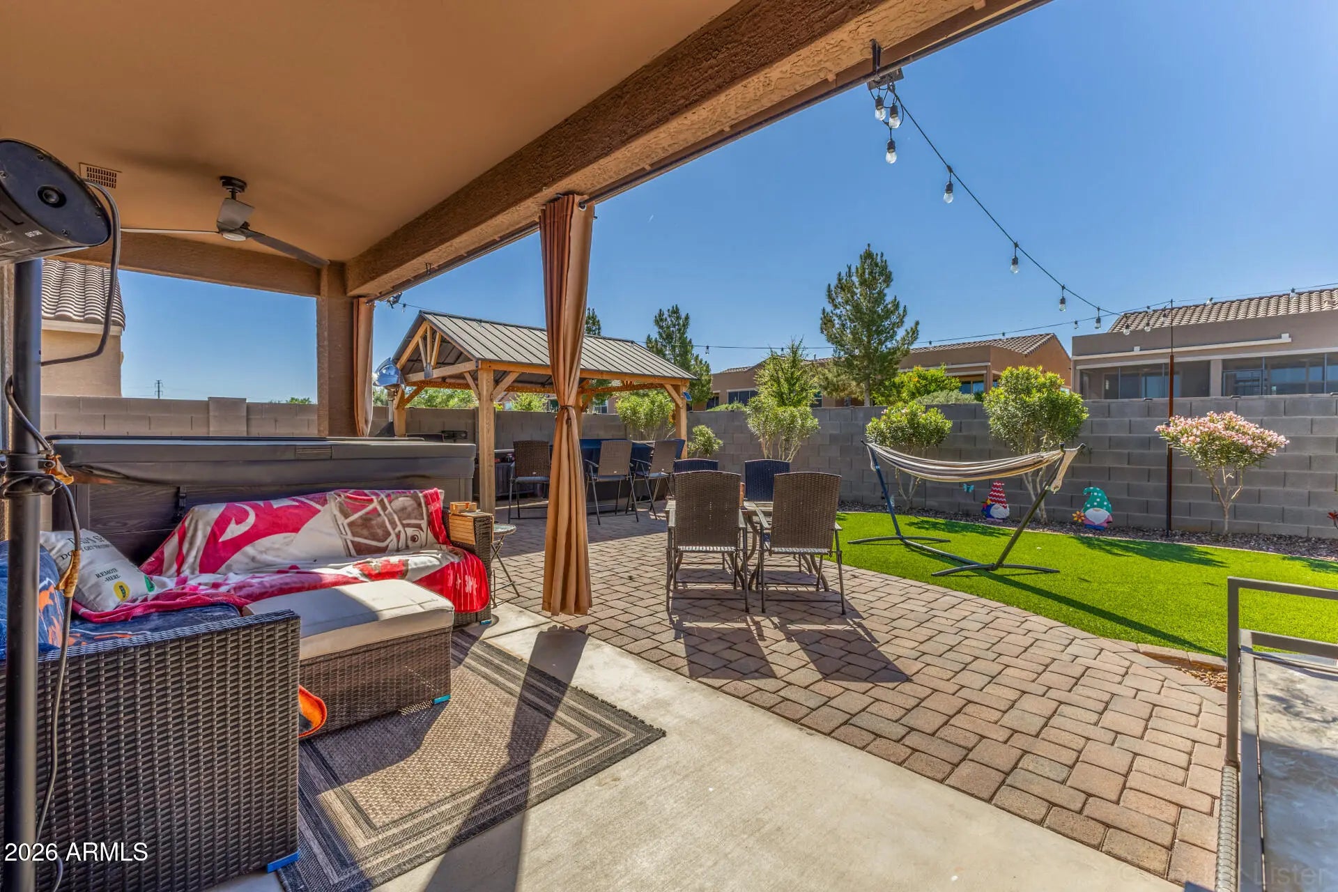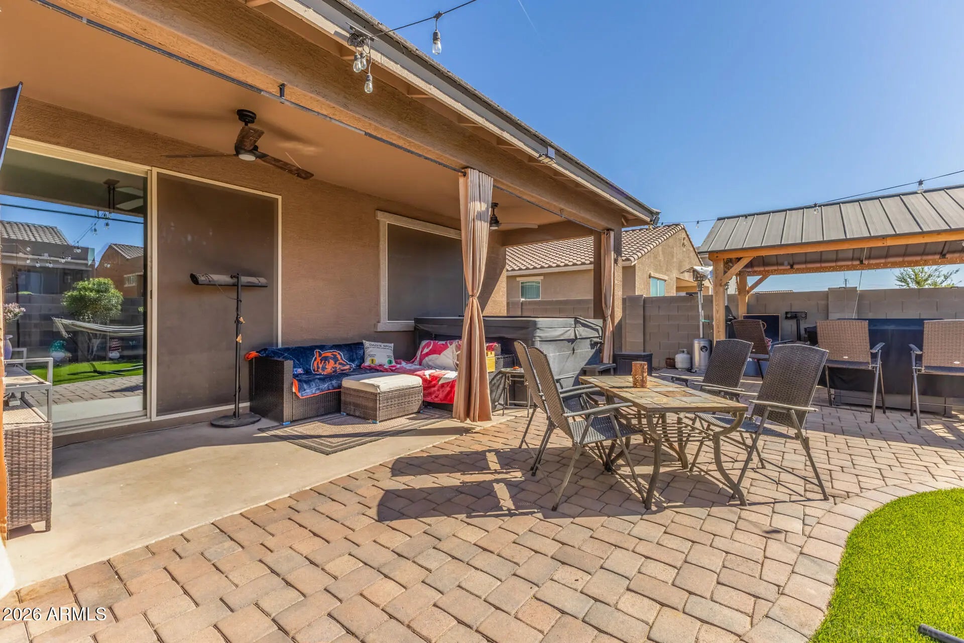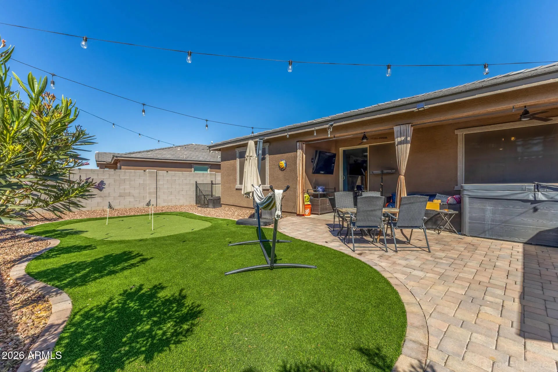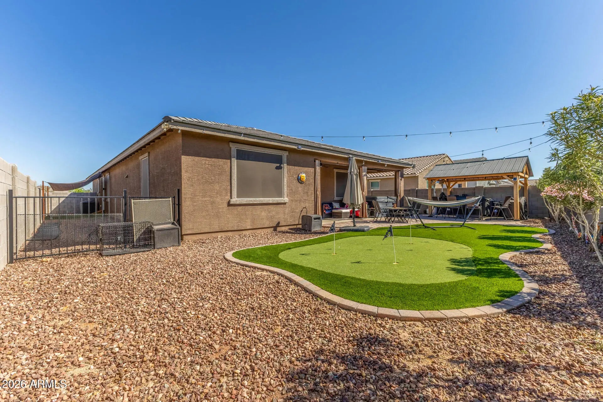 Beautifully upgraded 4 bed, 3 bath single-story home offering 2,342 sq ft of thoughtfully designed living space. This 2-year-old, energy-efficient home offers peace of mind with newer appliances, roof, and HVAC, so buyers can feel confident knowing the major components are already taken care of. It includes a mother-in-law suite with en-suite bath and walk-in closet and a flex space perfect as a teen room or second living area. The open-concept floor plan features 9' ceilings, high-end stainless steel appliances, a farmhouse-style stainless kitchen sink, a walk-in pantry, and a guest bath with dual vanities. Step outside to a fully landscaped backyard with turf, an extended paver patio, gazebo, and putting green, plus a 5-person spa that is only 2 years old - perfect for relaxing or entertaining. The gated side yard dog run includes turf and a sun shade. This home has smart home features, including the thermostat, security system, front door, and light switches in all rooms, along with shade screens on all windows and wiring for an EV charger. Located in a community that offers Maricopa's small-town charm, with nearby shopping, dining, and entertainment just minutes away. Don't miss the opportunity to make this home yours!!!