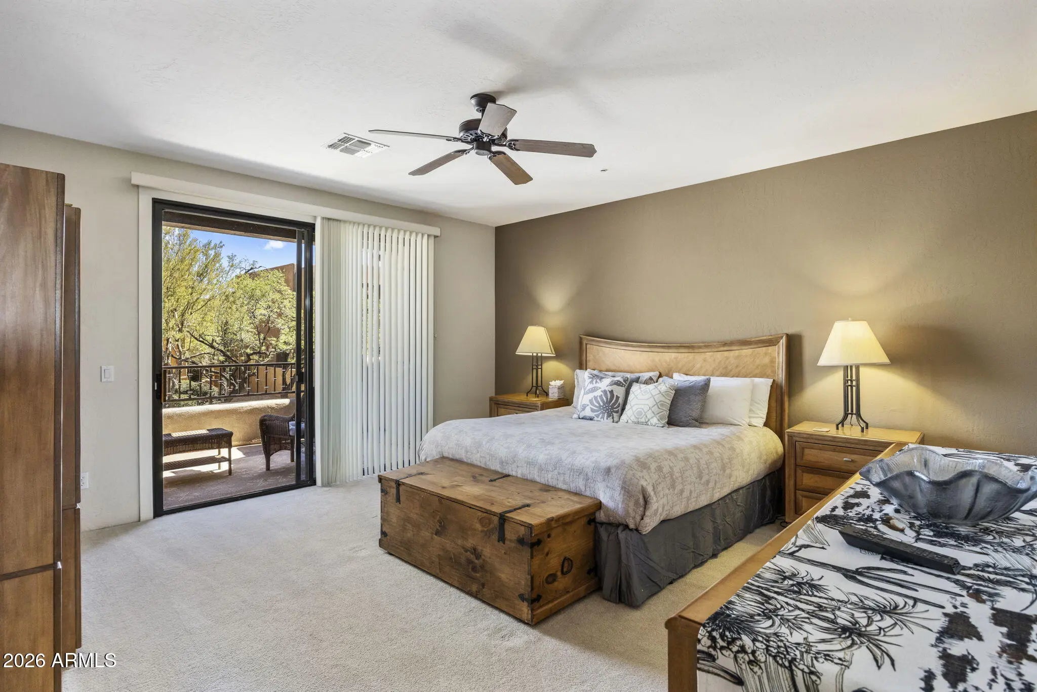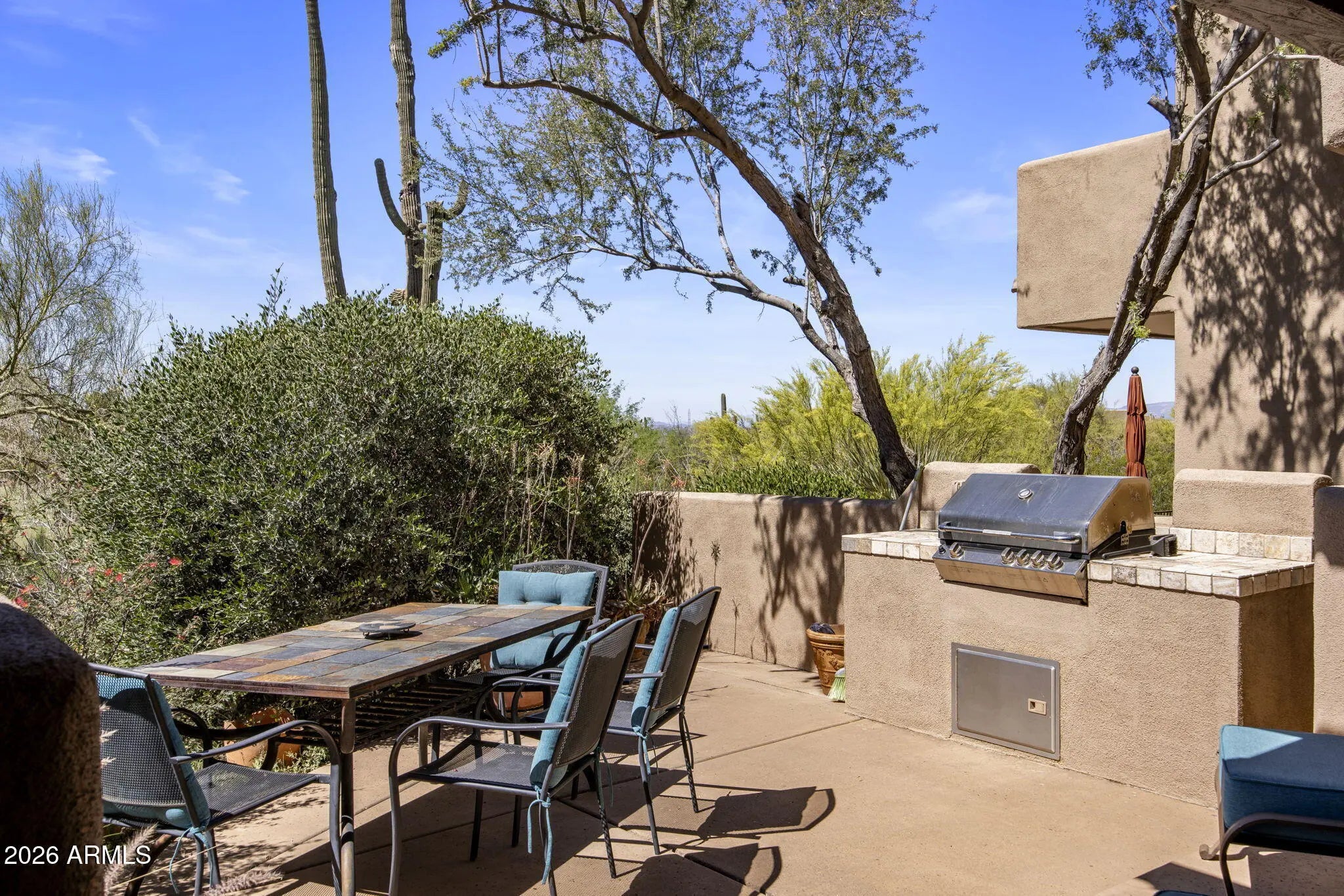Perched in the heart of Troon North and offered fully furnished, this beautifully maintained 2 bedroom + flex space, 2.5 bath townhome captures sprawling golf course and mountain views from multiple outdoor living spaces. Designed for easy living, it's the perfect lock-and-leave retreat or full-time residence in one of North Scottsdale's most desirable areas. Inside, the home features tall ceilings, dual primary bedrooms, solid core 8-foot doors, granite kitchen countertops, and a cozy gas fireplace. Recent updates include a newer roof and HVAC, providing peace of mind for years to come. The property also offers an attached 2-car garage and an outdoor entertaining area complete with a built-in grill--ideal for enjoying Arizona sunsets over the fairways and surrounding mountains.