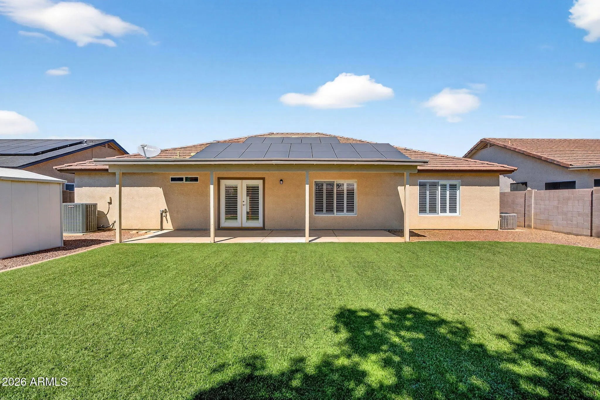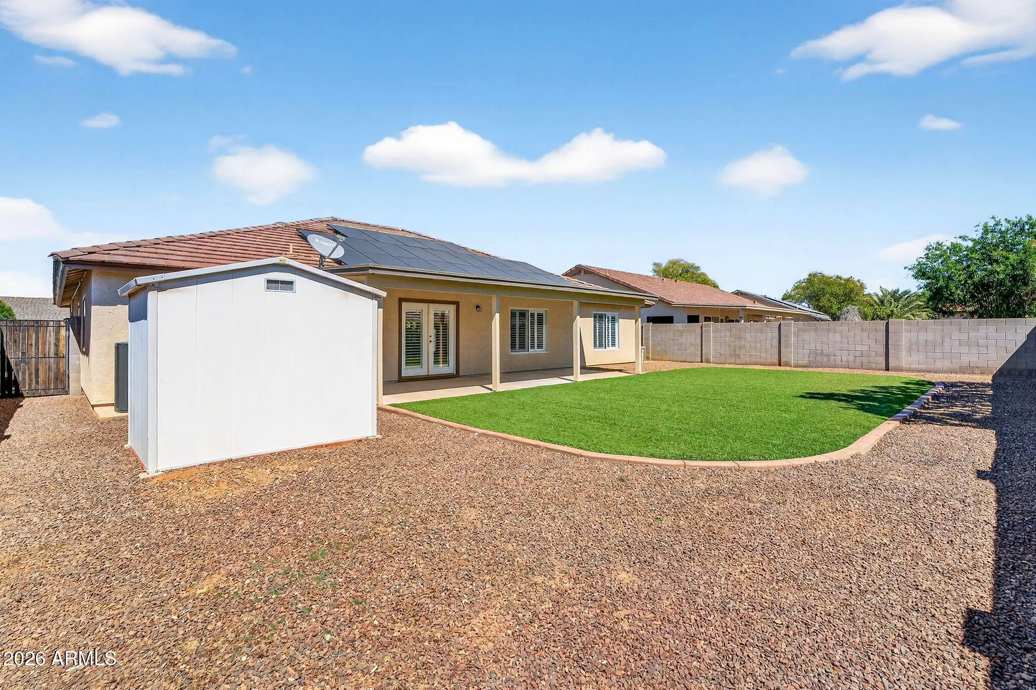 OWNED Solar $100K+, NEW roof, remodeled kitchen/baths + single-story neighbors! Recently remodeled with NEW flooring, NEW quartz kitchen counters, backsplash, & NEW tile bathroom floors. Other upgrades include a NEW water heater, owned water softener, insulated garage, added attic/garage ceiling insulation, custom 3 Day Blinds shutters, & a beautifully remodeled primary shower completed in 2023. Roof improvements include approximately 3/4 replaced with a rubberized backing system for enhanced longevity plus a transferable 15-year warranty. Enjoy little to no electric bill with the massive owned solar system. Spacious floor plan, split primary suite, covered patio, storage shed, & low-maintenance artificial turf in both the front & back yards. You get to simply move in & enjoy the benefits!