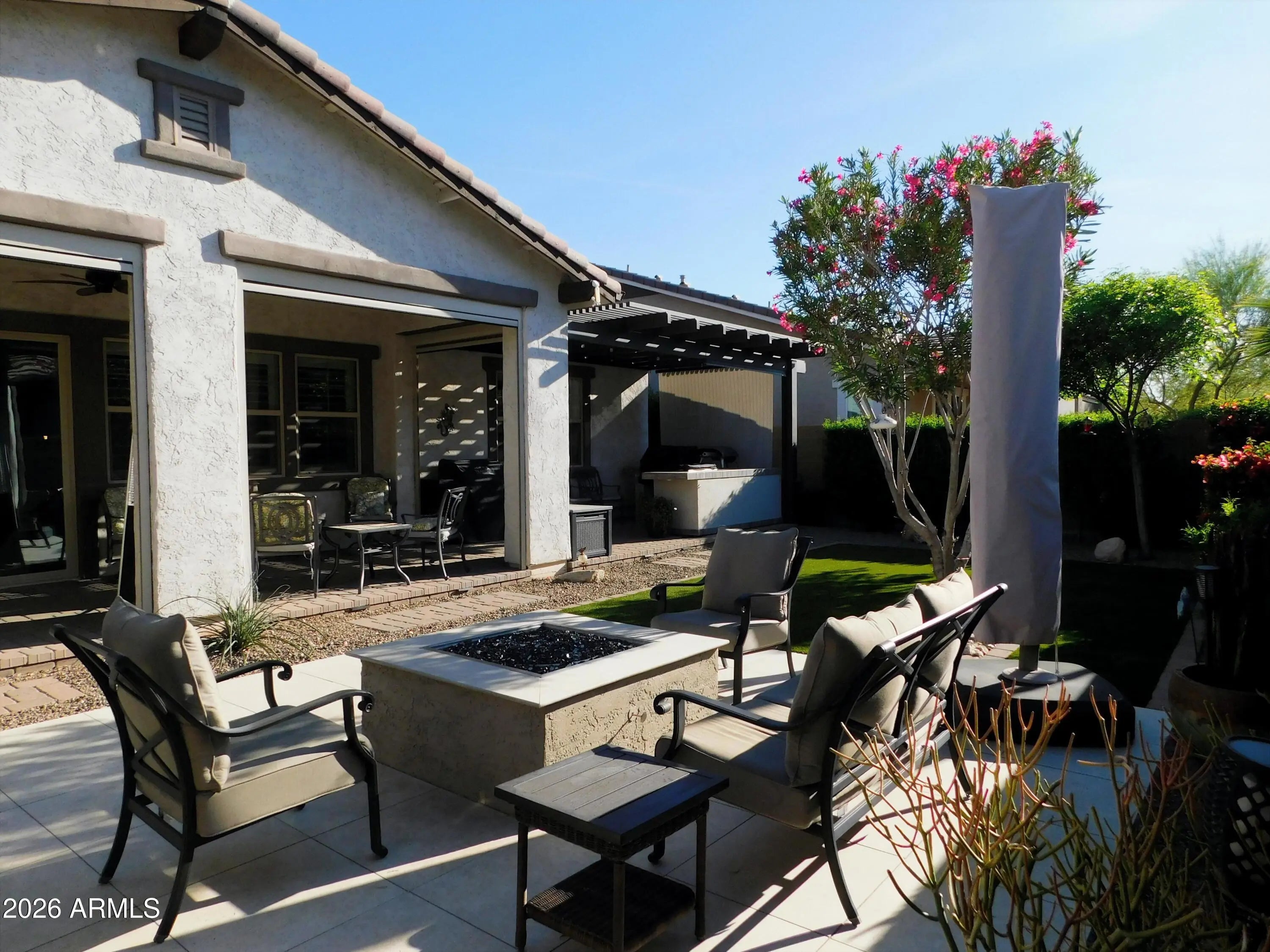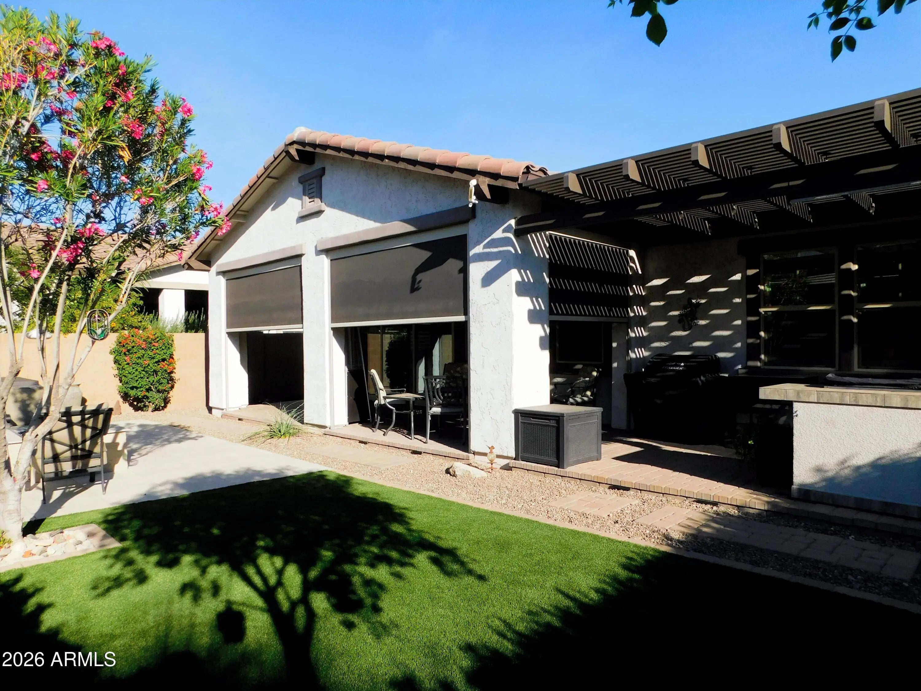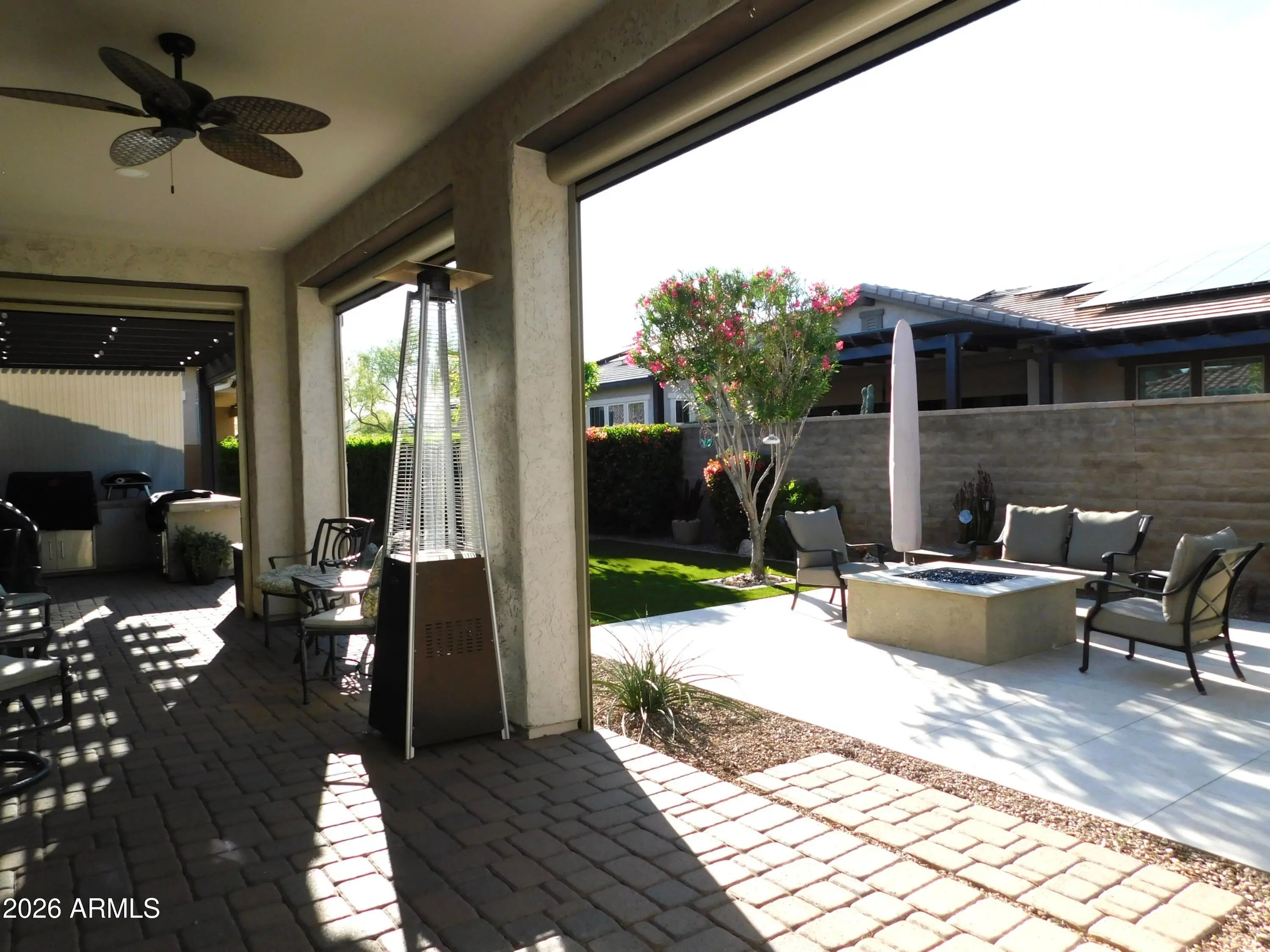 Professional photos coming soon!!! VICTORY is yours!! Stunning 2 bed 2 bath house with office has been pampered! Tile everywhere but bedrooms which had new carpet installed 2 years ago. Beautiful kitchen with wall oven/convection oven and microwave. Gas cook top accented by granite counters. Owners suite has walk in shower with rain fixture as well as a wall fixture! Dual vanities and huge walk in closet too!! Your new backyard is literally an OASIS of comfort! From the newly remodeled fire pit, to the new pavers that surround it, coupled with the motorized sun shades on the patio and the recently installed BBQ island, you can enjoy outdoor living all year long! Inside will be just as comfortable with PAID OFF SOLAR!! Your garage floor was recently epoxy coated as well!