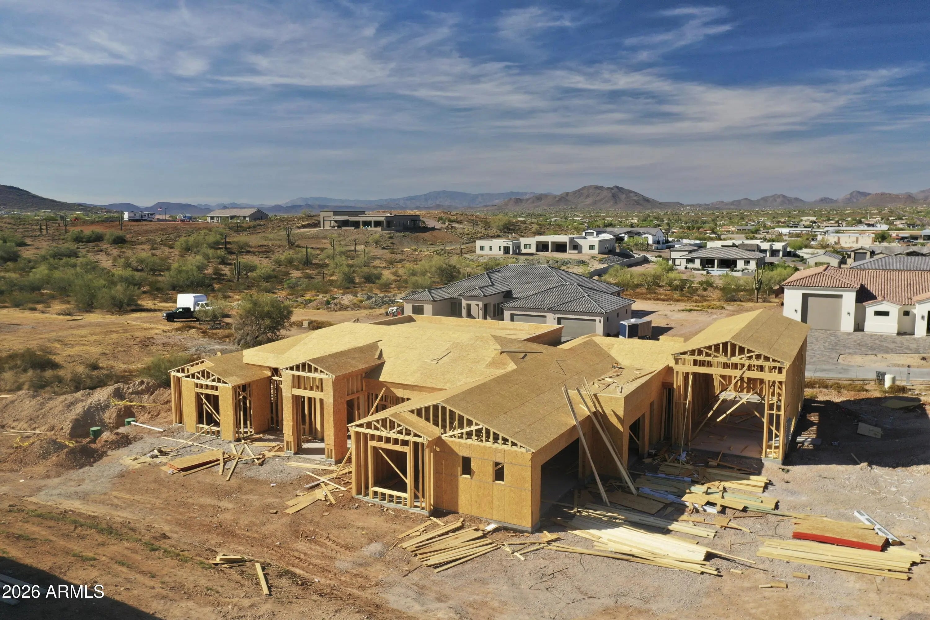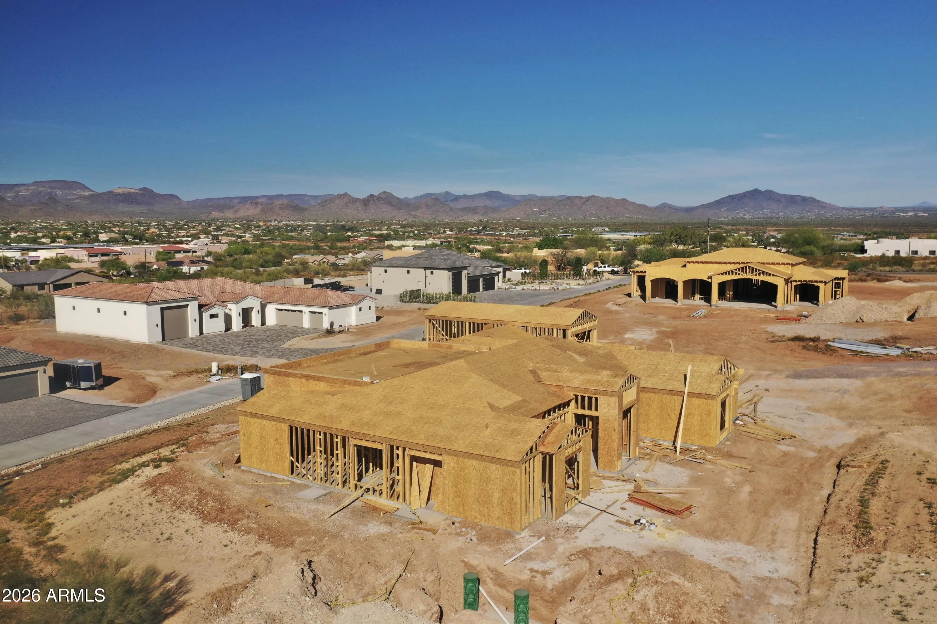Construction is officially underway on this stunning new custom home featuring jaw-dropping finishes and an attached RV garage. Perched on an elevated 1-acre lot with full block fencing, no HOA, and breathtaking views of Cave Creek Peak and Pyramid Peak, this property truly stands apart. Inside, the gourmet kitchen impresses with upgraded appliances, upgraded cabinetry, quartz countertops, a massive center island, and a walk-in pantry complete with cabinetry and counter space. The spacious great room showcases a dramatic sliding glass wall that opens to the outdoors and a beautiful stone fireplace centerpiece. Luxury continues throughout the home with custom tile showers, wide-plank wood flooring, a freestanding soaking tub in the owner's suite, and countless designer touches.