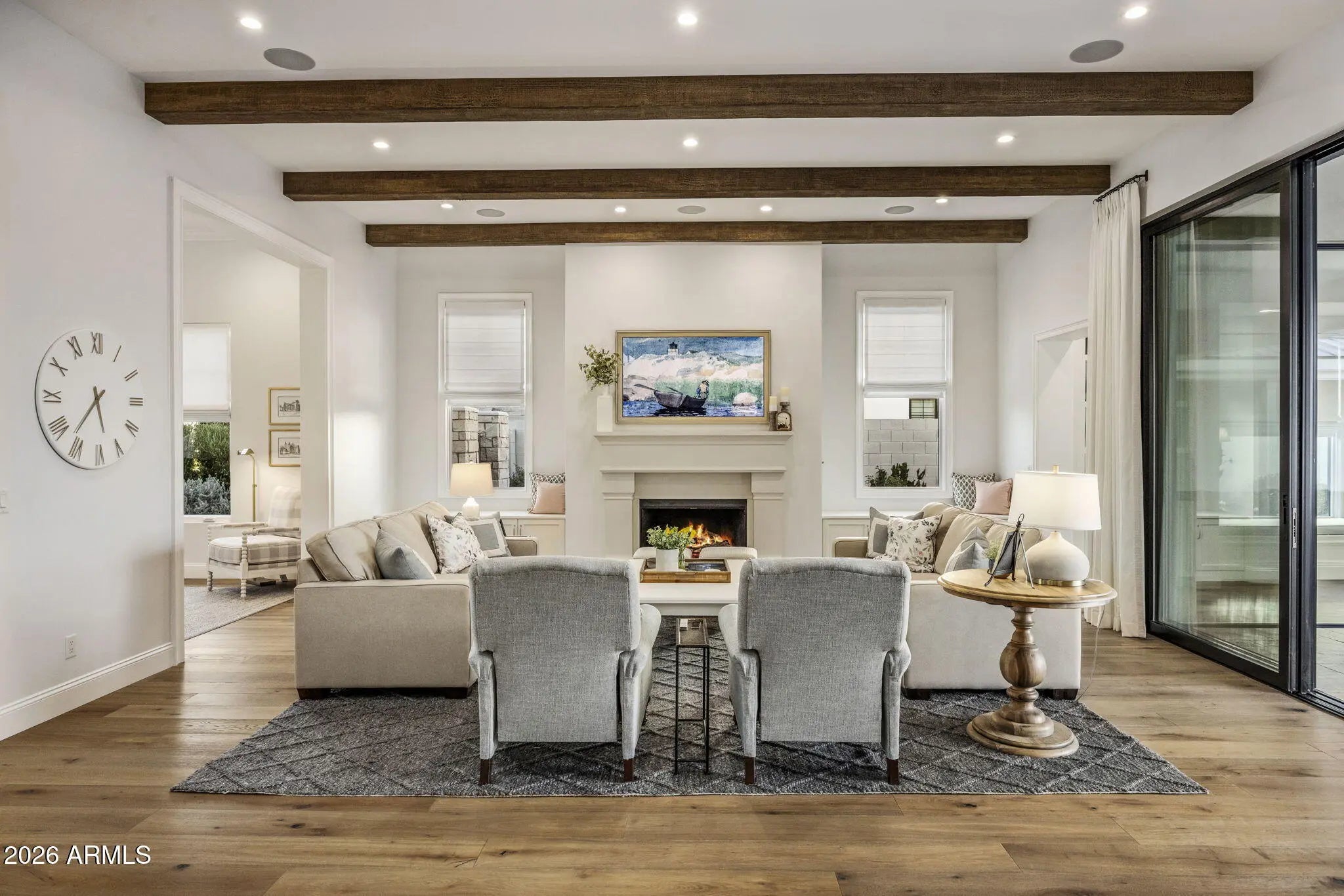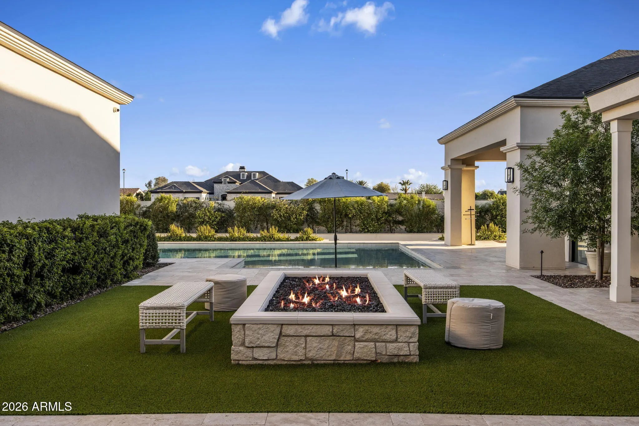 Experience refined luxury in this custom estate within Gilbert's gated Landmark at Somerset. 4,731 sq ft of light-filled living showcases expansive Windsor sliding glass walls, rich hardwood floors, and a chef's kitchen featuring a Wolf range, dual refrigerator/freezer, farmhouse sink, and butler's pantry. The thoughtful split floor plan offers 4 bedrooms and 4.5 baths, with a luxurious primary suite retreat featuring a soaking tub and separate shower. Designed for effortless entertaining, the home opens to more than 1,500 sq ft of covered outdoor living with travertine patios, outdoor kitchen, resort-style pool, and firepit. Includes a separate family room and optional exercise room for additional living. A private auto court and four-car garage complete this exceptional offering.
