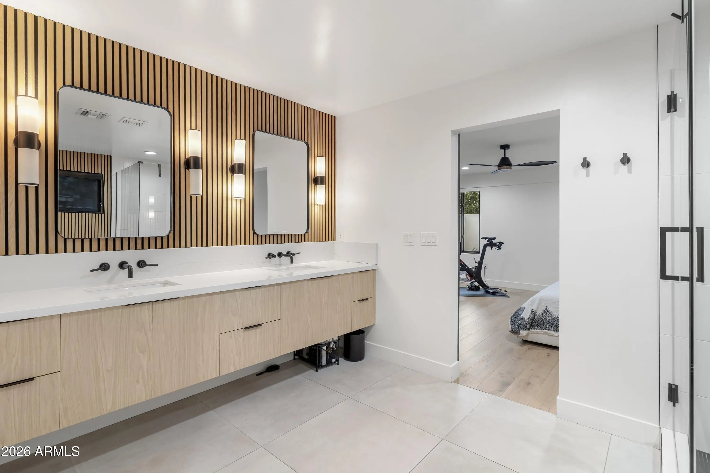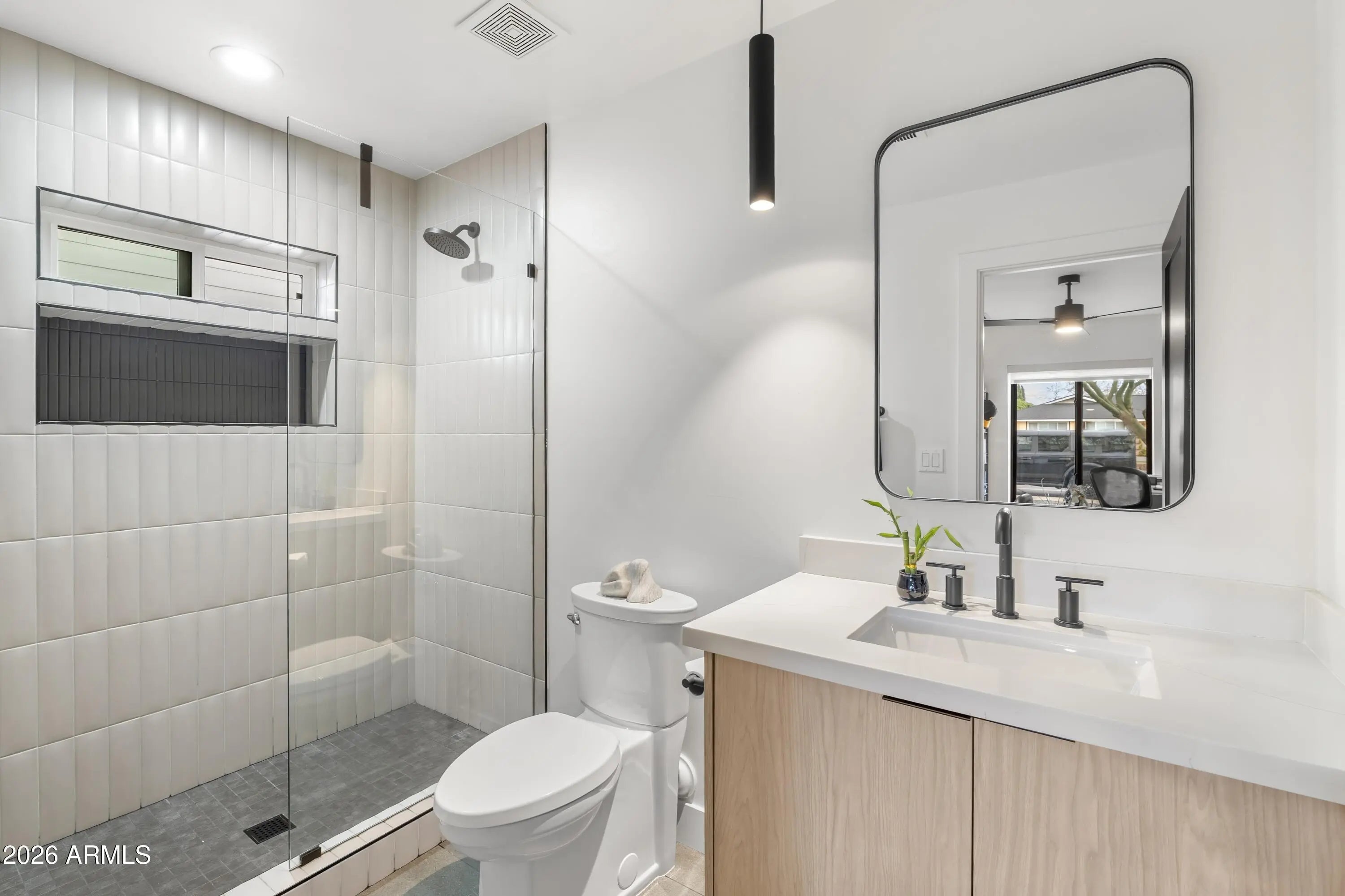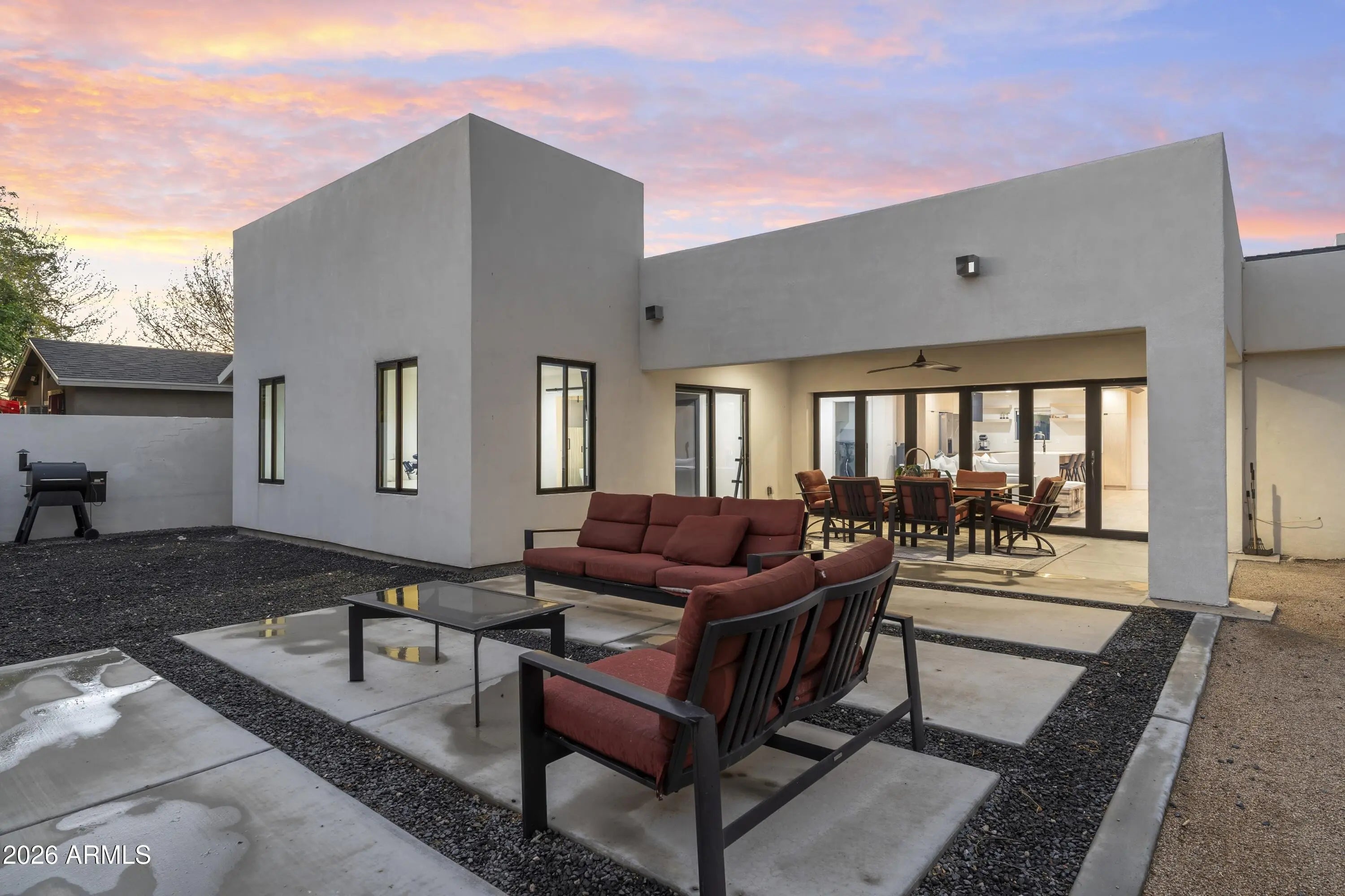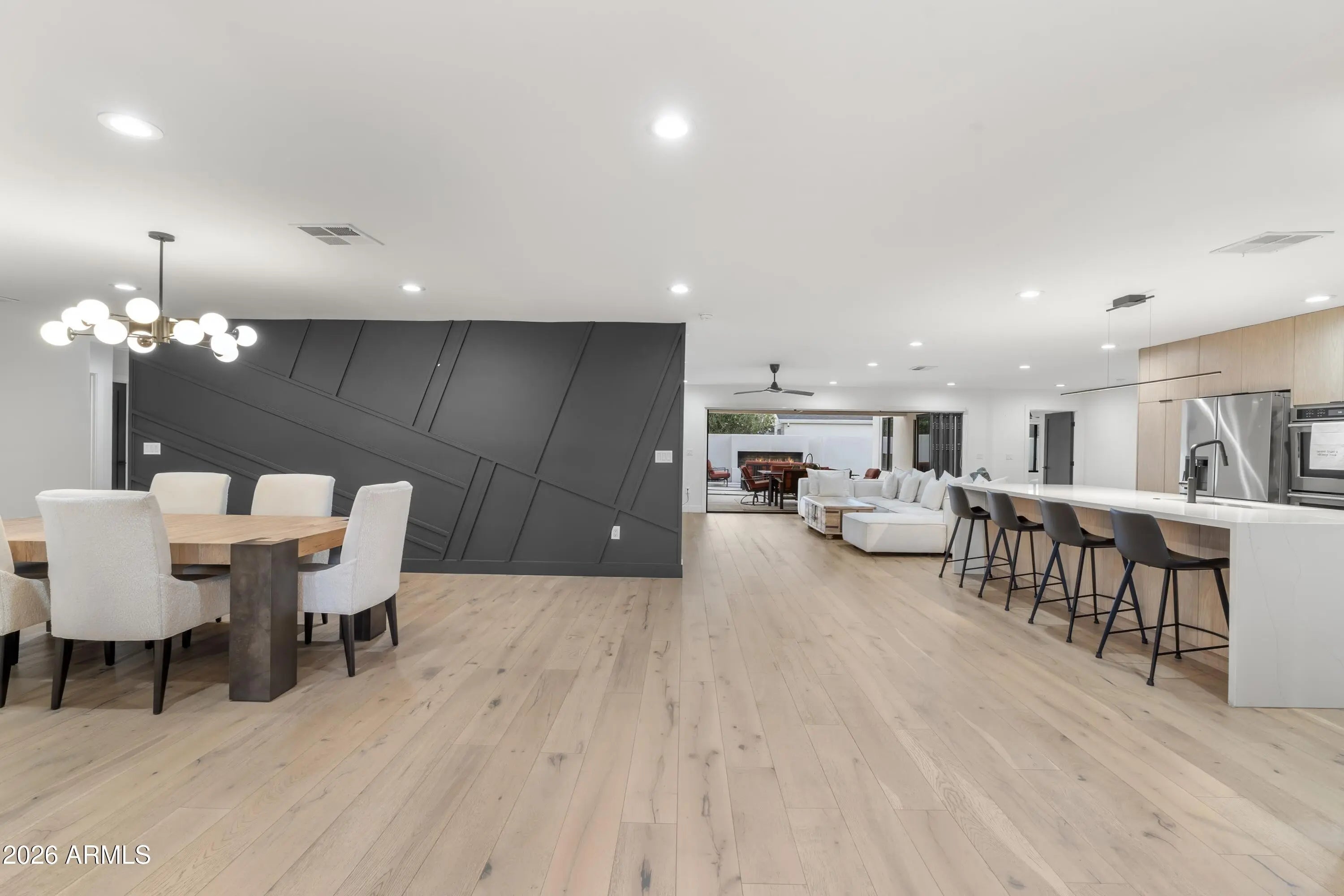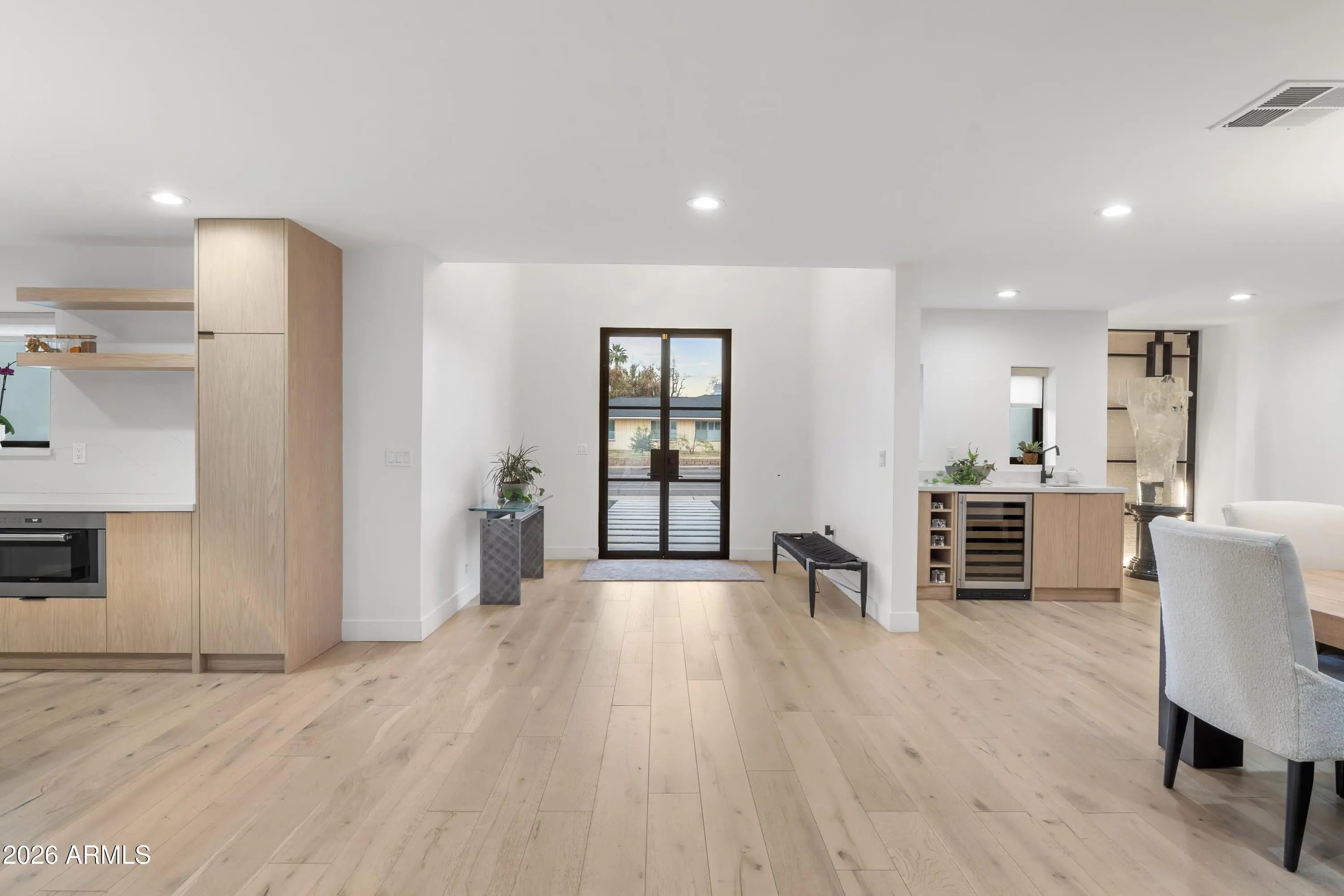 Completely reimagined for contemporary living in sought-after Lower Arcadia, this refined residence offers approximately 3,270 square feet with a true split plan, featuring a generous primary suite and four guest bedrooms. Designed for effortless indoor-outdoor flow, stacking glass doors open to a backyard poised for a resort-style pool addition, framed by a custom fireplace for quiet Arcadia evenings. Inside, a sculptural wine and spirits display adds a gallery-like focal point, complementing the home's clean lines and curated finishes. The kitchen is appointed with all-new premium appliances from KitchenAid, Miele, and Wolf, while the behind-the-walls essentials have been fully refreshed with new plumbing, wiring, electrical, roofing, and HVAC. An extra-deep two-car garage provides abundant storage and everyday practicality. Located in a neighborhood where no two-story homes are permitted, this offering pairs privacy and light with modern design in one of Phoenix's most desirable settings.