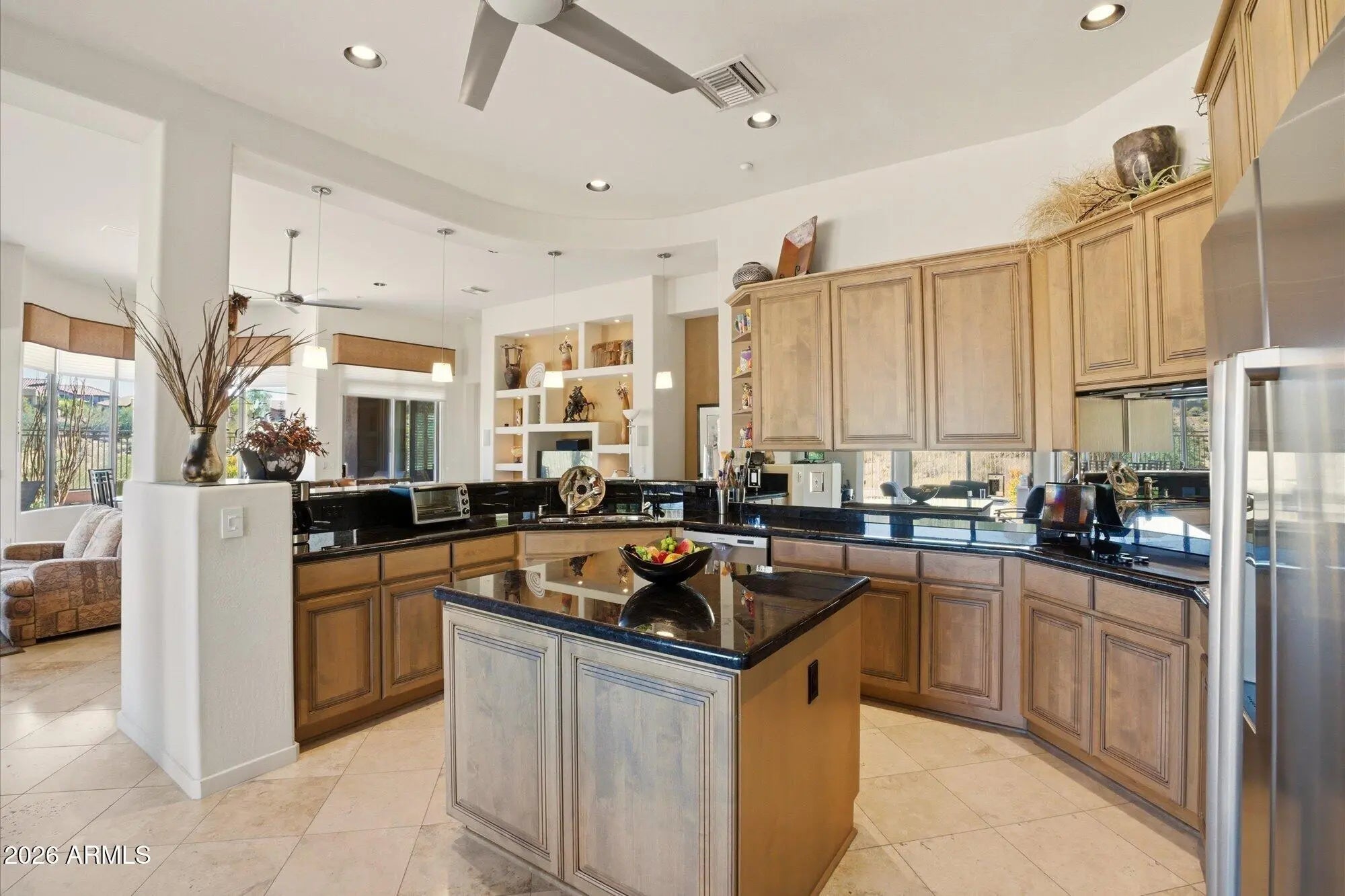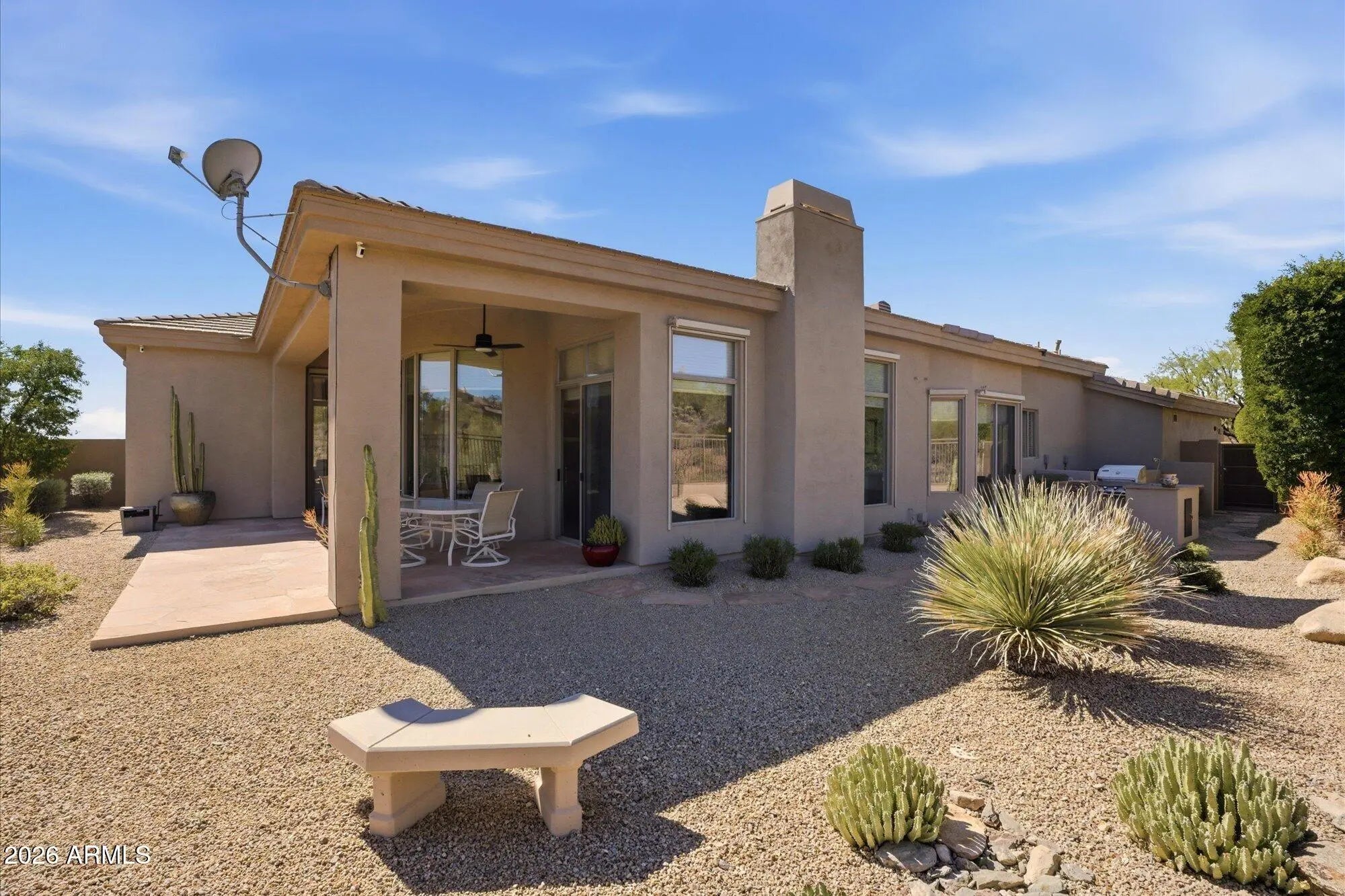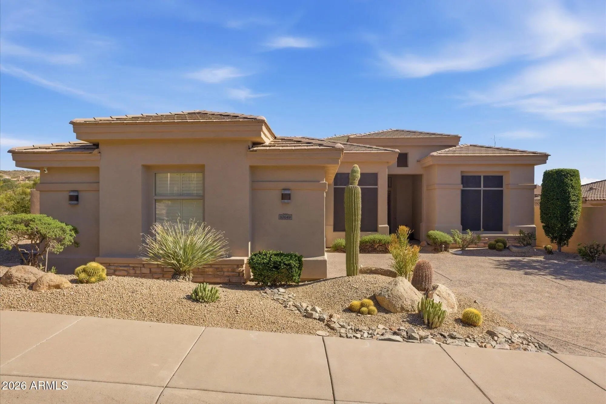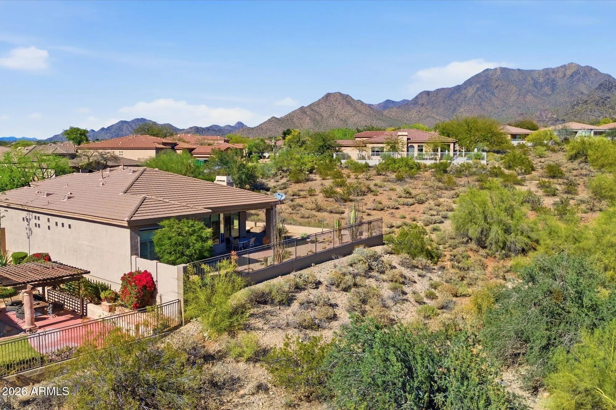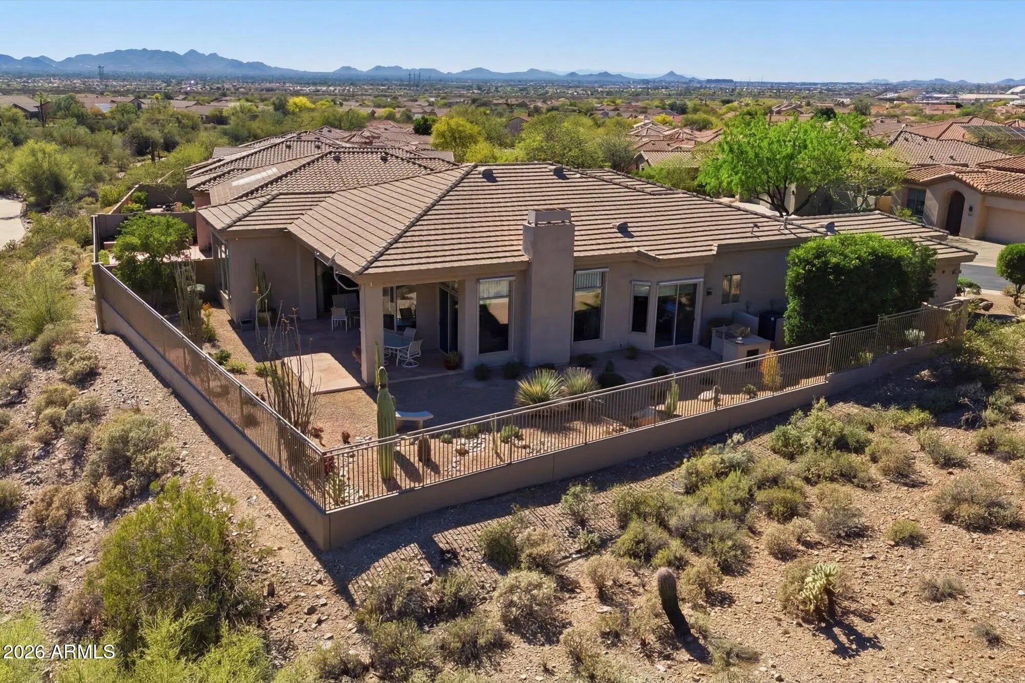 Fabulous single-level home by Toll Brothers (La Jolla - extended model) located in the prestigious guard-gated community of Cimarron Hills within McDowell Mountain Ranch. Situated on a premium view lot, this original-owner residence offers 2,425 square feet of light-filled living space, soaring 12-foot ceilings, no interior steps, and a highly desirable open floor plan. Strong curb appeal leads into a spacious great room featuring custom niche shelving, a charming round dining alcove, and expansive rear windows that frame breathtaking McDowell Mountain views. The split floor plan offers ideal privacy, with bedroom 3 currently used as a home office. The primary suite was thoughtfully extended four feet and bedroom #2, two feet, at the time of construction, adding valuable living space. The open kitchen is designed for everyday living and entertaining, complete with a large breakfast bar with seating for six, granite countertops, center island, built-in microwave, reverse osmosis system, abundant cabinetry, mirrored backsplash, a built-in desk area, and bay windows to take in all the views. A sunny eat-in nook captures mountain views, while plantation shutters and automated shades enhance comfort throughout. The laundry room includes additional cabinetry and a walk-in pantry for exceptional storage. Travertine flooring. The spacious primary suite features a private sliding door to the backyard and a well-appointed bathroom with dual vanities and makeup station, soaking tub, walk-in shower, granite counters, and two generous walk-in closets. Newer A/C units provide added efficiency and peace of mind as well as exterior automated shades! The backyard is designed to take full advantage of the setting, with view fencing, built-in BBQ, covered patio, and sweeping mountain vistas, ideal for relaxing or entertaining. The two-car garage offers epoxy floors, built-in cabinetry, and a water softener system. Residents of guard-gated Cimarron Hills enjoy exclusive access to a private community center featuring a negative-edge heated pool and spa with panoramic views, fitness center, tennis courts, grassy play areas, and a ramada with outdoor kitchen, along with all the amenities of McDowell Mountain Ranch including pickleball, tennis, golf, parks, walking paths, and recreation facilities with hobby clubs and special community events. A rare opportunity to own a pristine, original-owner home on a premium view lot in one of North Scottsdale's most desirable guard-gated communities.