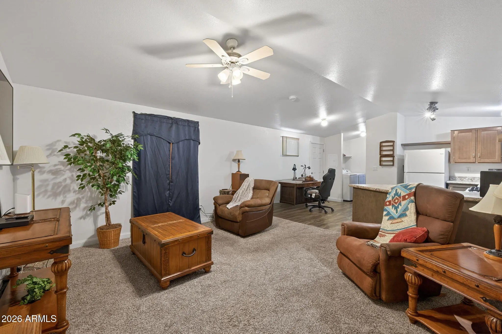 Charming 3 bed, 2 full bath home in the all-ages community of Royal Palms Village. This well-maintained home offers comfortable living with a functional layout ideal for everyday living and entertaining. The open floorplan and vaulted ceilings create a bright, spacious feel. The kitchen includes a gas range, dishwasher, and refrigerator. The split primary bedroom offers added privacy. Plush carpet and wood-look linoleum in all the right places. Community amenities include a basketball court and horseshoe pit. Conveniently located near the 101, 202, and US-60, with easy access to restaurants, shopping, and Chelsea Park just 1/4 mile away with green space, playground, volleyball, basketball, and a covered ramada.