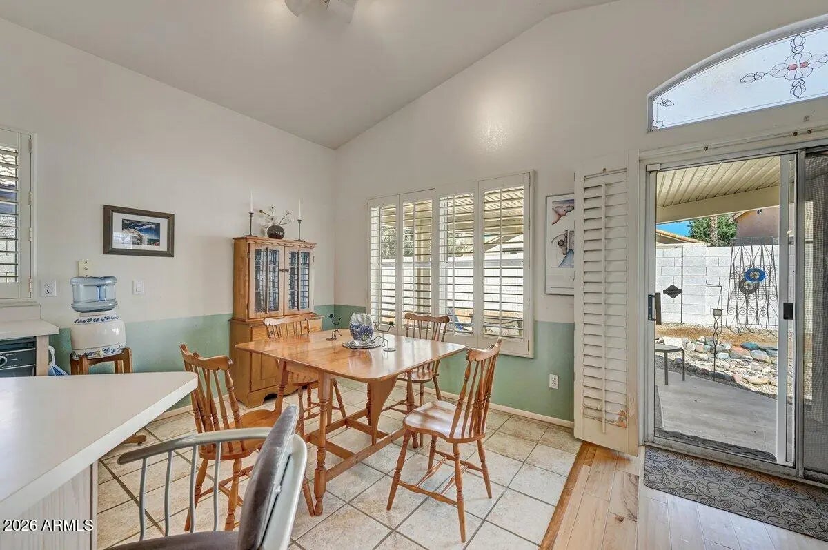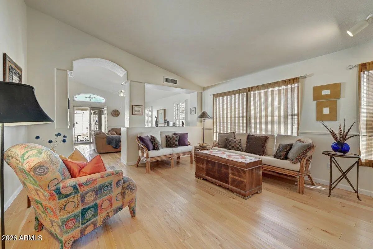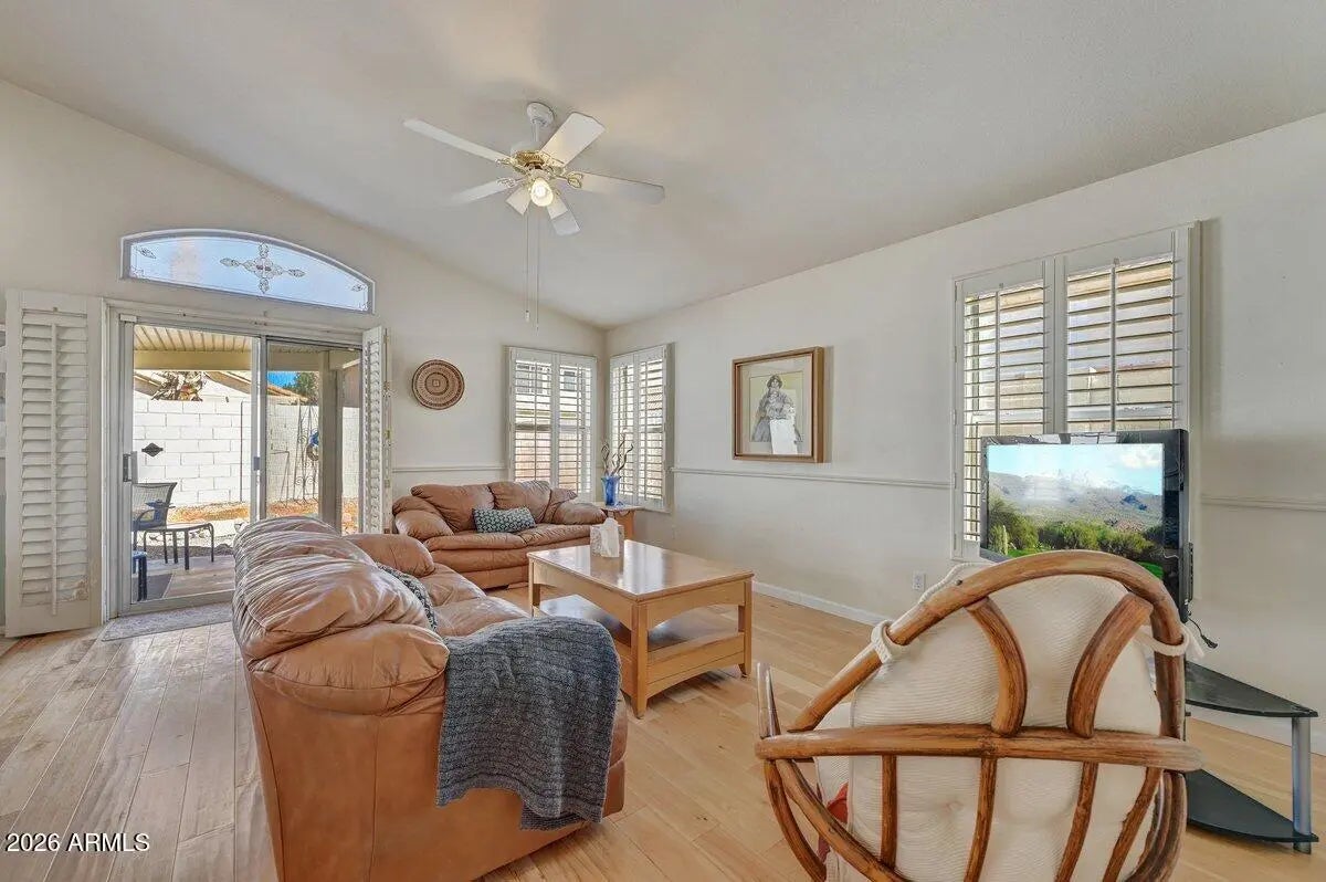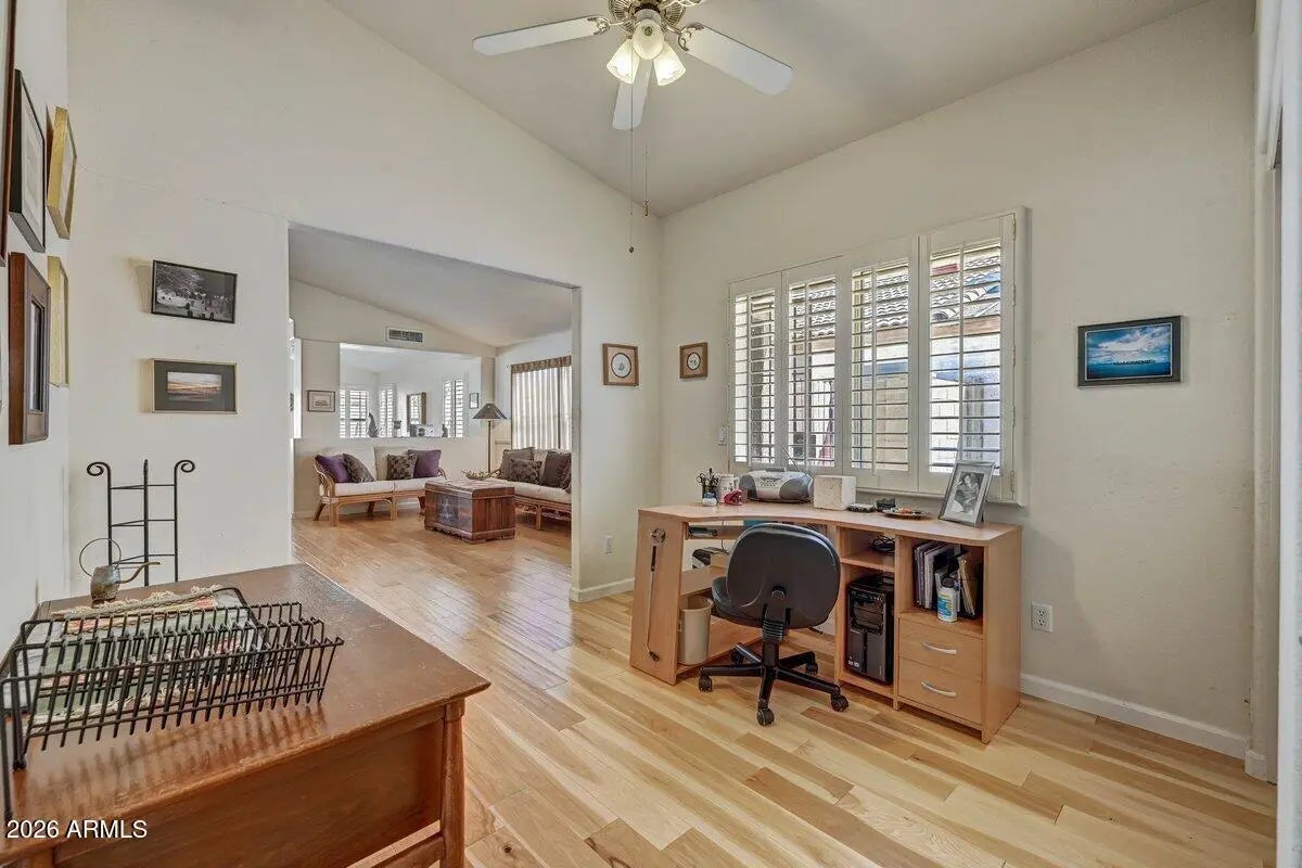 Welcome Home to this wonderful property with a freshly painted exterior and flexible floorplan! 3 bedroom or 2 bedroom plus an office with closet. One wall was removed so the house is currently configured as a den/office. The living room flows to the family room that opens to the kitchen with an eat-in area and center island. The flow of the house is airy and spacious with lots of windows for natural light. Plantation shutters, wood floors, vaulted ceilings and fans throughout add to the value! Primary suite features a separate shower & tub, two sinks & a walk in closet. The low maintenance landscaping and a distinctive covered patio invite outdoor entertaining! The convenient location is close to everything! Paradise Valley School District. Don't miss this great value!