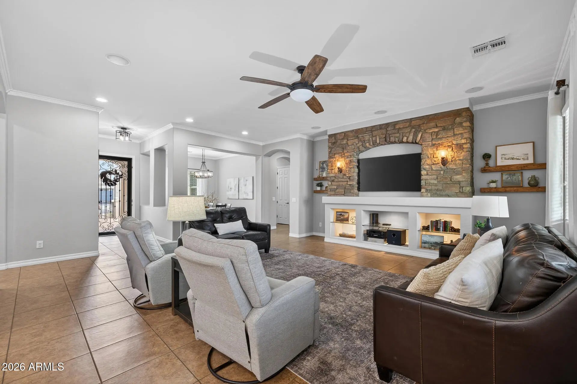 Welcome to this beautifully maintained, original-owner home in the desirable Freeman Farms community, offering 4 bedrooms plus a double-door office and 3 baths across 2880 SqFt. The open great room layout flows seamlessly into a formal dining area, creating an inviting space for both everyday living and entertaining. The gourmet kitchen features dark maple cabinetry, granite countertops, a subway tile backsplash, stainless steel appliances, a walk-in pantry, and an island with stone accents, breakfast bar seating, and pendant lighting. The great room includes a custom stone-accented feature wall with built-ins, crown molding, and ceiling speakers for surround sound. Sliding doors open to a relaxing backyard with a covered patio, ceiling fan, and a sparkling pool complete with a rock waterfall and built-in table. Pavers create additional seating areas and lead to the RV gate and garage service door, while artificial turf provides a low-maintenance play space. The primary suite offers private patio access and an en-suite bath with dual vanities, a separate tub and shower, and a walk-in closet. Secondary bedrooms also include walk-in closets, and all baths feature granite countertops. Additional highlights include a new A/C unit installed in 2025, crown molding, neutral two-tone paint, a spacious laundry room with cabinets and a sink, and a 3-car tandem garage with epoxy flooring.