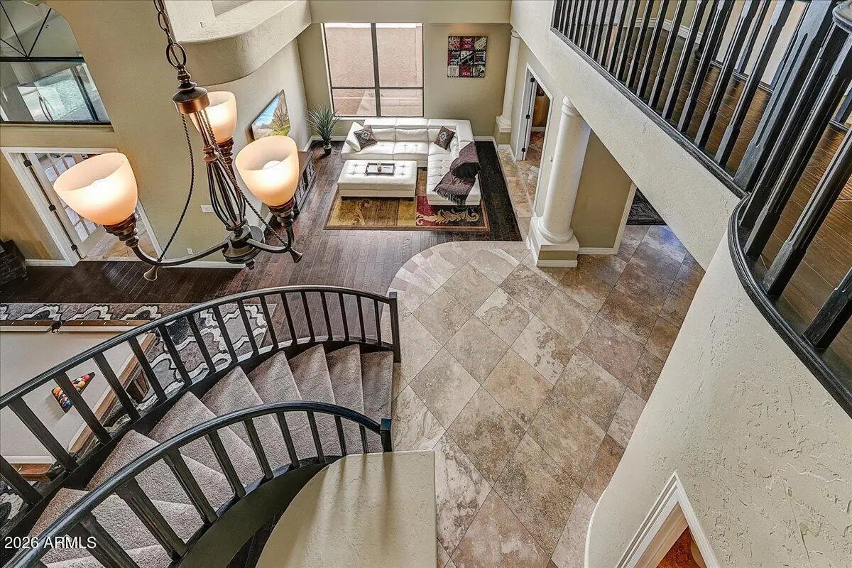 IMPRESSIVE LUXURY PROPERTY IN THE POPULAR RIO MONTANA SUBDIVISION. Architecturally distinctive interior features a stunning staircase, soaring ceilings, elegant travertine and wood flooring with French doors. Preferred floor plan has great functionality with 4 bedrooms, 3.5 baths + separate office + additional flex room or studio. Expansive living areas with great room concept, formal dining and multiple bonus rooms. Bright and open kitchen with upgraded cabinetry, granite countertops and butler's pantry. Large master suite with upscale bathroom, 2-way fireplace, sitting room and private balcony. Property in very good condition and well maintained with new A/C units, water heater and smart pool technology. Exceptional outdoor living. Located close to BASIS school and Mayo. GREAT VALUE!