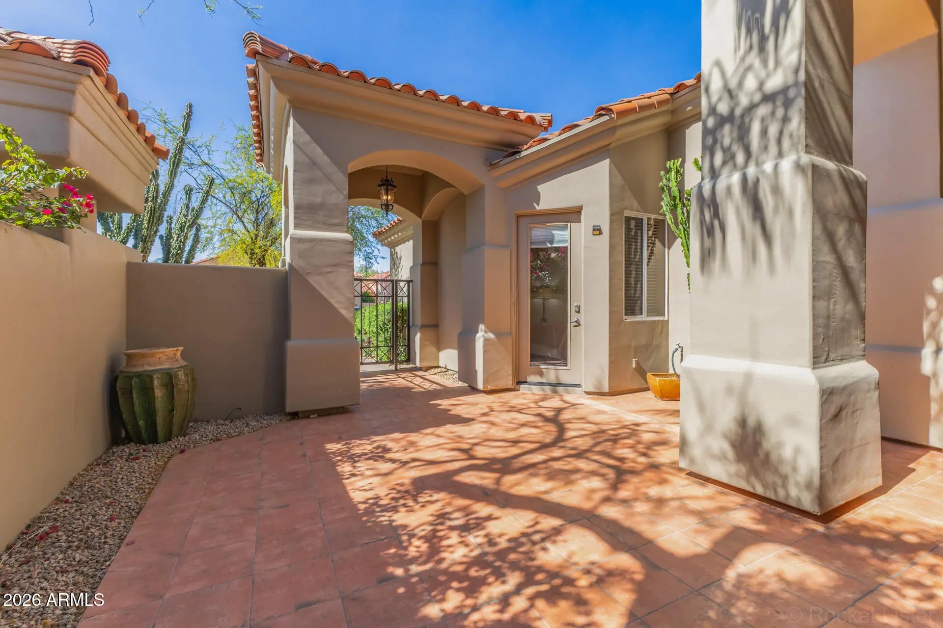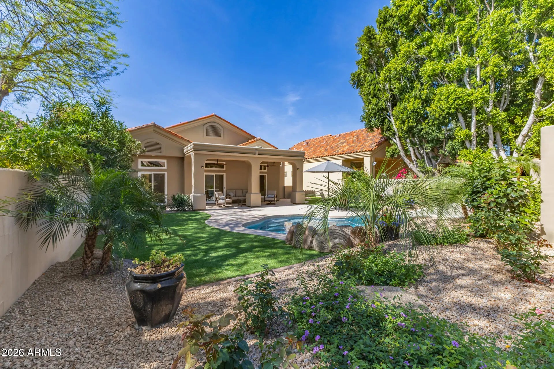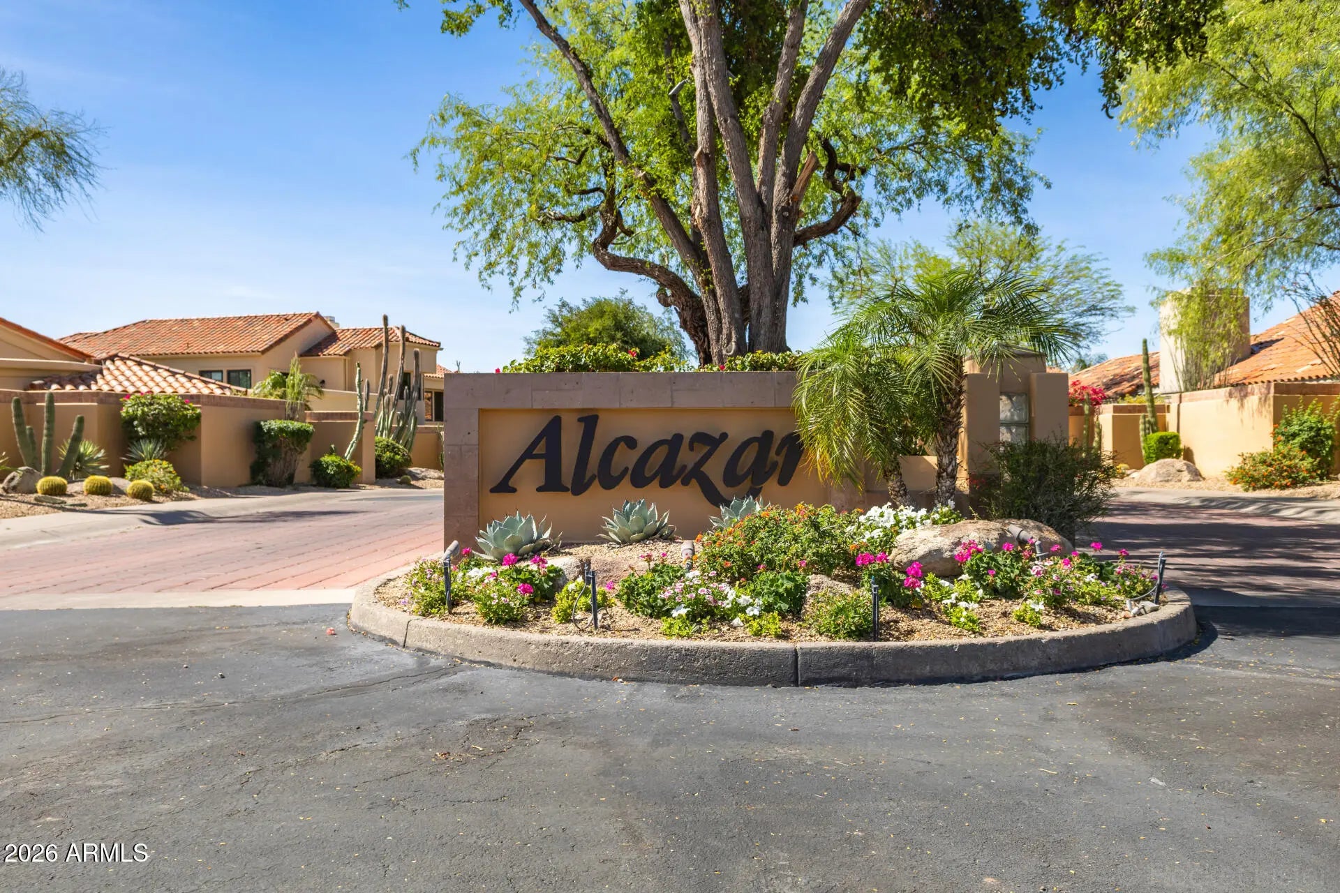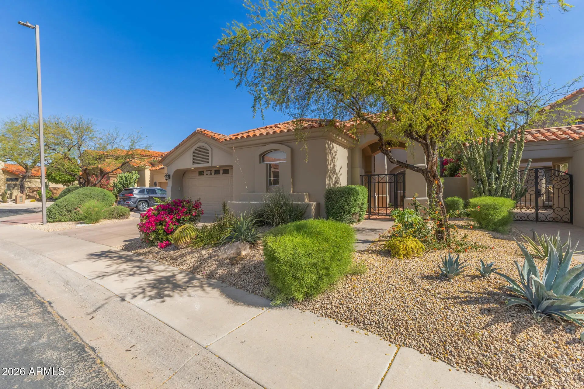 Just steps away from the renowned TPC Scottsdale golf course, this beautifully appointed 3-bedroom, 3-bath residence with a private casita, ideally located in the highly desirable gated Alcazar community. New windows, slider doors, AC/Furnace, tankless water heater and more! Walk into low-maintenance desert landscaping & a charming newly tiled courtyard entry. Inside, the home features an open-concept floor plan with soaring ceilings, abundant natural light, a neutral color palette, stone tile flooring, and a cozy fireplace with TV. The well-appointed kitchen is designed with new SS KitchenAid & Bosh appliances, new osmosis system, offering skylights, granite countertops with a matching backsplash, white cabinetry with crown molding, a pantry, & a two-tier peninsula with breakfast bar seating. The spacious primary suite includes private access to the backyard and an ensuite bathroom with dual vanities and a large walk-in closet. A standout feature of the home is the private detached casita with its own courtyard and direct to garage entrances, providing ideal accommodations for guests, multigenerational living, or a dedicated home office. Step outside to a thoughtfully newly designed backyard with driplines, complete with a covered patio, artificial turf, new side yard French drain and patio roof drainage. A renewed pebble-tech sparkling pool with waterfall--perfect for enjoying Arizona's year-round sunshine, completes the oasis. Don't miss the opportunity to own this exceptional property in a premier location and make friends with the neighbors across the street who are on the golf course!