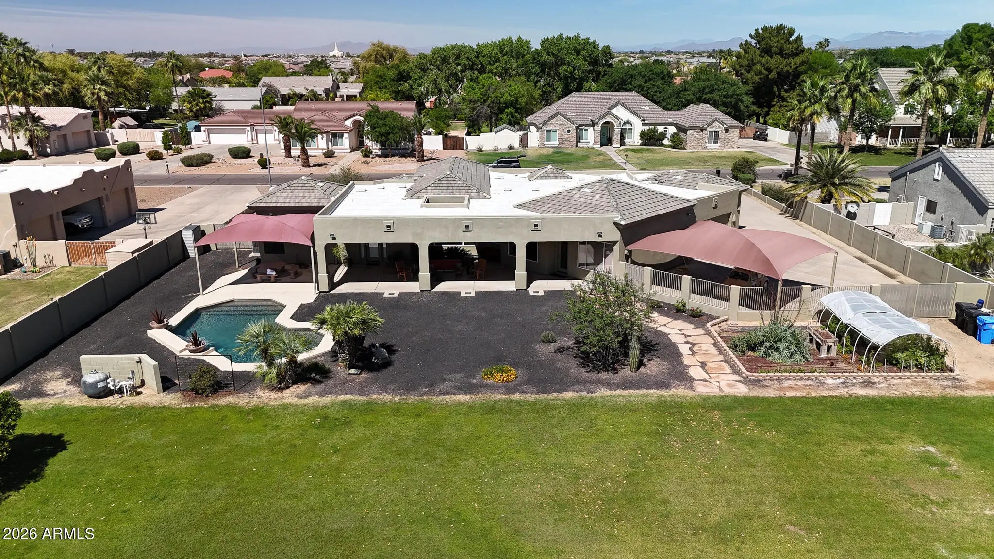 The Ultimate Self-Sustaining Luxury Estate in South Gilbert. Experience a rare blend of executive luxury and homestead freedom. Situated on a lush 0.83-acre irrigated lot in Broadland Ranches, this meticulously maintained 5-bedroom, 3-bathroom residence is a masterclass in resilient living. Unrivaled Efficiency: The home features a rare underground HVAC return system, a custom engineering feat that significantly reduces energy costs by utilizing the earth's natural cooling. Combined with private septic and grandfathered irrigation rights, this property is uniquely shielded from some of the recent utility rate hikes. The Executive Ranch Lifestyle: Beyond the sparkling private pool lies a true ''Living Pantry'' featuring 12 mature fruit and nut trees and an expansive garden. This is one of the few luxury neighborhoods where horses, chickens, goats, and pot-belly pigs are welcomed. With a minimal annual HOA fee and Arizona's SB 1415 ADU laws, you have the freedom to add a guest manor or a custom RV garage without the typical suburban restrictions. 5 Bedrooms * Self-sustaining efficiencies and food stores * Meticulously maintained * Total Freedom * Welcome to your Private Ranch! This estate is curated for the buyer seeking elegance, a peaceful sanctuary, autonomy, and generational legacy.