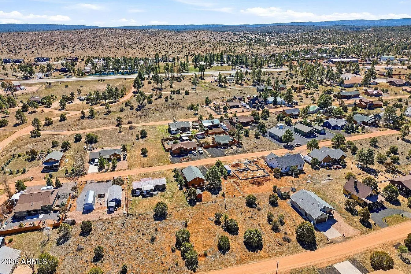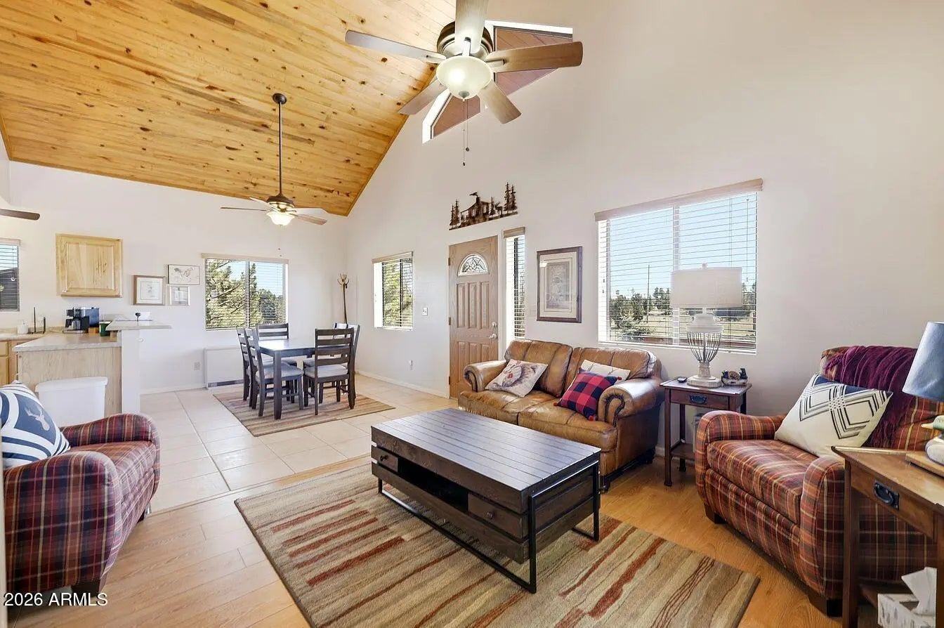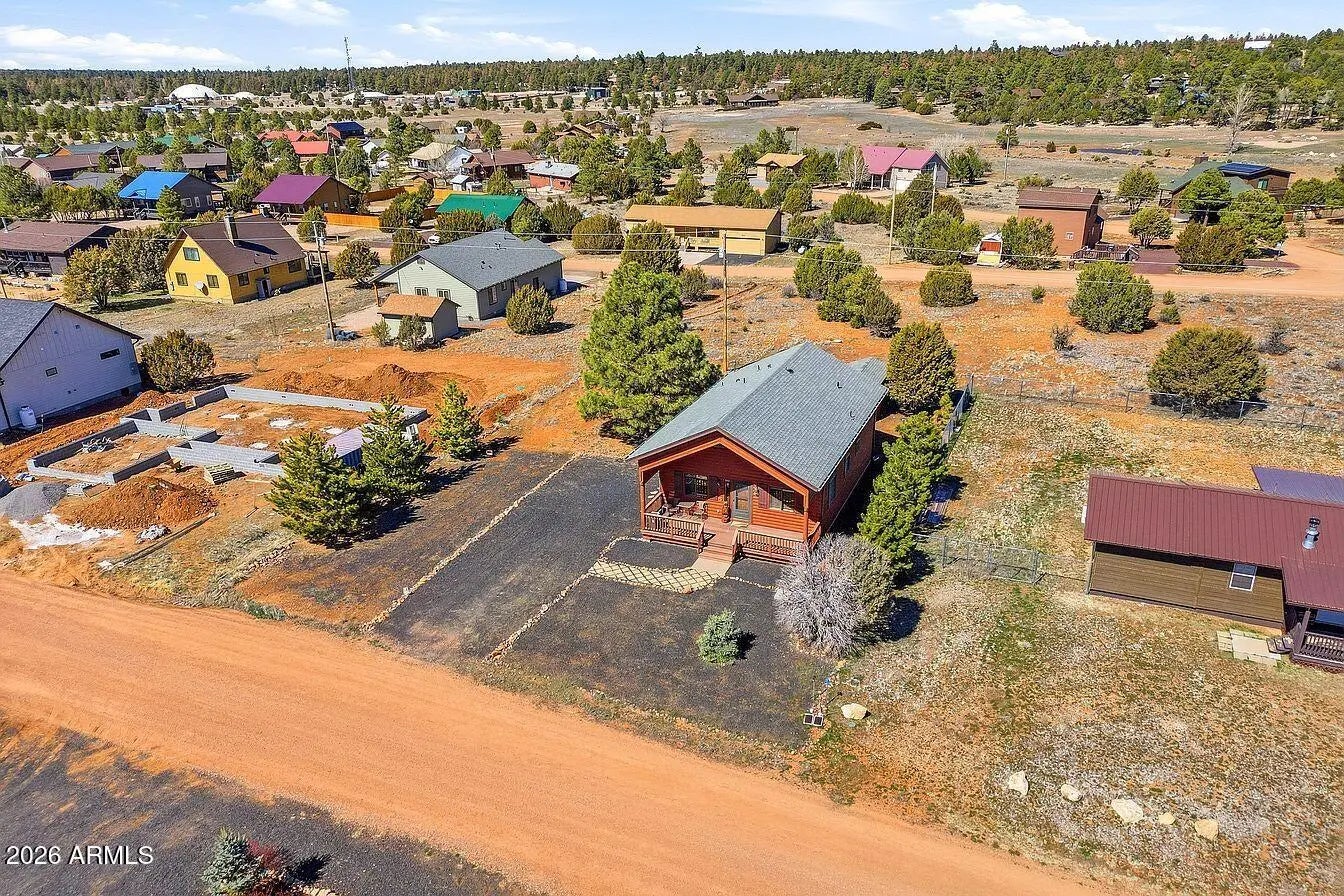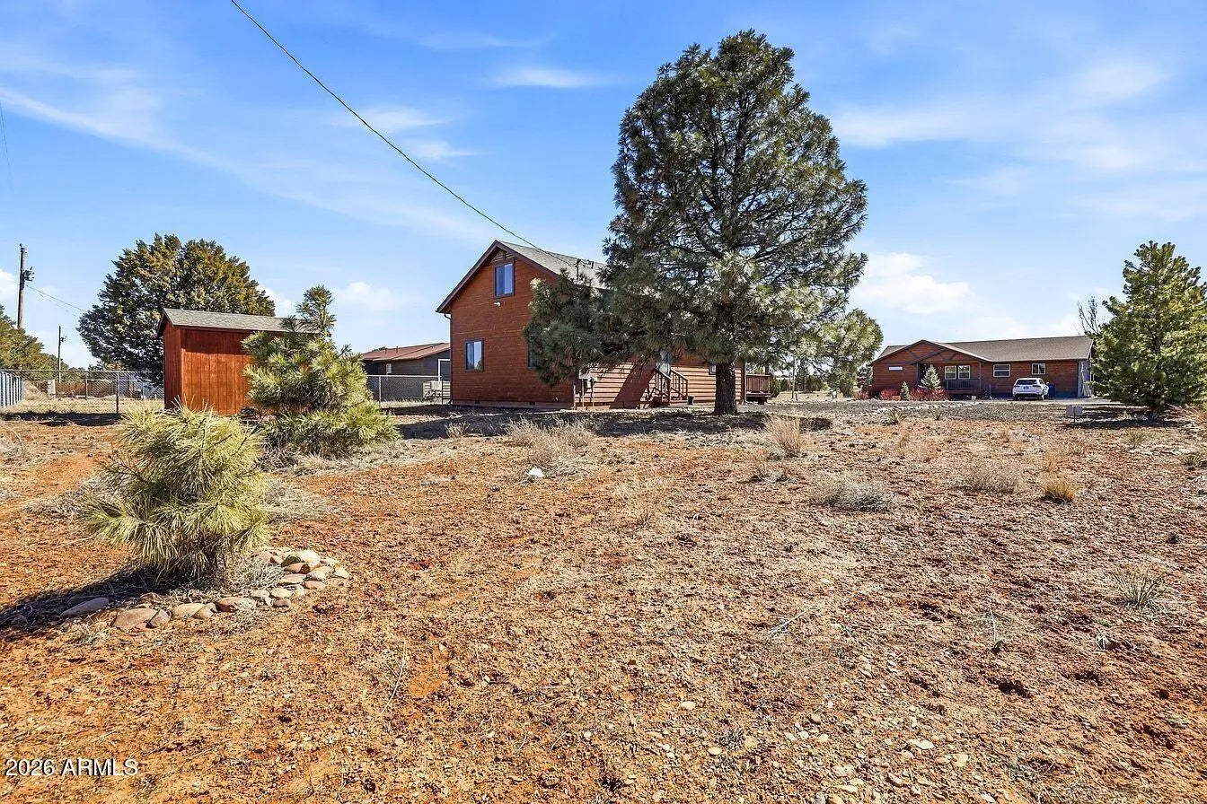 Cabin-style mountain home in Pine Meadows, offered fully furnished and move-in ready. Built in 2005, this 3-bedroom, 2-bath home has 1,282 sq ft with an open layout, vaulted tongue-and-groove pine ceilings, and a covered front deck with low-maintenance composite decking, a great spot to sit and take in the mountain air. The main level keeps things simple and functional: an open living and dining area, a kitchen with ample cabinet space and a breakfast bar, two bedrooms, a full bathroom, and an in-unit laundry room with washer and dryer included. Upstairs, the loft serves as the primary suite with its own ensuite bathroom and closet. It's a private setup that works well, and could easily be closed off from the main level if preferred. The quarter-acre lot gives you good usable outdoor spa without a lot of upkeep. There's a matching storage shed out back that's well-built and practical for tools, gear, or extra storage. The neighborhood is quiet with easy access from Pine Meadows Drive, and the aerial shots show just how much open space surrounds this area of Overgaard. At this price point and fully furnished, it works well as a primary residence, a weekend getaway, or a rental. Water softener conveys.