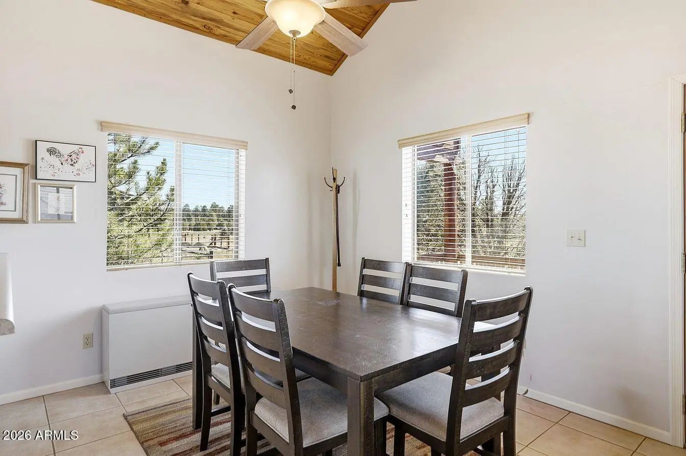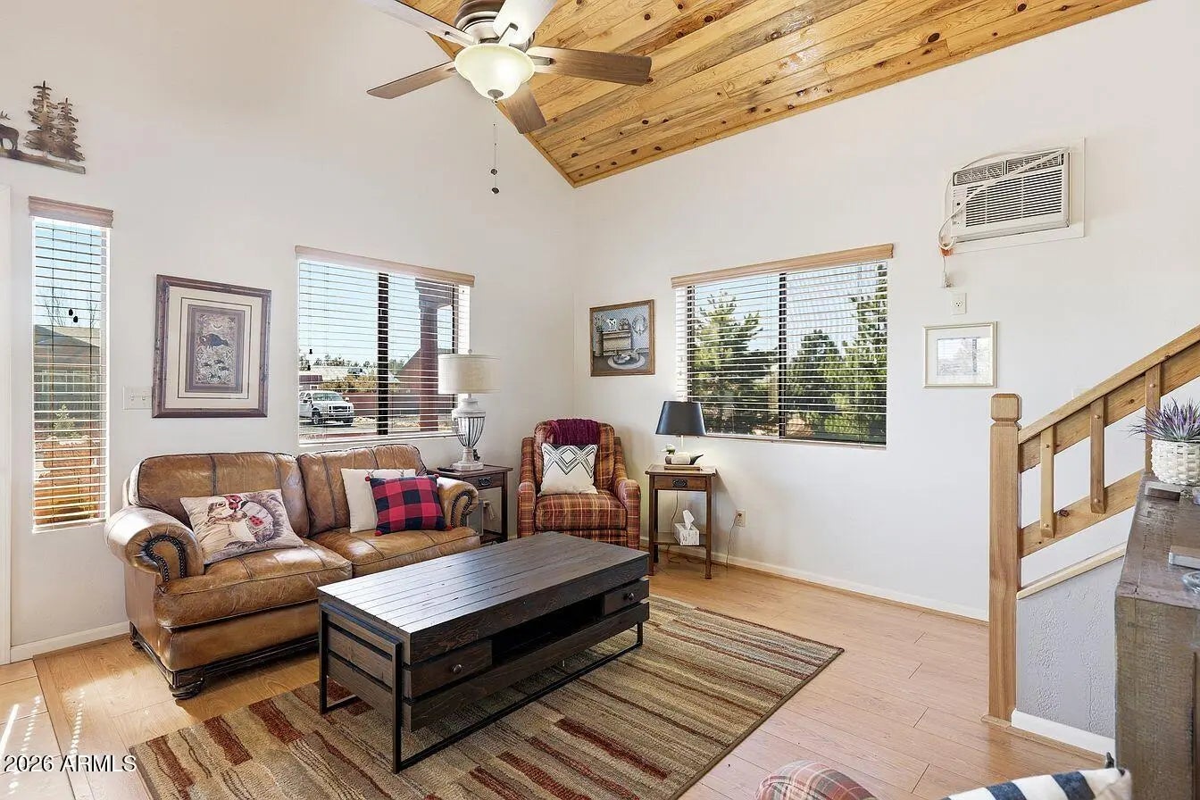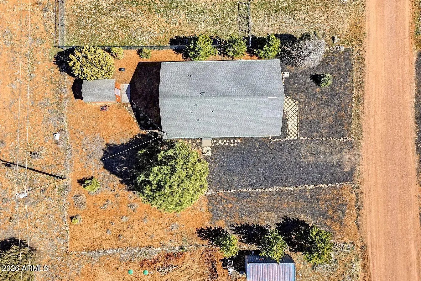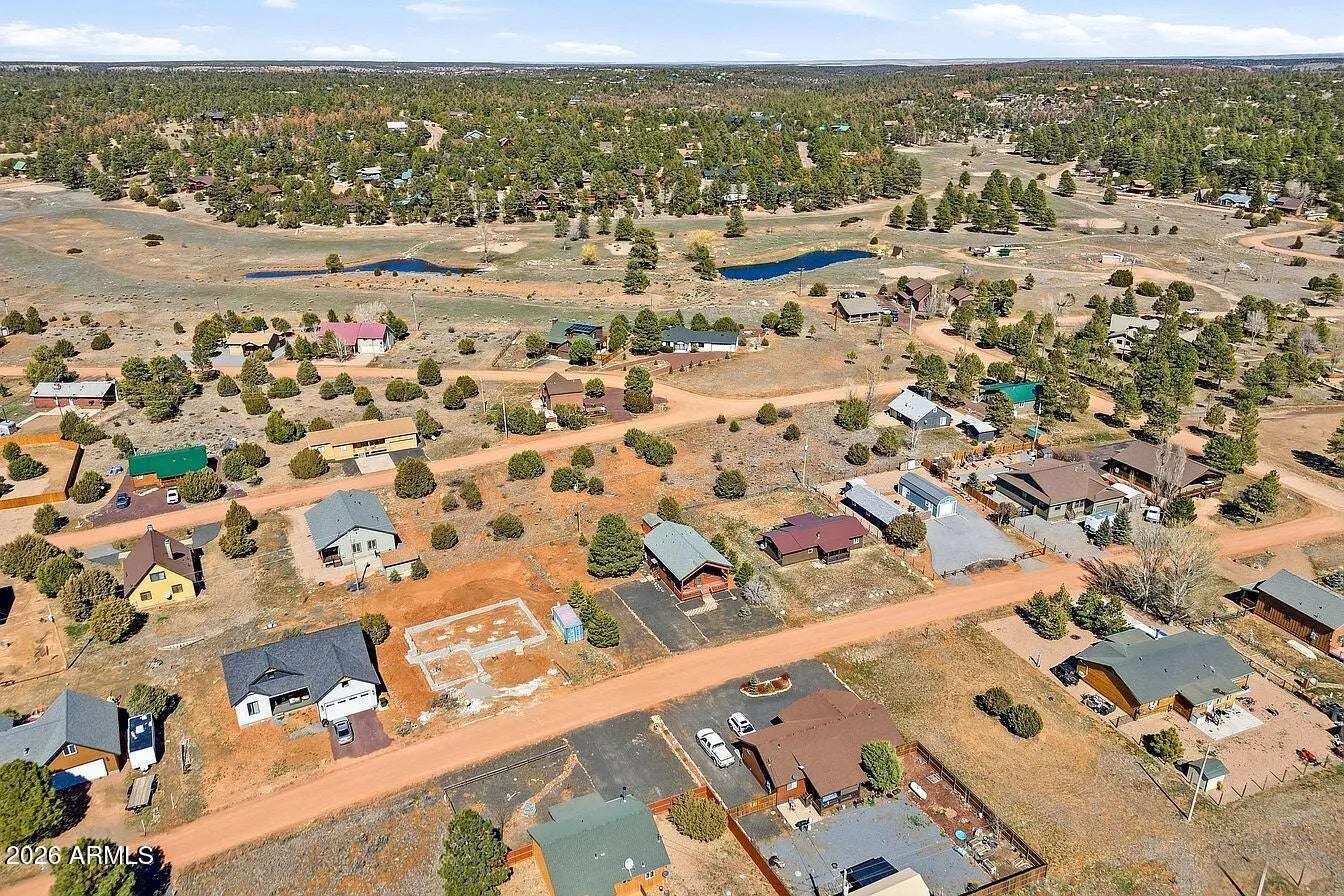 Cabin-style mountain home in Pine Meadows, offered fully furnished and move-in ready. Built in 2005, this 3-bedroom, 2-bath home has 1,282 sq ft with an open layout, vaulted tongue-and-groove pine ceilings, and a covered front deck with low-maintenance composite decking, a great spot to sit and take in the mountain air. The main level keeps things simple and functional: an open living and dining area, a kitchen with ample cabinet space and a breakfast bar, two bedrooms, a full bathroom, and an in-unit laundry room with washer and dryer included. Upstairs, the loft serves as the primary suite with its own ensuite bathroom and closet. It's a private setup that works well, and could easily be closed off from the main level if preferred. The quarter-acre lot gives you good usable outdoor spa without a lot of upkeep. There's a matching storage shed out back that's well-built and practical for tools, gear, or extra storage. The neighborhood is quiet with easy access from Pine Meadows Drive, and the aerial shots show just how much open space surrounds this area of Overgaard. At this price point and fully furnished, it works well as a primary residence, a weekend getaway, or a rental. Water softener conveys.