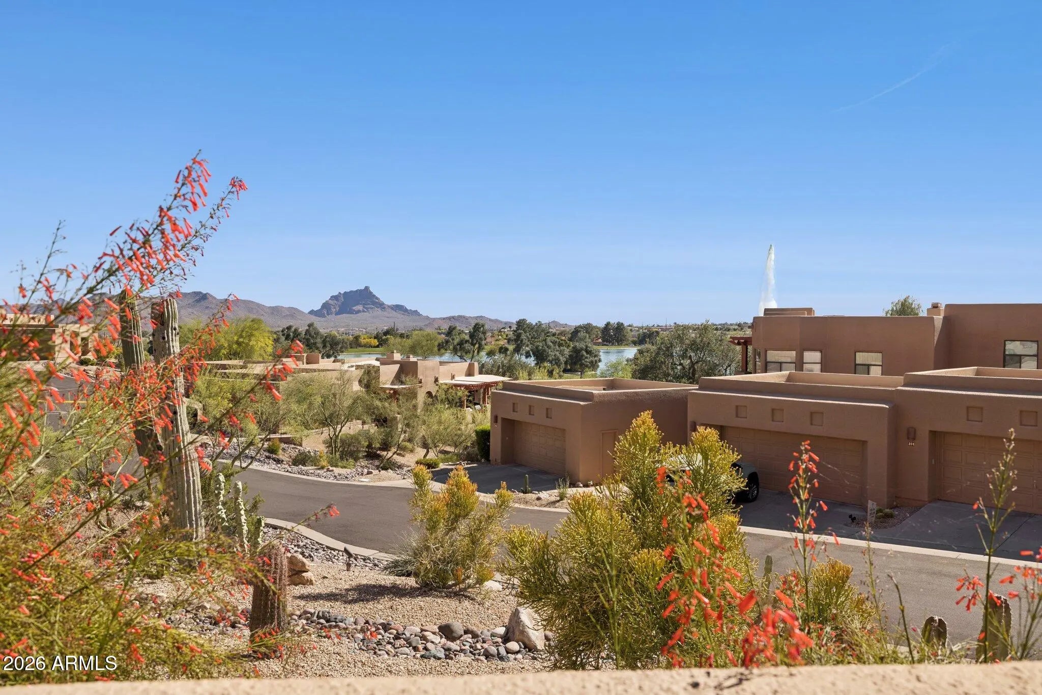Overlooking America's Tallest Fountain and Fountain Park, this ground-floor, 3-bedroom, 2-bath condo in gated Fountainhead offers stunning Fountain and Red Rock Mountain views. Ideal for seasonal or full-time living, the bright great room features a wood-burning fireplace, expansive windows, and seamless access to a large wraparound covered patio for indoor-outdoor living. The large kitchen allows seamless entertaining. Two bedrooms plus den, including one en-suite with patio access. Two-car garage. Community clubhouse, heated pool, and spa. Walk to the Overlook Trail, dining, and shops. Select furnishings available. Very stylish and livable, but also perfect for an update!