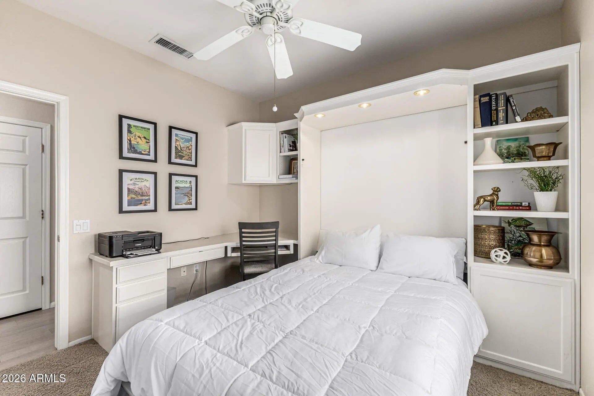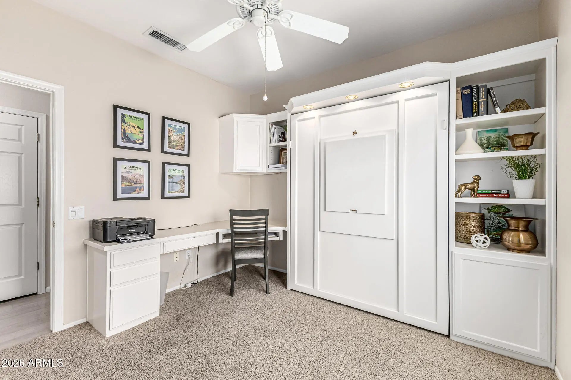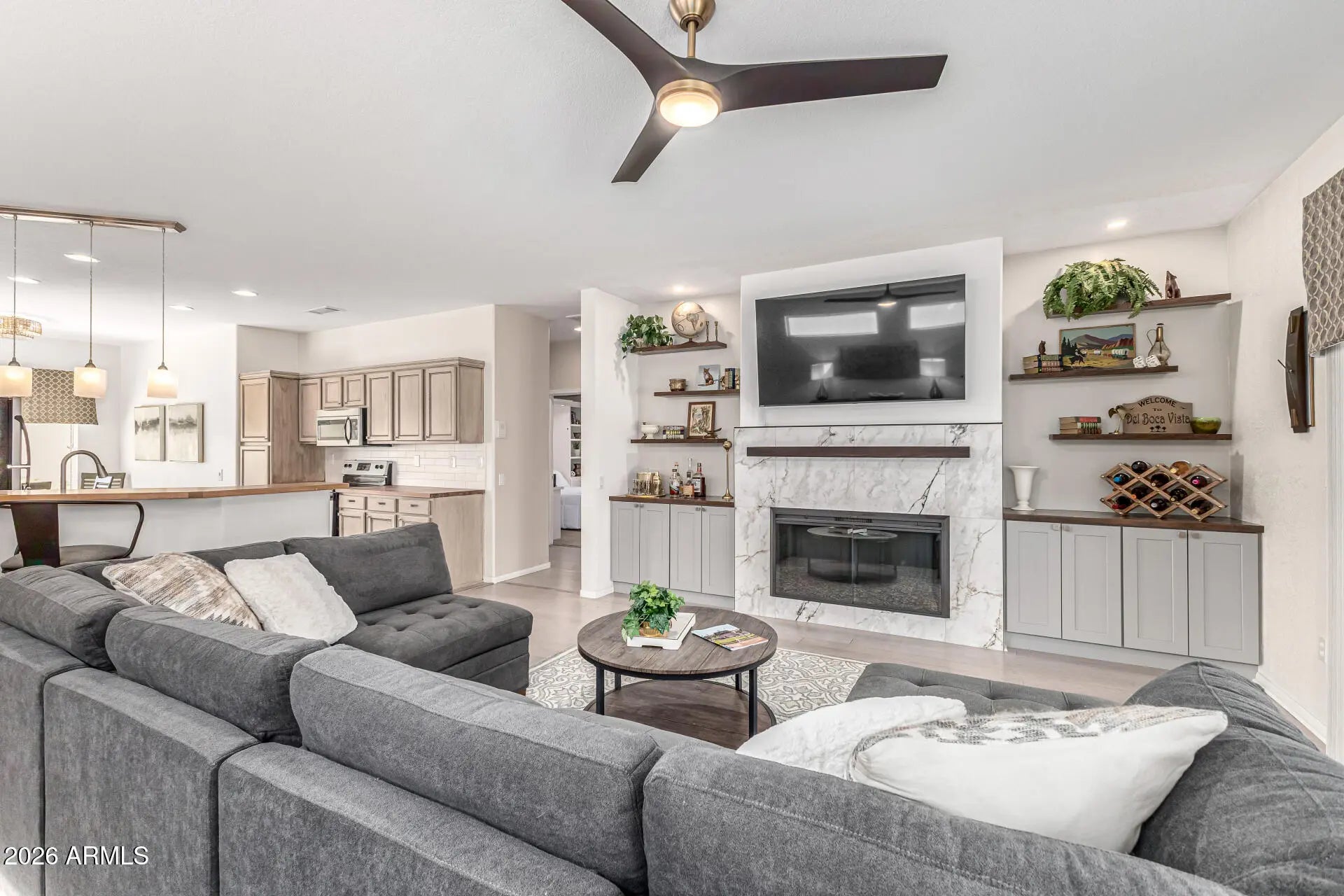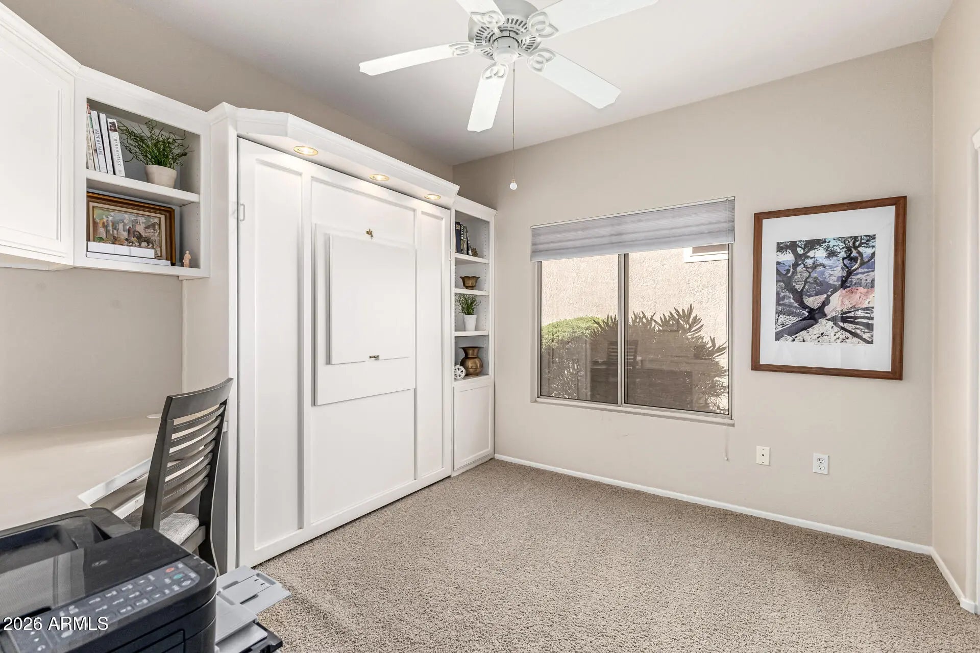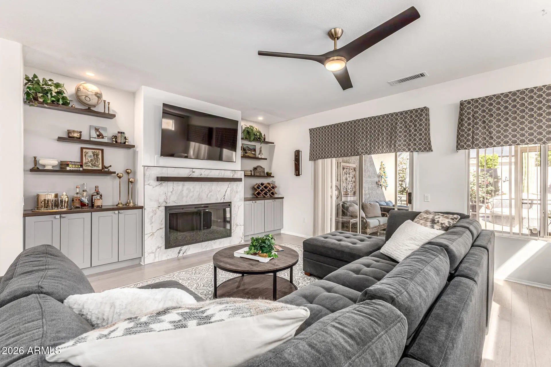 This stunning 2-bed, 2-bath + office or 3rd bedroom home in The Grand has been tastefully remodeled and has so much to offer! The open great room has an eye-catching accent wall with a beautifully tiled electric fireplace surround, custom cabinetry, floating shelves, and can lights. Tons of natural lighting and a sliding glass door to a screened-in patio. Remodeled kitchen including refinished cabinets with crown moulding, custom shelves, backsplash, butcher block counter tops, breakfast bar, and eat-in kitchen area. Spacious primary bedroom with sitting area and 2 closets. The bathroom has a tiled shower with low-step easy entry, glass door, refinished cabinets, quartz counter, dual sinks, and updated mirrors + light fixture. The secondary bedroom has a built-in Murphy bed wit h 3 modes, built-in desk, and closet, making it perfect for crafts or a home office. Additionally, there is a third room with its own door, currently being used as a guest bedroom. Full guest bathroom and indoor laundry room with storage cabinets + utility sink. Bamboo floors in the main living areas and 3rd bedroom / office + updated lighting and window coverings throughout. 2-car garage with tons of cabinets and workshop area. Upgraded Trane HVAC (2014), new roof underlayment (Dec 2022), new water heater (Dec 2021), new dripper system in back yard (2021), new garage door opener (2020). Your backyard oasis is complete with a screened in patio, additional patio with a sitting area, beehive fireplace, turf, and beautiful, mature landscaping. Fully fenced with a block wall + side gate. This home is also in a small portion of the Grand that includes front yard maintenance and monthly bug spraying included in HOA fee, making this home the perfect lock-and-leave seasonal house or year-round home. The Grand is one of the premier active adult communities in the West Valley, with over 100 clubs, 2 separate clubhouses and community areas, 2 large outdoor community pools, an indoor lap pool, spa, 2 separate fitness centers including a 1/4-mile indoor walking track, tennis courts, bocce ball, pickle ball, various leagues and sports teams, and 4 golf courses.