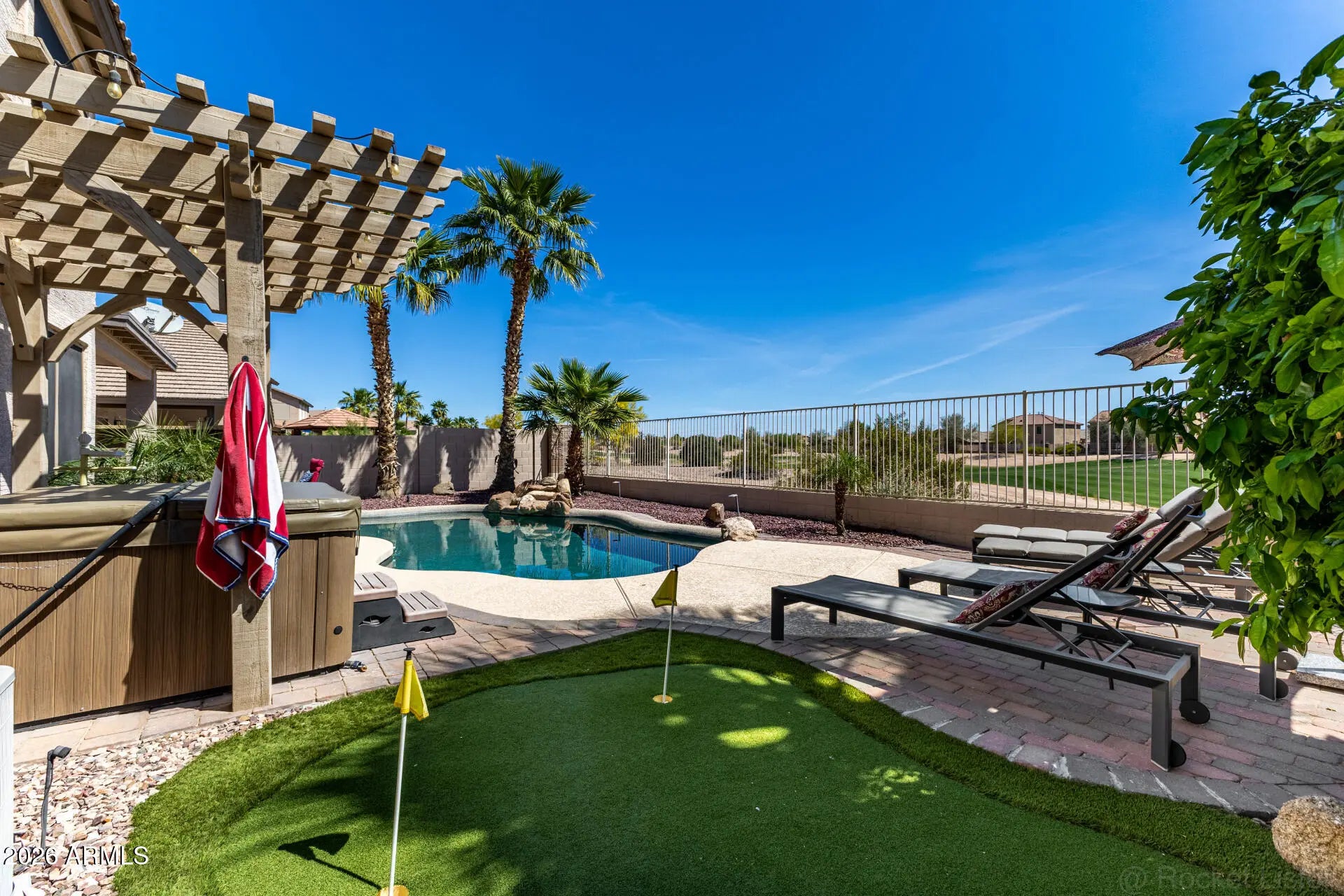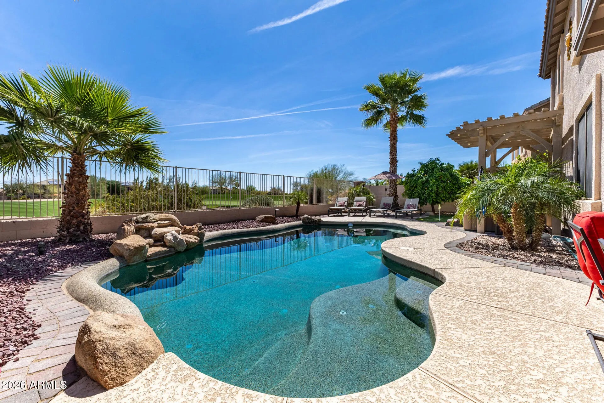 Amazing property on a GOLF COUSRE LOT with a HEATED POOL! From the moment you arrive and see the beautiful curb appeal and maintained landscape, you know this house is special. Enter to find an immaculate home with soaring 20-foot ceilings and lots of natural light. The floorplan features 5 bedrooms PLUS a loft, and a 3-car garage for plenty of storage. Upgraded kitchen with granite counters, tile backsplash, R/O system, and all the appliances convey, even the washer/dryer set. The backyard oasis is an entertainer's dream, with an above-ground spa, putting green, built-in BBQ, and pebble-tec pool. Or sit under the covered patio and watch the sunrise while listening to the tranquil waterfall. This is a home you don't want to miss! Furnishings available on a separate bill of sale.