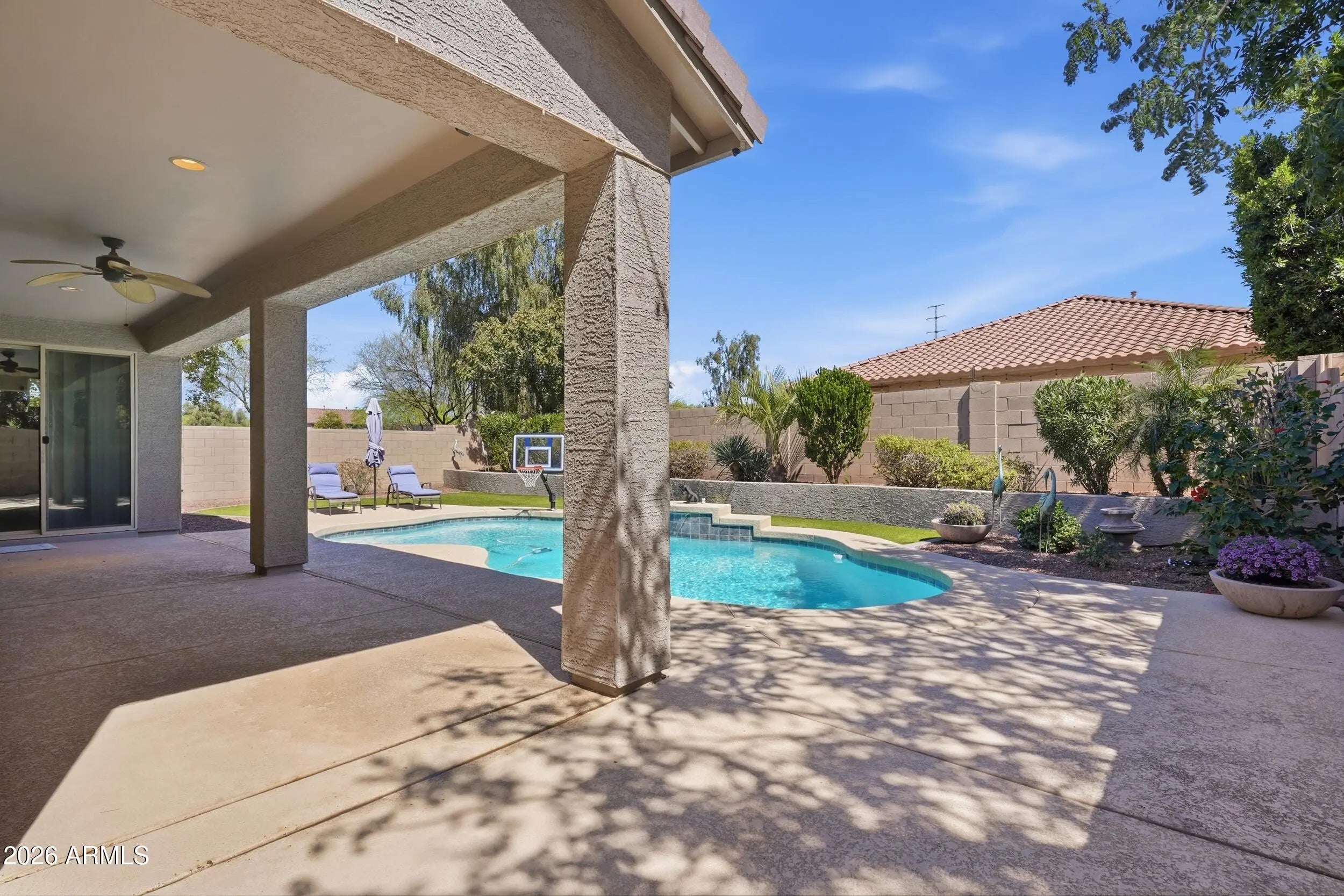 Welcome home to this Turn-Key BEAUTY!! Tucked away nicely in a serene cul-de-sac, this Spacious Home is sure to Impress. With an Open Layout the Well-Suited Kitchen features a Perfectly Appointed Island, Ample amount of Classic White Cabinets, Sleek Black Countertops and Stainless-Steel Appliances. Open to the Great Room, this Spacious Light and Bright Home Offers 3 Bedrooms + Den (Could be converted into a 4th bedroom) and 2 Bathrooms with Walk-In Closets throughout. In the Large Primary Suite, find a Gorgeous En-suite with Dual Vanities and Walk-In Shower. Beautiful Diamond Pattern Tile throughout the main living areas. Perfectly Situated on a large lot, the Saltwater Pool comes Fully equipped with self-regulating temperature which adjusts from warm to cool. This Nice Sized Backyard has been beautifully landscaped and comes equipped with a newer drip system (front and back) a Covered Kool-Deck Patio with Professionally installed Misters on the Entire Patio, including the side lounging area and a Gated Dog run. It's the Perfect Space for Entertaining or Just Relaxing Outdoors. Located in Layton Lakes you can Enjoy Community Amenities such as lakes, streams, a fishing dock, 5 miles of meandering lighted trails surrounding lakes, waterfalls, equestrian trails, baseball and softball fields, tot lots, shaded ramadas, BBQ areas, splash park, basketball and lighted tennis courts. This is an amazing opportunity to be in a wonderful area and have the lifestyle you have been looking for! Conveniently located near the 202, San Tan Mall and Gilbert Regional Park.