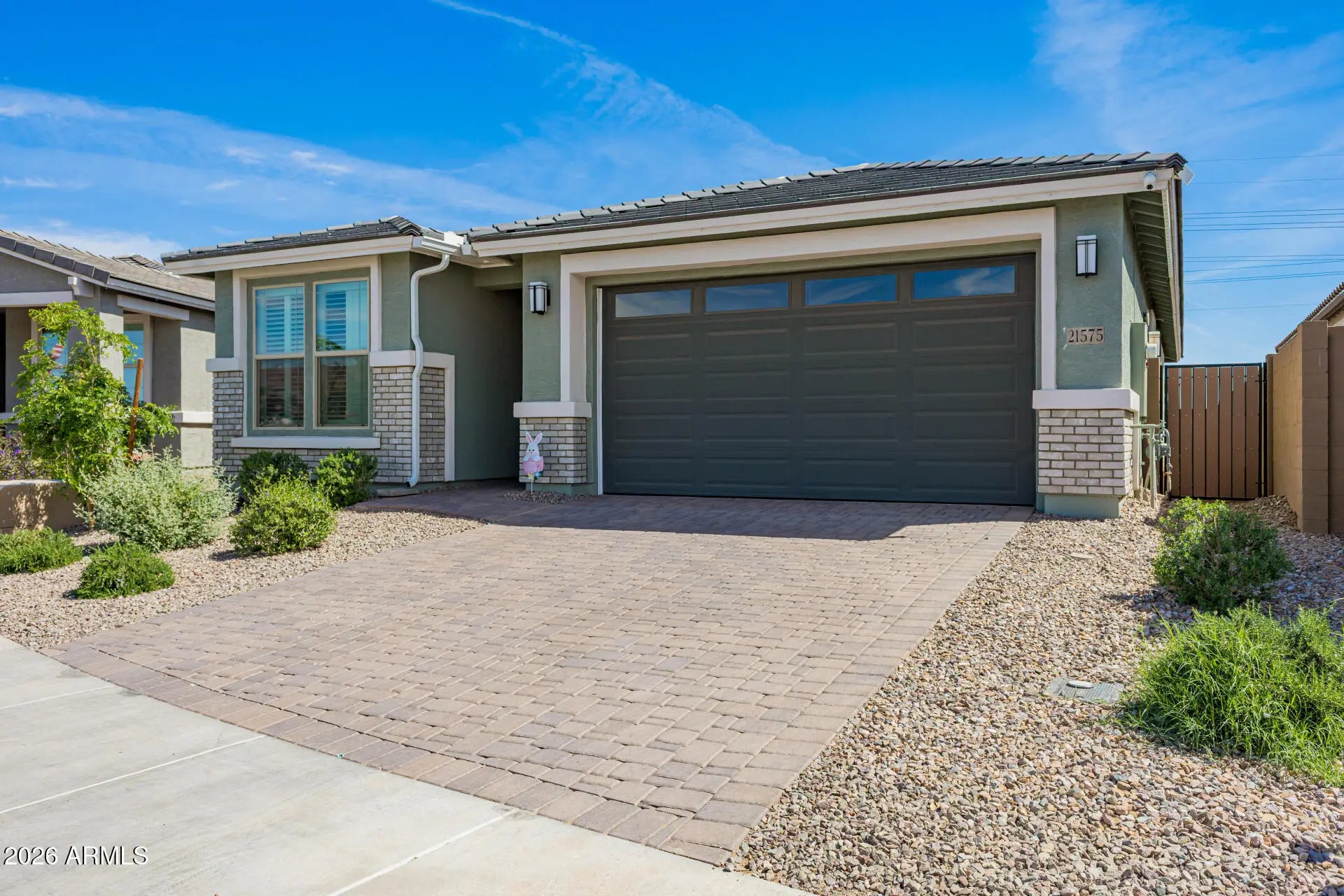 The search is over! This lovely home welcomes you w/ a 2-car garage, a tasteful paver driveway, & brick accents. You'll be delighted by an appealing open layout w/ high ceilings, recessed lighting, plantation shutters, & attractive wood-look flooring. The gourmet kitchen comes w/ quartz counters, white shaker cabinets w/ crown moulding, chic pendant lighting, a striking tile backsplash, stainless steel appliances, a walk-in pantry, & an island w/ a breakfast bar. The primary bedroom showcases an ensuite w/ double sinks & a walk-in closet. You'll also find a versatile flex space & a cozy den ideal for an office or study. Unwind in the backyard, complete w/ a covered patio, a gazebo, artificial turf, & a relaxing spa. W/ over 40k in upgrades, this gem is a fantastic find! Make it yours now!
