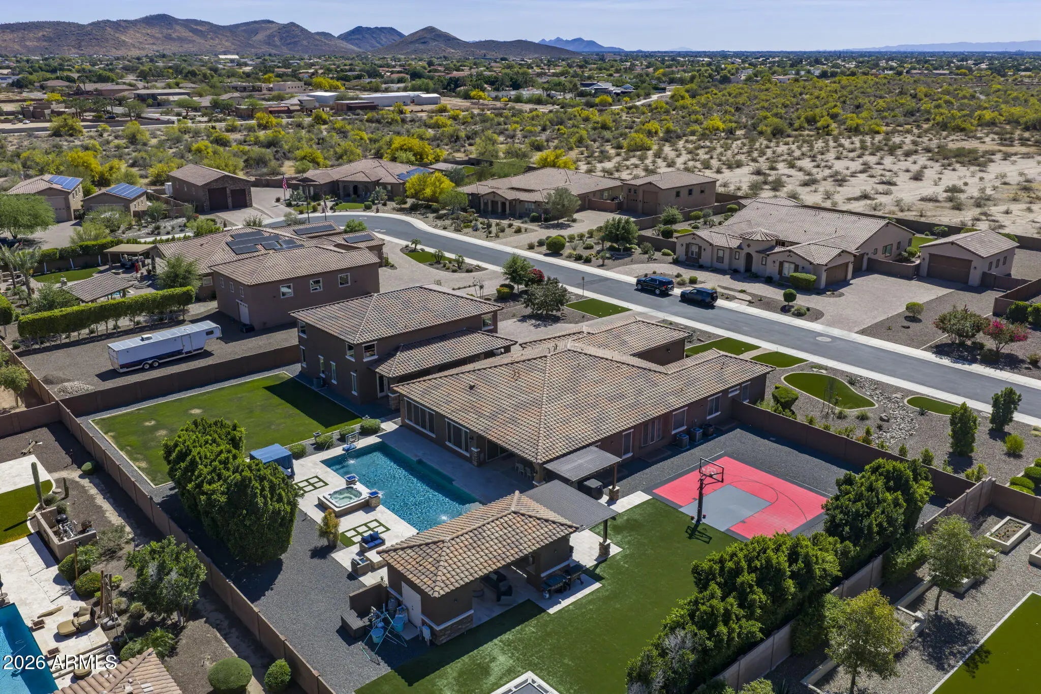 Beautiful basement home in the gated community of Vista Montana III by Shea, situated on just under an acre lot. This spacious property offers 5 bedrooms, 3.5 bathrooms, and an ideal layout designed for both comfortable living and entertaining. Upon entry, you'll immediately notice the custom flooring and attention to detail throughout the home. The entry hallway features engineered wood flooring with glass tile inserts, leading into the gourmet eat-in kitchen complete with a walk-in pantry, upgraded staggered cabinetry, high-end stainless-steel appliances, and elegant quartz countertops. The kitchen opens to a large family room highlighted by stunning 24'' x 48'' porcelain tile, creating a seamless space for gathering and entertaining. Just off the kitchen is the formal dining room accented with glass tile, adding a distinctive design touch. The home offers a split floorplan for added privacy. The spacious primary suite is located on its own side of the home and features panoramic backyard windows and a distinctive ensuite bathroom with a double-head shower and unique stainless-steel accent wall. Two additional generously sized bedrooms and an office/den are located on the opposite side of the main floor. The main floor bedroom closets have been fully redesigned, providing enhanced organization and storage. Downstairs, the fully finished basement offers incredible additional living space, including a large bonus/game room with a custom wet bar, making it perfect for entertaining or relaxing. The basement also includes two additional bedrooms, offering flexibility for guests, hobbies, or fitness space. The property also features a private casita complete with a full kitchen, 1 bedroom, and 1 bathroom, ideal for guests, multigenerational living, or extended stays. Attached to the casita is an RV garage, offering exceptional storage for recreational vehicles, additional cars, or outdoor toys. Above the RV garage is a loft providing additional storage that could easily be converted into additional living space. Additional features include a Control4 smart home system and permanent exterior lighting installed on both the main home and the casita/RV garage, allowing for customizable year-round lighting. The backyard includes a cabana with extra storage, providing plenty of space to design your ideal outdoor retreat. Located in the desirable Vista Montana III gated community, this home combines space, luxury upgrades, and a rare basement layout on a large lot. This is truly a must-see property.
