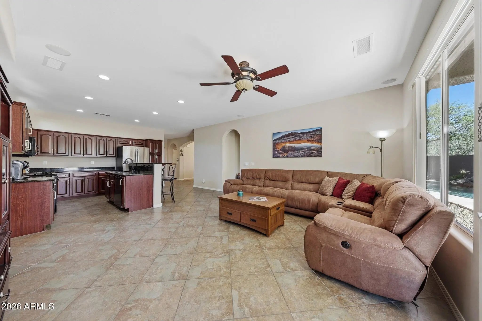 What a wonderful opportunity to live in one of the most desired communities within all of the North Phoenix corridor where active lifestyles meet modern-day convenience. Welcome to Tramonto, a premier amenity-rich master-planned community nestled in the scenic foothills of the beautiful Sonoran Desert, providing a connected, active and vibrant lifestyle surrounded by natural beauty. Scenic walking paths and neighborhood trails wind throughout the community, linking residents to expansive parks, open green spaces, playgrounds and a preserved natural wash that highlights the striking desert landscape. These tranquil pathways create the perfect setting for an evening stroll, morning jog, bike ride or simply enjoying Arizona's breathtaking sunsets with family and neighbors. *(Click More)* Residents enjoy two centrally located community parks in Tramonto East and Tramonto West, each offering resort-style amenities designed for year-round enjoyment. Community pools and soothing spas provide the perfect place to relax and cool off, while tennis courts, sand volleyball, basketball courts, playgrounds and wide grassy play areas offer endless opportunities for recreation and connection. Whether gathering for a picnic, watching children play, shooting hoops, or meeting friends at the park, Tramonto's thoughtfully planned amenities create a true sense of neighborhood spirit and welcoming spaces for families and neighbors to connect. Location and convenience further elevate Tramonto's appeal. With immediate access to I-17, Carefree Highway, Loop 303, and 101, commuting throughout the Valley is effortless. Three major retail destinations are within a short 10-15 minute drive, including the Outlets at Anthem to the North and The Shops at Norterra and Happy Valley Towne Center to the South, offering an impressive mix of shopping, dining, entertainment and everyday services. Enjoy wonderful eateries and local favorites such as Starbucks, Daisy Mountain Coffee Roasters, The Good Egg, Hot Bagels & Deli, Azool Grill, Connolly Sports Bar & Grill, In-N-Out Burger, Chili's, Hong Kong Asian Cuisine, Streets of New York, Plaza Bonita, making daily living easy and convenient. Outdoor enthusiasts will appreciate the nearby regional parks offering hiking, fishing, and boating, all just minutes away, including the highly desirable Lake Pleasant Regional Park. Located just a short 25-minute drive away, Lake Pleasant features more than 23,000 acres of open water set against unspoiled desert landscape and is widely regarded as one of the most scenic recreation destinations in the Valley. Residents enjoy endless opportunities for boating, kayaking, fishing, scuba diving, camping, stargazing, and off-roading, making it a true playground for adventure and year-round outdoor enjoyment. In addition, portions of the Phoenix Sonoran Desert Preserve border nearby neighborhoods, providing immediate access to some of the Valley's most breathtaking hiking and desert trails. Despite its peaceful, nature-rich setting, Tramonto remains exceptionally well connected, with convenient freeway access and Phoenix Sky Harbor International Airport approximately a 30-minute drive away. Positioned within one of the Valley's fastest-growing regions, Tramonto represents a compelling long-term investment opportunity, benefiting from continued North Phoenix expansion, employment growth and sustained demand for well-located master-planned communities. The North Valley has attracted unprecedented economic investment, highlighted by Taiwan Semiconductor Manufacturing Company's (TSMC) multi-billion-dollar expansion in North Phoenix, projected to bring thousands of high-paying jobs and significant supporting commercial development to the area. This surge in advanced technology and related industries continues to drive infrastructure improvements, retail growth and housing demand, reinforcing long-term property value potential. With its scenic desert backdrop, extensive amenities, exceptional retail and dining access, prime freeway connectivity and strong future growth outlook, Tramonto offers an outstanding lifestyle today with enduring value for tomorrow. The cozy front porch welcomes you into a thoughtfully designed interior that is light, bright, and open, blending character and quality finishes throughout. Beautiful oversized neutral tile flooring anchors the main living spaces, complemented by upgraded decorative baseboards, custom wood plantation shutters, raised-panel doors, charming arches, rounded corners, and thoughtfully placed art niches. Designer two-tone paint, along with upgraded lighting, ceiling fans, hardware and fixtures throughout, adds warmth and sophistication to every room. This well-designed single-level split floor plan offers both comfort and privacy, with the spacious primary suite thoughtfully positioned on one side of the home and the secondary bedrooms situated toward the front -- creating an ideal separation for guests or family living. The floor plan is spacious yet efficient and combines quality and elegance, perfect for entertaining or a quiet night at home. The great room is cheery, airy, and warm with abundant natural lighting, high plate ceilings and walls of scenic glass inviting the outside in, creating an incredible extension of living space to this fabulous floor plan. Love to cook? Enjoy preparing memorable meals in the open-concept chef's kitchen featuring gorgeous raised-panel maple cabinetry, solid granite slab countertops and backsplash, a huge breakfast bar/prep island with upgraded undermount double sinks and garbage disposal and wonderful pantry space. The upgraded black-on-black appliance package comes complete with a four-burner gas range, built-in microwave and GE Profile refrigerator. The kitchen area includes abundant counter space and cabinetry, along with an impressive number of conveniently placed outlets -- exactly what every cook appreciates. The formal dining area includes a gorgeous chandeli