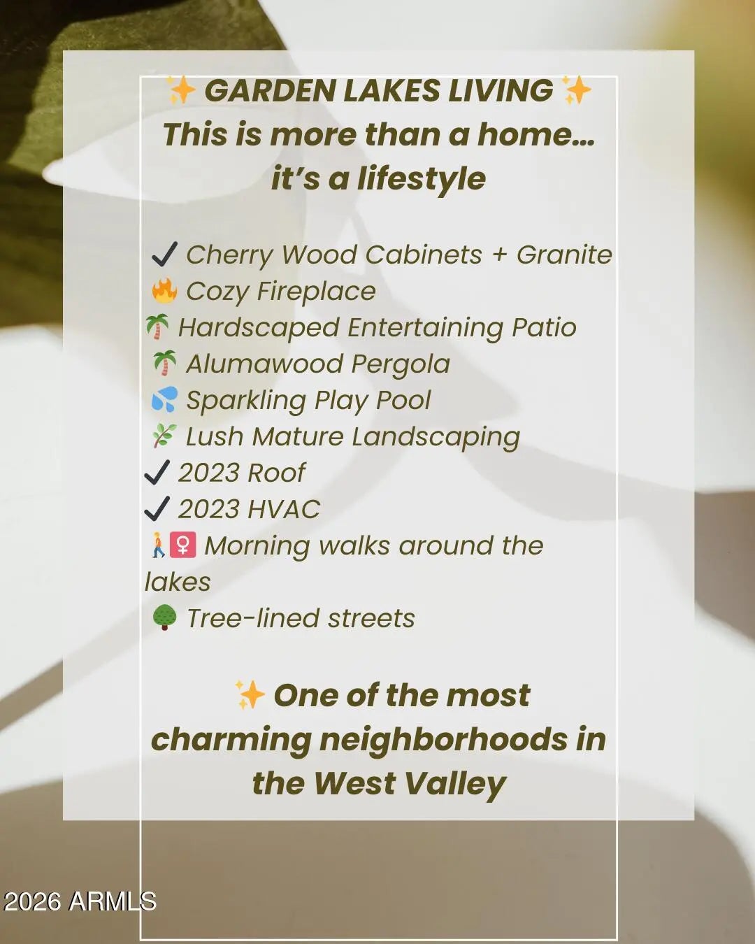 Welcome to the beautiful lake community of Garden Lakes, one of Avondale's most sought-after neighborhoods known for its tree-lined streets, walking paths, and peaceful lakeside setting. Situated on a corner lot with incredible curb appeal, this charming home offers 3 bedrooms, 2 bathrooms, and approximately 1,700 square feet with a spacious layout that includes both formal living and dining areas plus a separate family room with soaring ceilings. Inside, the home has been lovingly updated with rich solid cherry wood cabinetry and granite countertops in both the kitchen and bathrooms, creating a warm and timeless feel. Custom shutters grace the front rooms, while a cozy fireplace with an electric insert provides the perfect place to unwind. Step outside to your own private backyard retreat. The beautifully landscaped yard features a sparkling play pool, an expansive hardscaped patio, and a durable Alumawood pergola designed for year-round outdoor living. A grassy side yard and mature landscaping create additional space for play, pets, or gardening. One of the standout features of this home is the rare 3-car garage, a feature seldom found in homes at this price point and ideal for storage, hobbies, or extra vehicles. With gorgeous landscaping, thoughtful upgrades including a new roof and new HVAC in 2023, a resort-style backyard, and access to the scenic lakes and walking paths of Garden Lakes, this home offers the perfect blend of comfort, lifestyle, and location.
