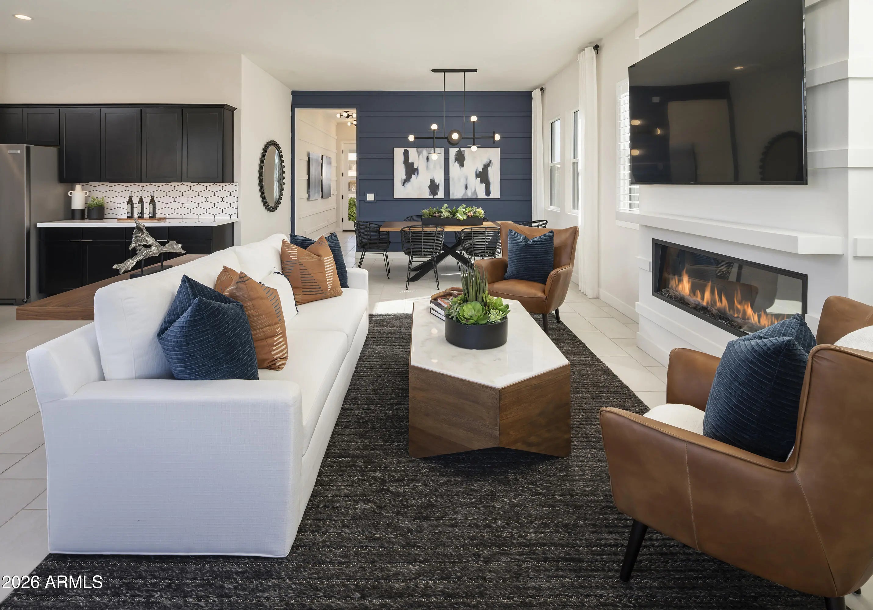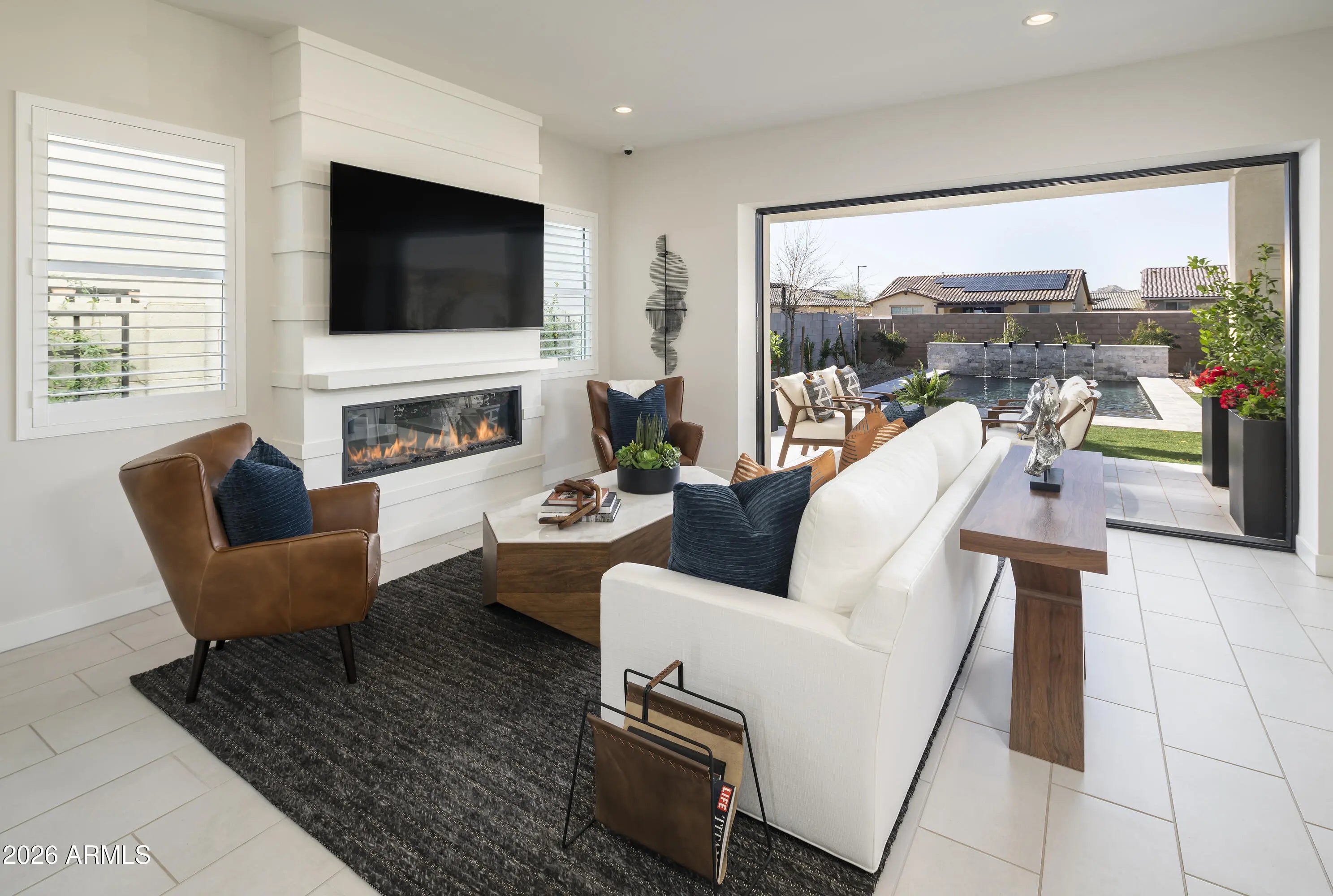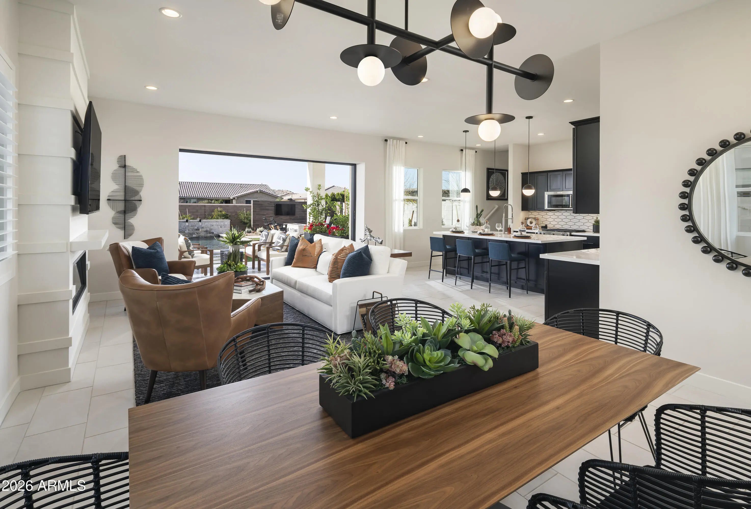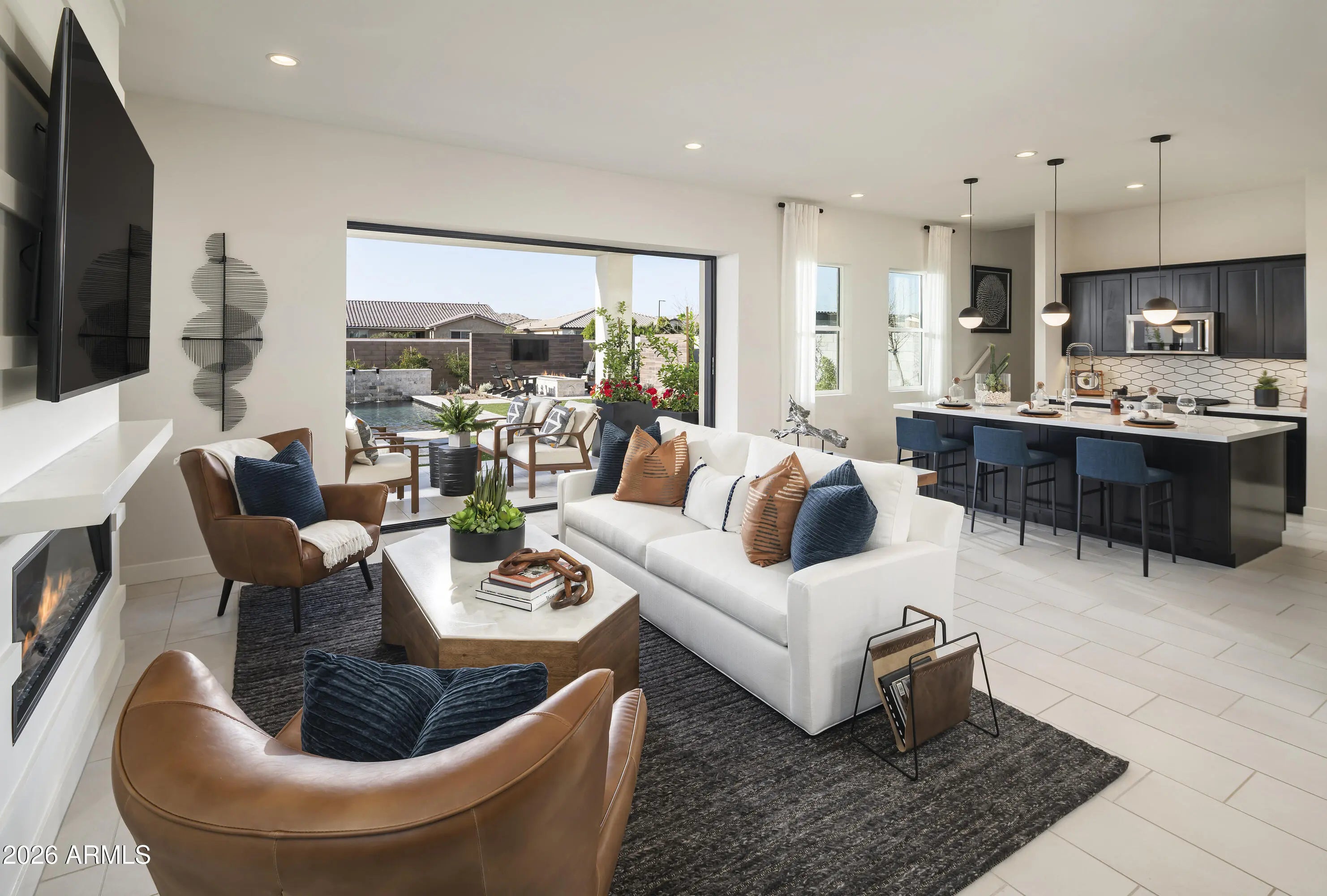 Step into our stunning model home--fully furnished, professionally decorated, and beautifully landscaped for a true luxury experience. This modern home features 10' ceilings on the first floor, quartz countertops, KitchenAid appliances, a spacious loft, and a dedicated home office. Enjoy seamless indoor-outdoor living with a multi-slide stacking pocket door, plus a resort-style pool, outdoor gas fire pit, and an electric fireplace in the great room. The primary suite includes a spacious walk-in closet.