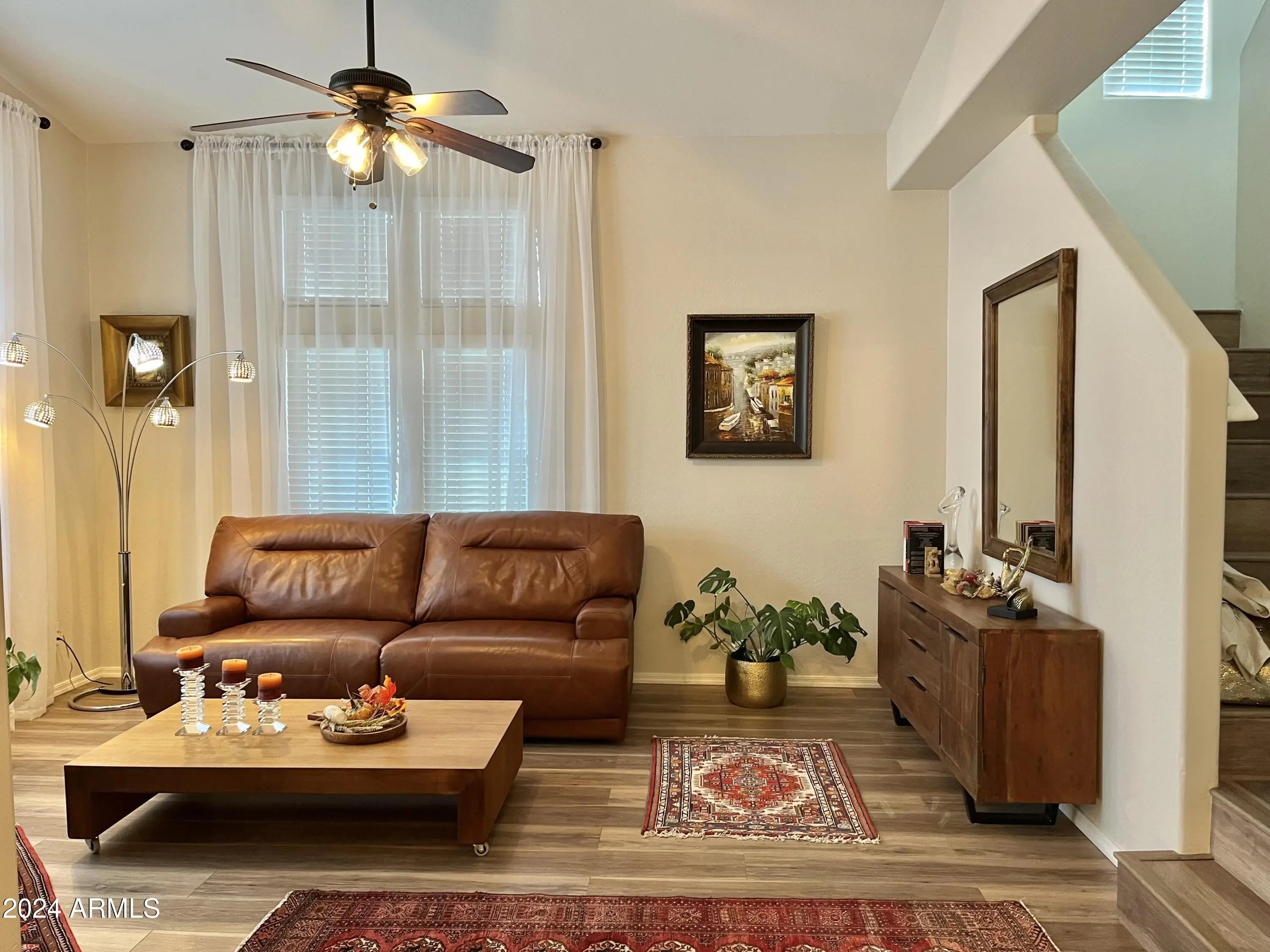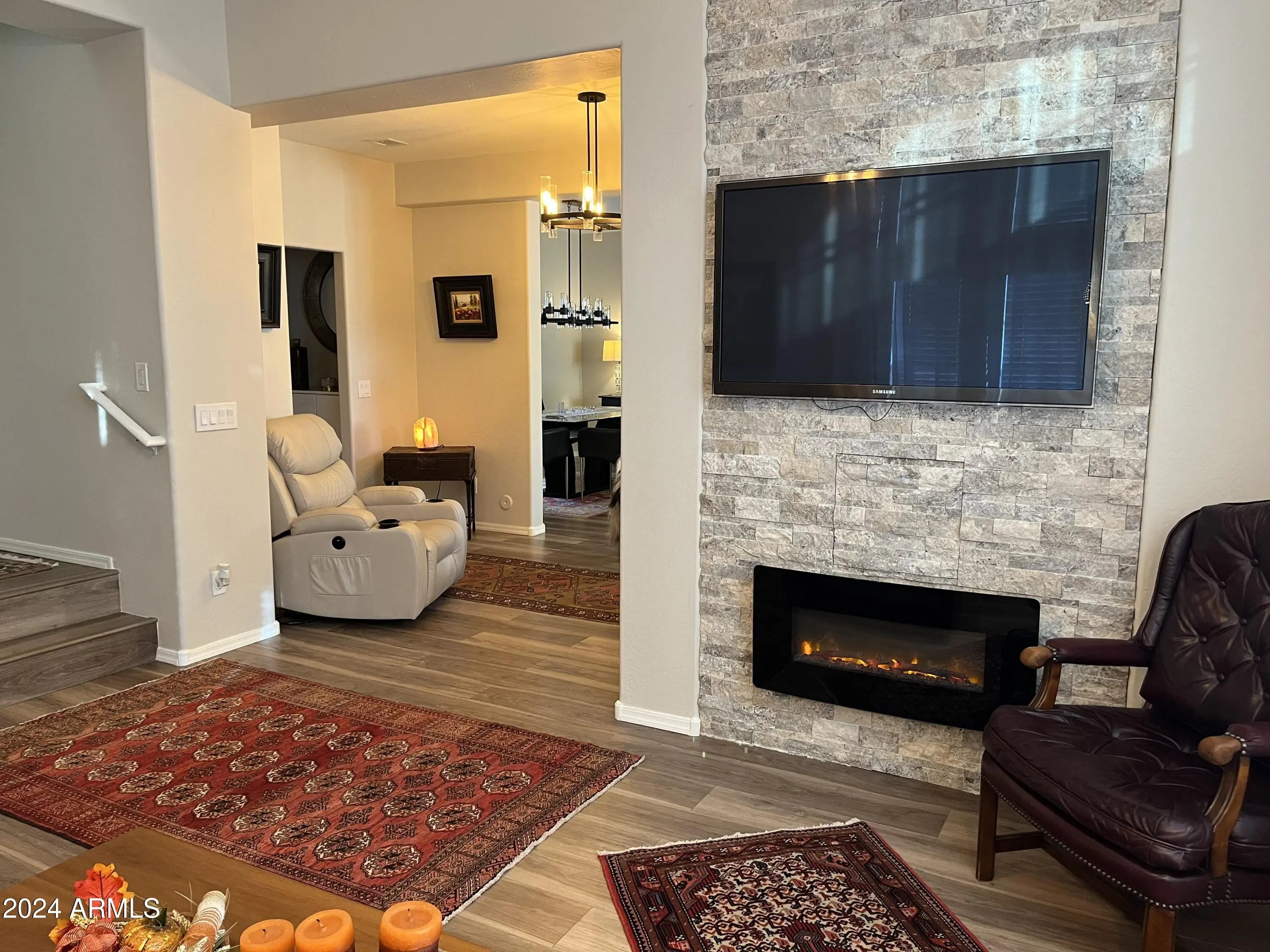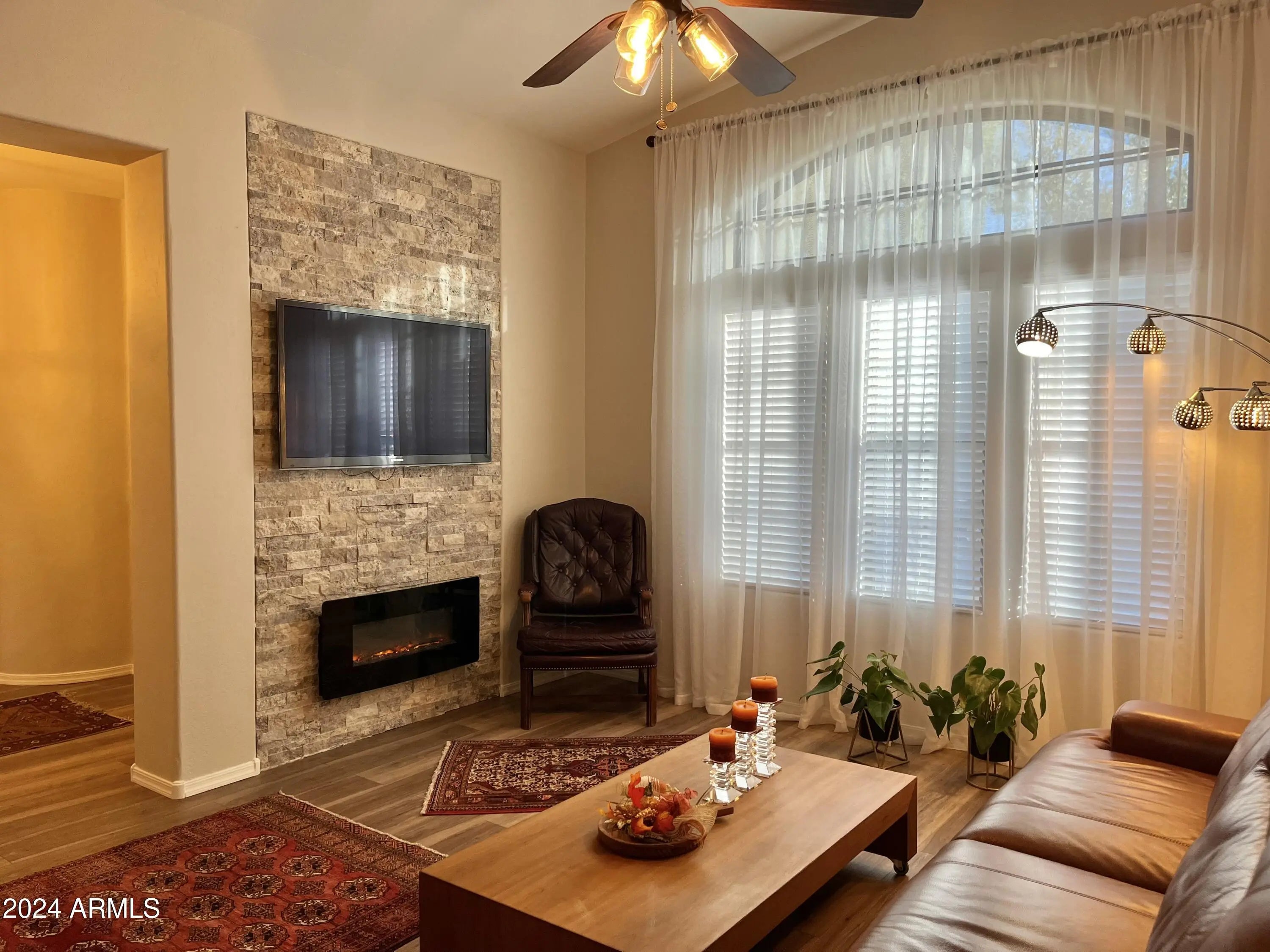 Beautifully remodeled 3-bedroom, 2.5-bath home in the gated Sonoran Foothills community in North Phoenix. Features include a 2-car garage, low-maintenance yard , new laminate flooring (no carpet), fresh paint, and an electric fireplace. The modern kitchen offers granite countertops, backsplash, island, and newer stainless-steel appliances, opening to the dining and living areas. Upstairs primary suite includes a private balcony, walk-in closet, and upgraded bath with marble flooring, dual sinks, soaking tub, and walk-in shower. Secondary bath also features marble flooring and an updated vanity. Laundry conveniently located upstairs. Prime location near Norterra with easy access to I-17, Loop 303, and the growing tech corridor, including TSMC.