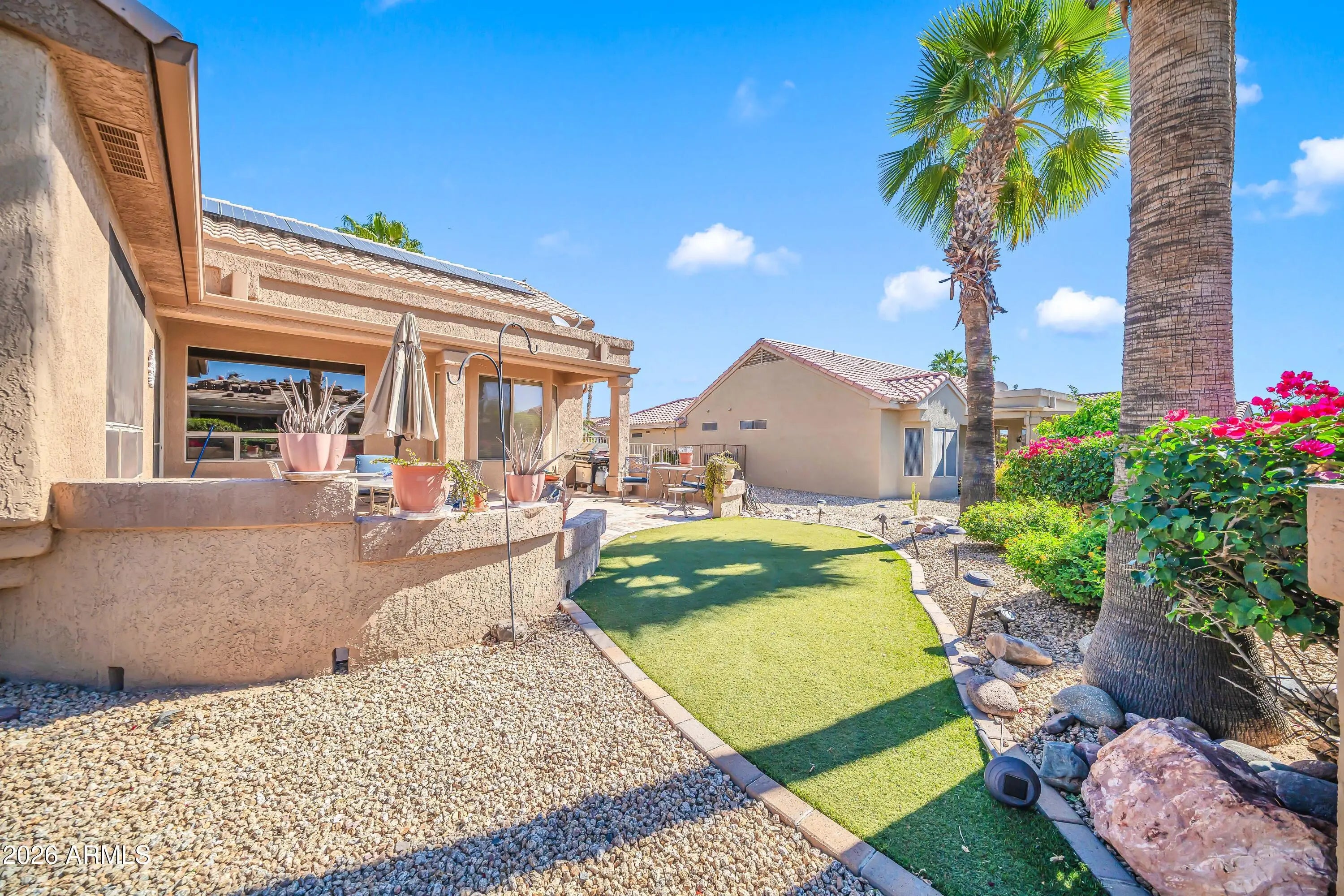 Beautiful 3 bedroom, 2 bathroom home in the Desert Sage neighborhood of Sun City Grand. This home features a formal living room and dining room plus a bright, open great room with fireplace. The kitchen offers a breakfast bar and all appliances are included. Spacious primary suite with huge walk-in closet, dual sinks, private toilet room, garden tub, and a beautiful tile/stone walk-in shower updated about 5 years ago. Garage is built to accommodate a golf cart. Solar through Sunrun and upgraded appliance package for the AC units is transferable. Seller is including a home warranty up to $700. Furniture available on a separate bill of sale. Gray recliner with foot stool and circular fire pit do not convey