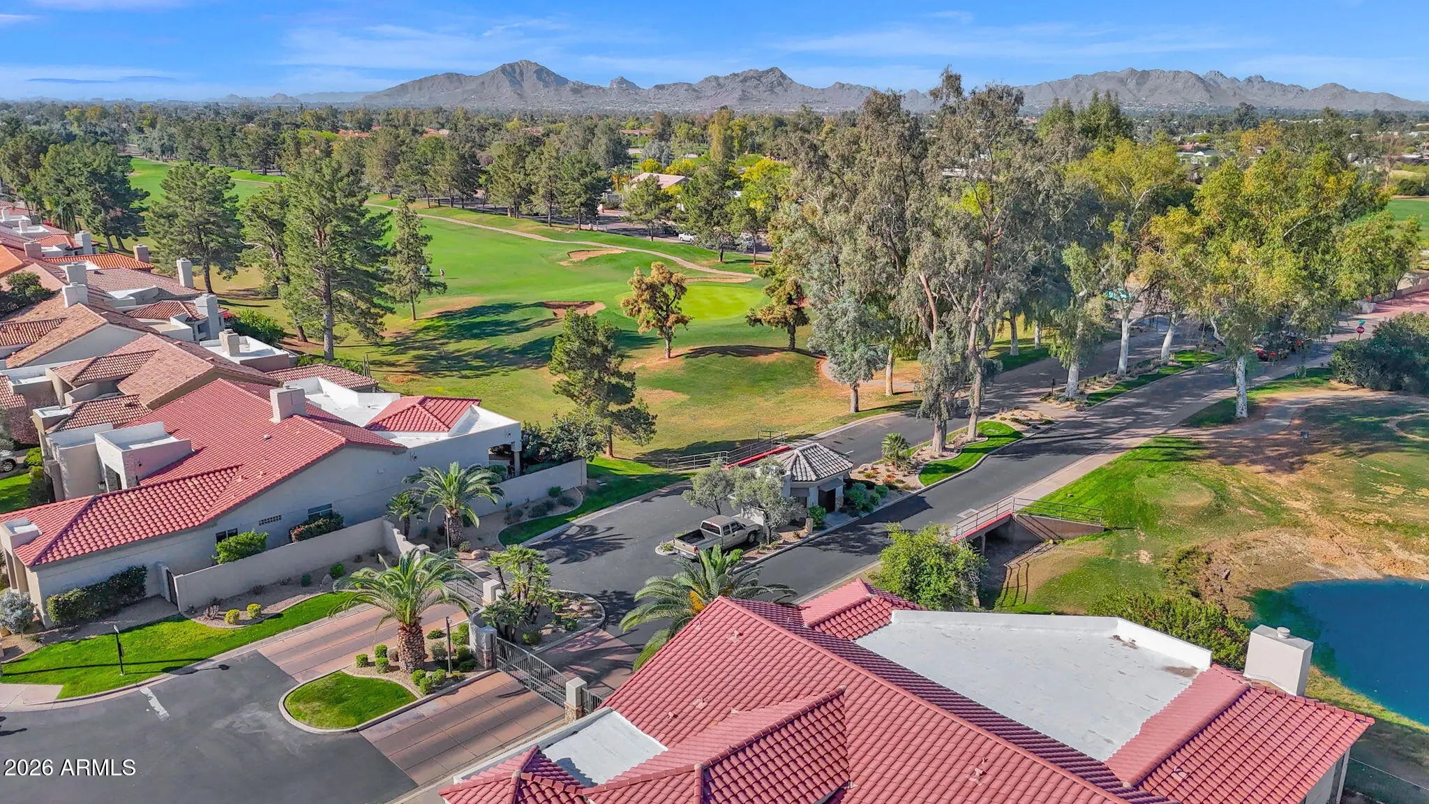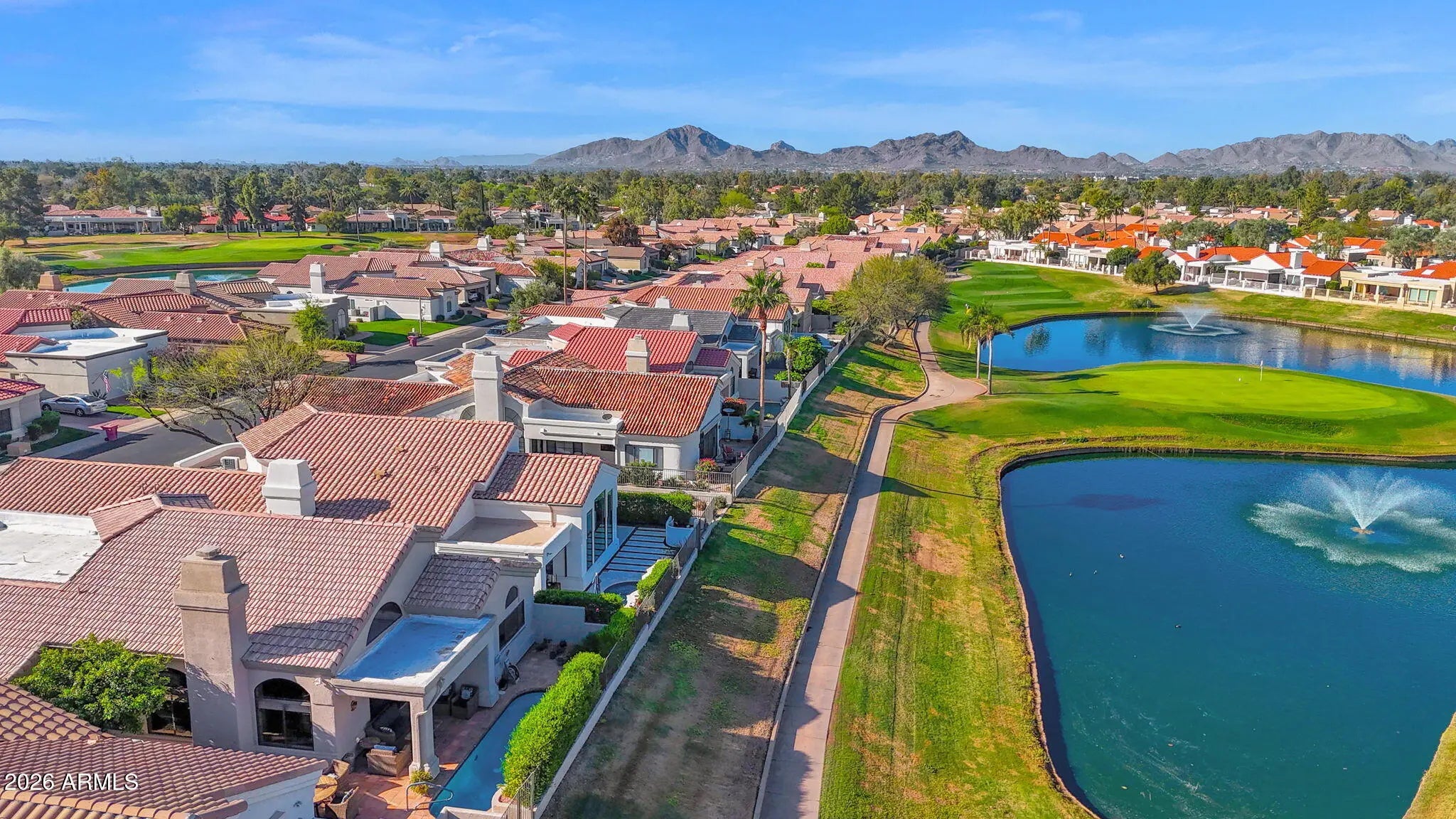 Located within the highly sought after guard-gated community of Scottsdale Country Club. Overlooks the fountain and lake on the 4th hole, with McDowell Mountain views. With soaring 14+ foot ceilings in the Great Room, the open concept floorplan has split bedrooms and abundant natural light. Pride of ownership is evident in this home, which blends contemporary elements with western charm. The stylish kitchen boasts granite c/tops and a farmhouse sink. The comfortable family room offers a wood burning fireplace (with electric option) and a fun built in shelving unit. Master bedroom suite provides a spa-like feel with a double vanity, glass shower enclosure, premium faucets and fixtures. North facing yard has a pool and covered patio to take full advantage of of Arizona's desirable indoor-outdoor lifestyle. Across from the heated community pool/spa/tennis courts. Close to Kierland, Scottsdale Quarter, shopping, dining, resorts, golf courses & all Scottsdale has to offer. Perfect for both a full time resident or exceptional lock and leave lifestyle. Available furnished.