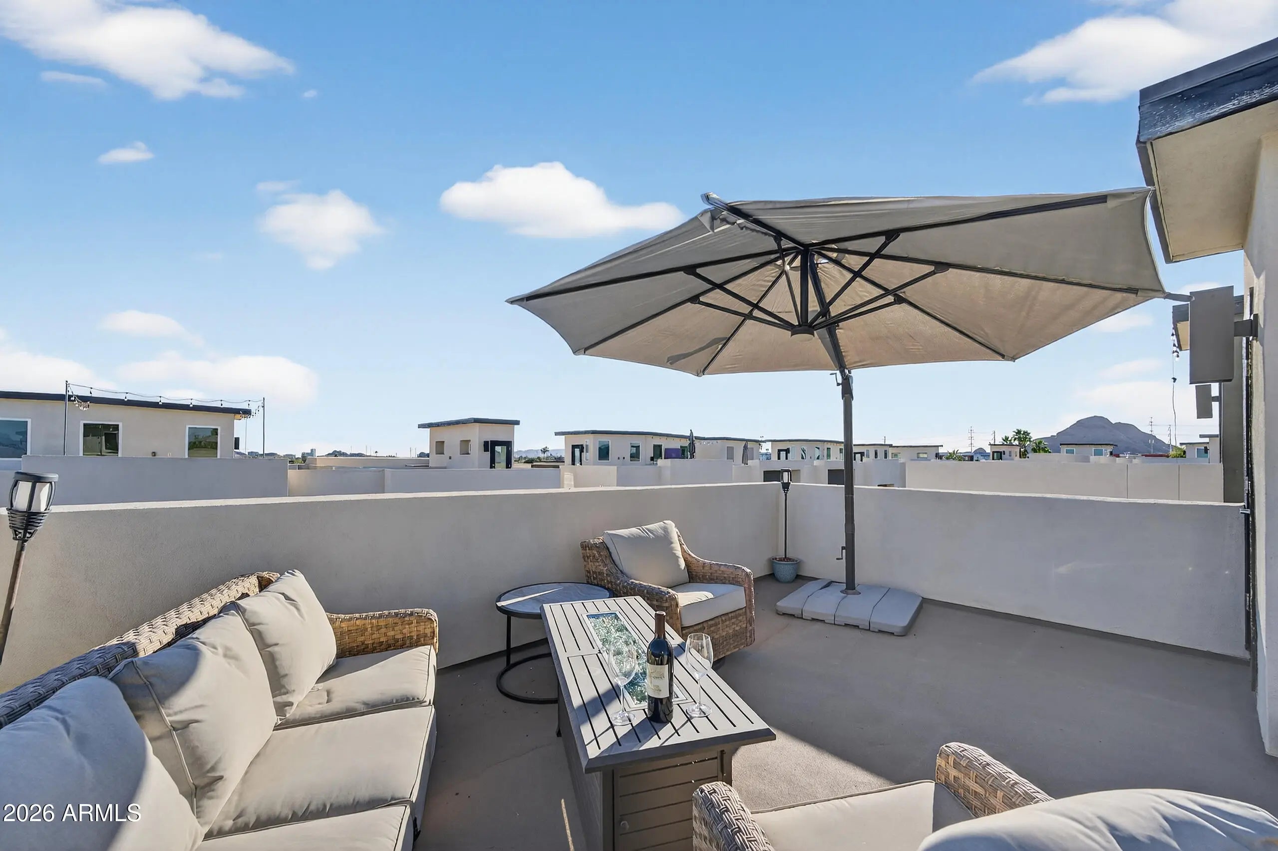 RARE Interior end-unit (WITH rooftop deck) in the highly desired Aire on McDowell. Move in ready! This meticulously maintained townhome offers 1,883 square feet of modern living space (including 10-ft ceilings) and is highlighted by a private panoramic rooftop deck (360 degree views of Camelback, Papago Buttes, Four Peaks, and more) The ground level includes a versatile bonus room along with a private patio, tankless water heater, and direct access to the attached two car garage. Upstairs, the primary suite offers a walk-in closet and a spa-inspired bathroom. Two additional guest bedrooms and a full bathroom provide flexibility for guests or home office. Prime location! Minutes from world class shopping in Old Town Scottsdale, restaurants, hiking, and Sky Harbor. THIS WON'T LAST