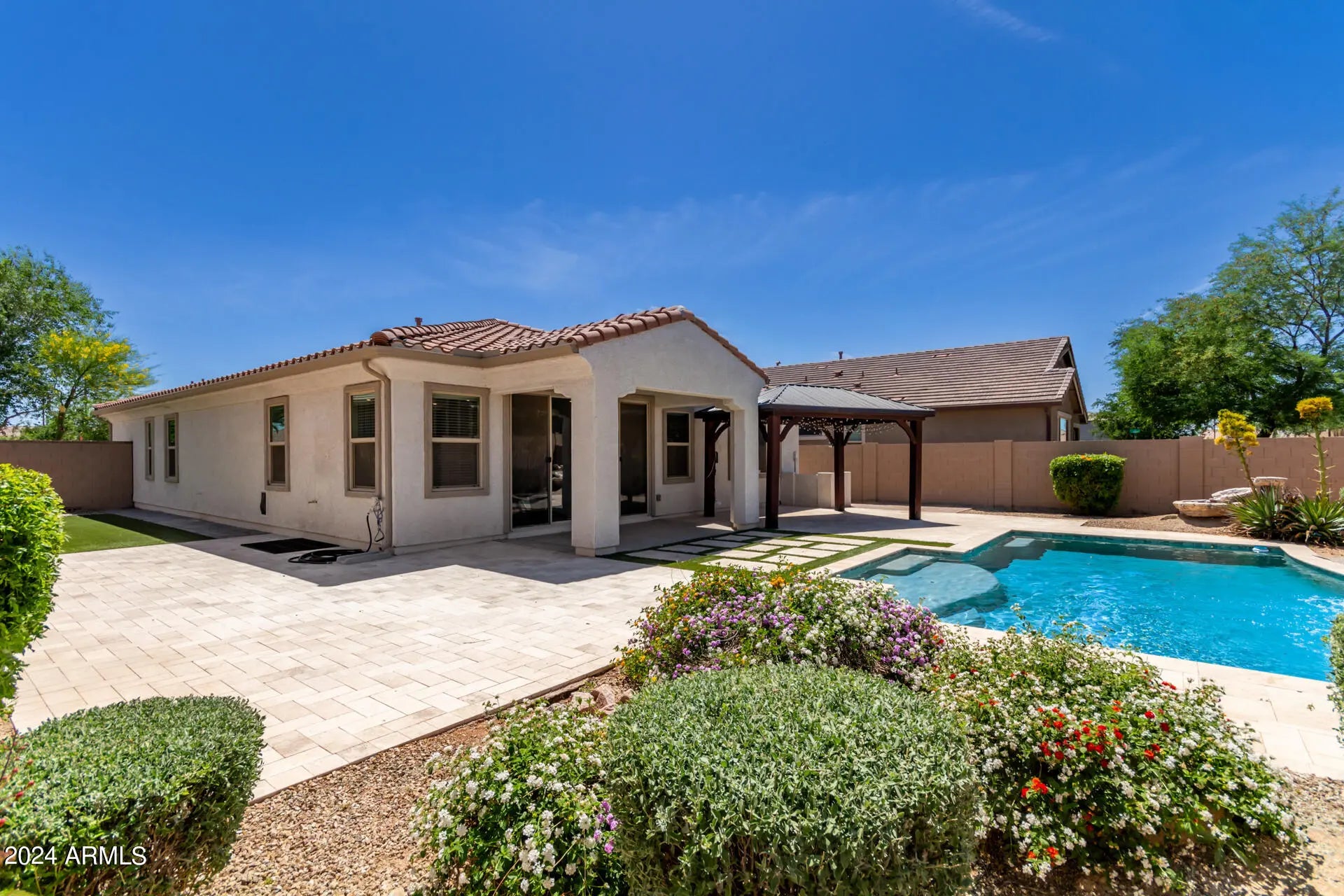Beautiful single-level home featuring three bedrooms and two bathrooms, complete with a stunning backyard oasis. The main living areas showcase elegant tile flooring, while the bedrooms offer cozy carpeting. Enjoy a spacious family room that flows into the dining area and a well-appointed kitchen with a breakfast bar, sleek granite countertops, and stainless-steel appliances. The primary bathroom includes a built-in vanity, and both bathrooms are finished with granite counters. Step outside to a backyard designed for relaxation and entertaining, featuring a covered patio, Ramada, tiled surfaces, and a sparkling pool with a waterfall feature. The community offers fantastic amenities, including a full-size basketball court, expansive greenbelt, playground, and pool area. This is a truly beautiful home in a desirable location, one you won't want to miss!