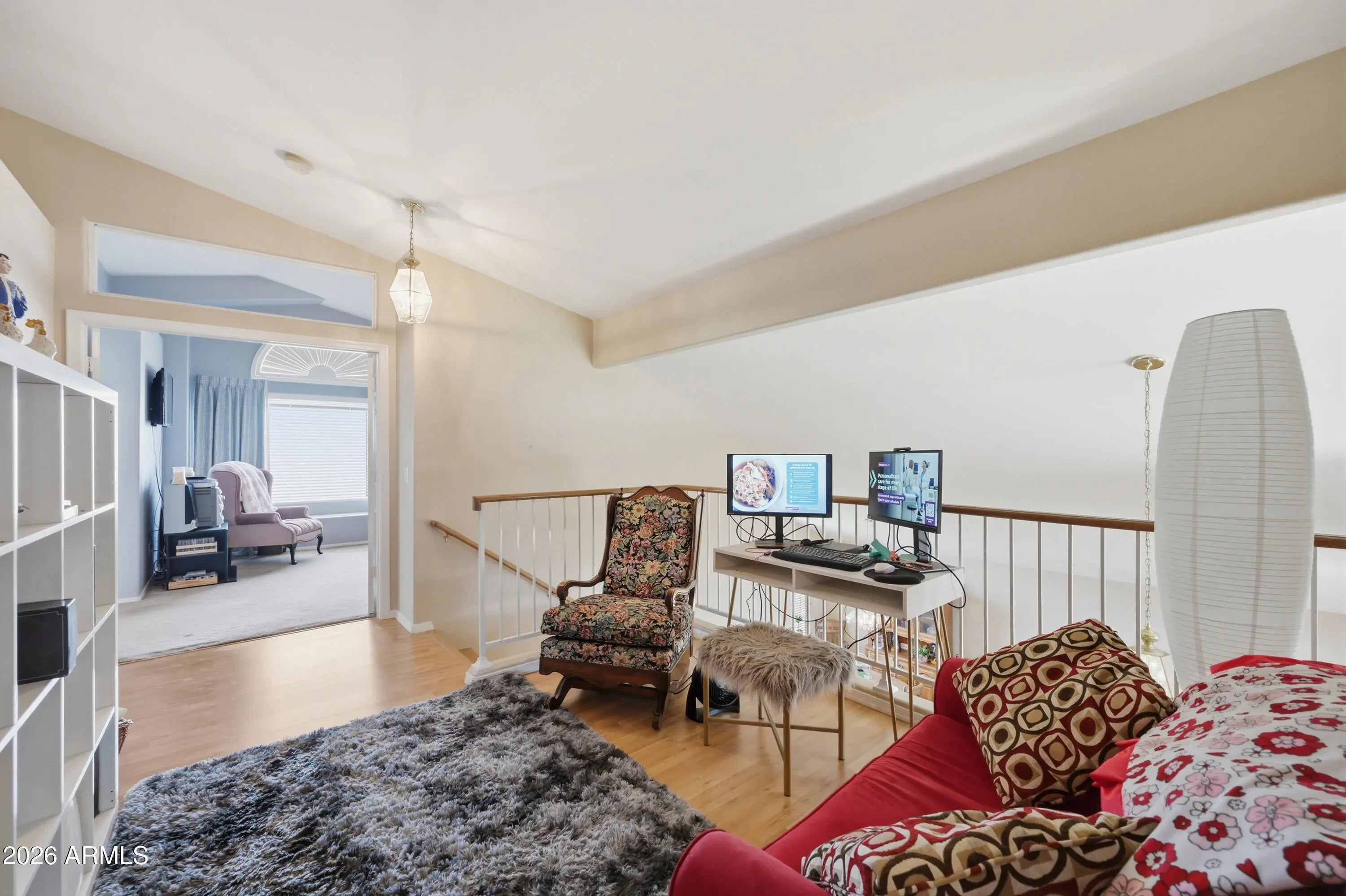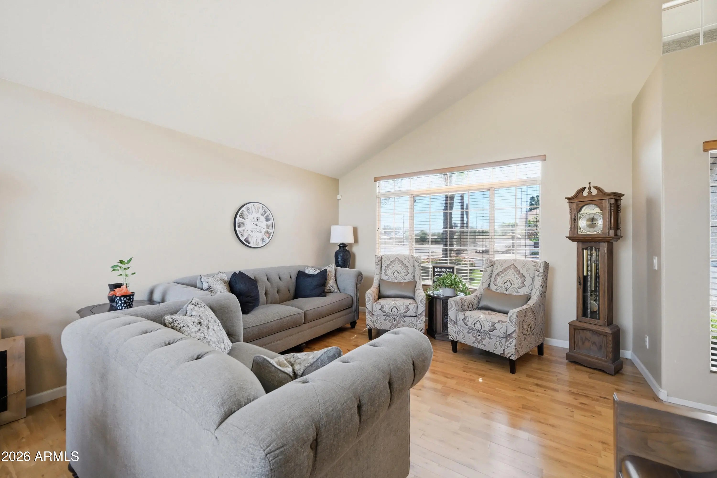 Positioned in a prime Peoria location near the Peoria Sports Complex, this 4-bedroom, 3-bath home delivers space, style, and convenience without the congestion. Step into a grand front living area with soaring vaulted ceilings and rich real wood flooring that immediately sets the tone. The kitchen is outfitted with granite countertops and opens seamlessly to the main living spaces. A dedicated downstairs office and expansive upstairs loft offer flexibility for work and lifestyle. Outside, enjoy a large grass backyard and covered patio built for entertaining. Quick access to Loop 101 and no HOA complete this exceptional opportunity.